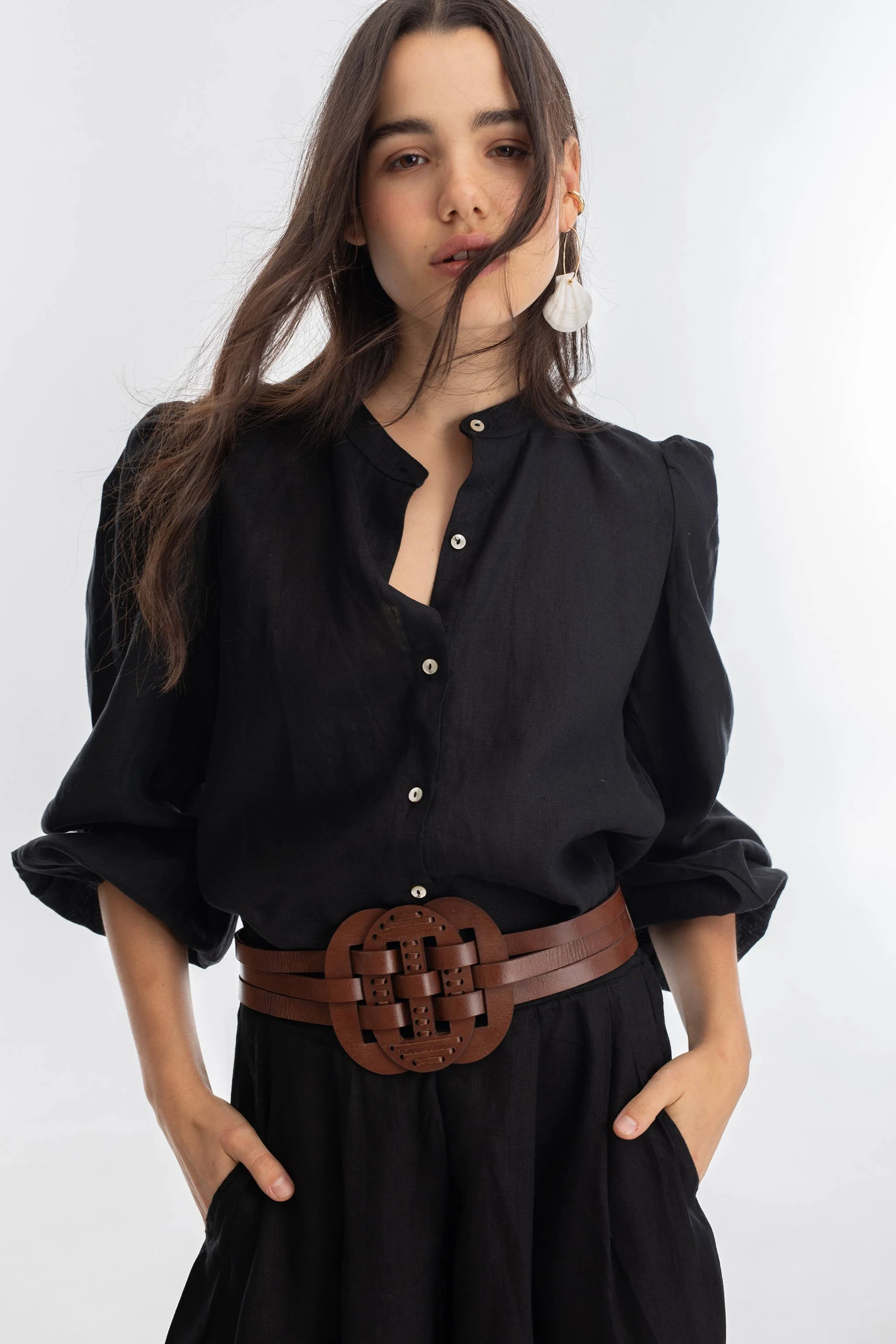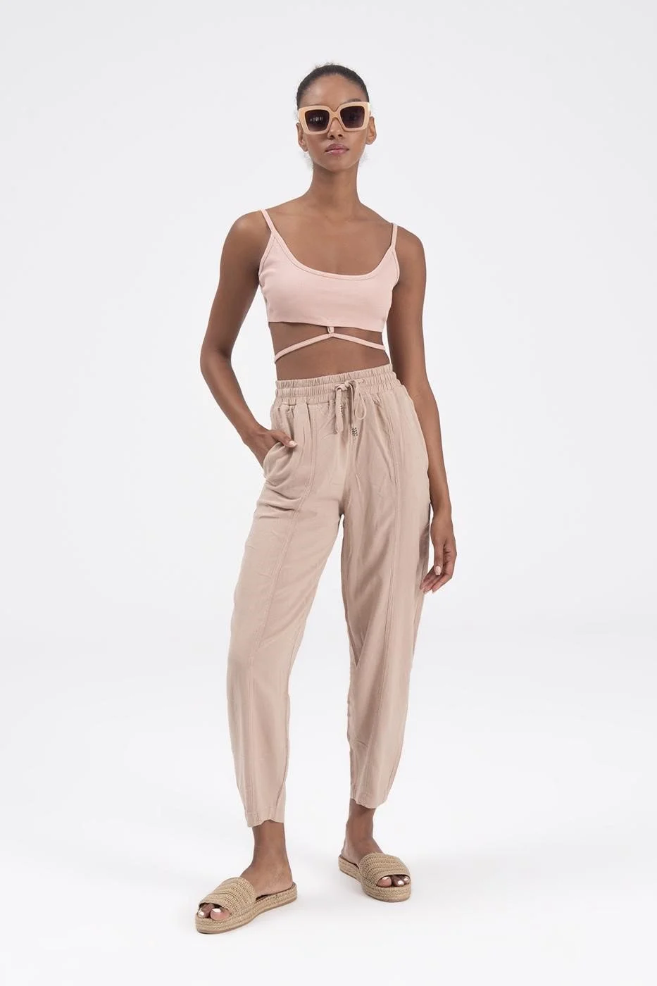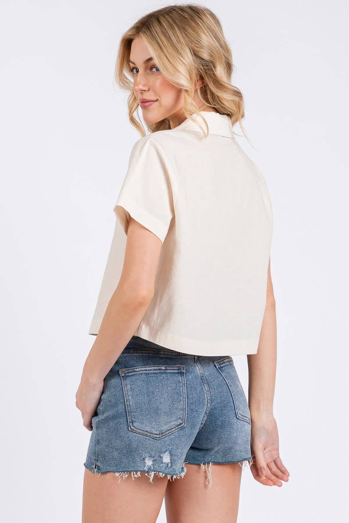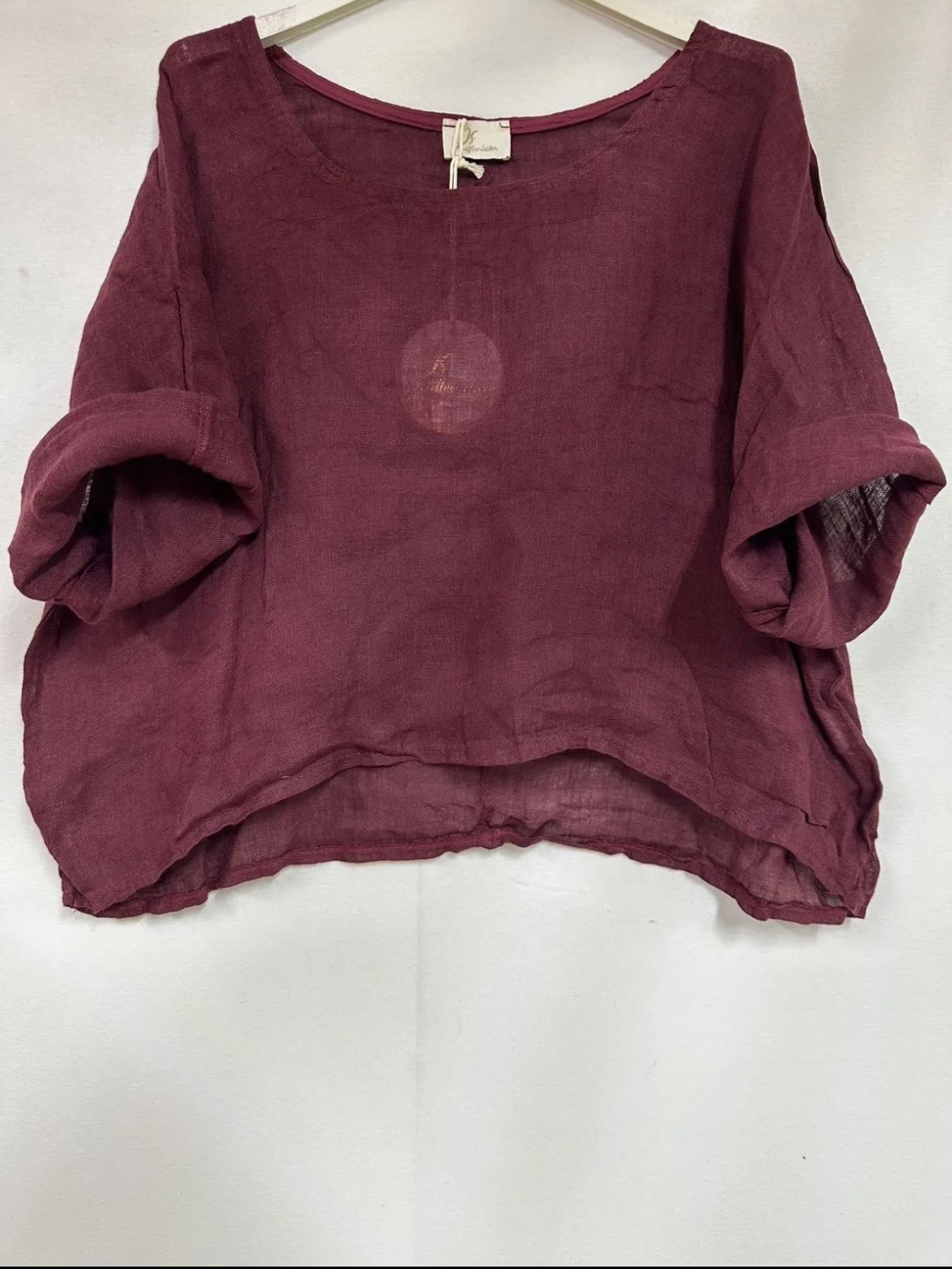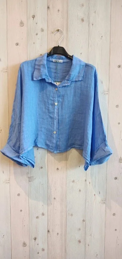 LINEN CROP TOP WITH EXTENDED SLEEVE AND ASYMMETRICAL WRAP-BACK DETAIL