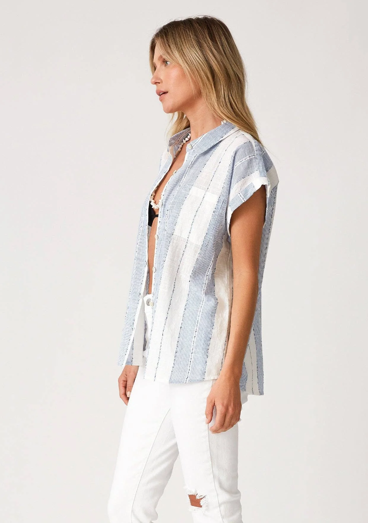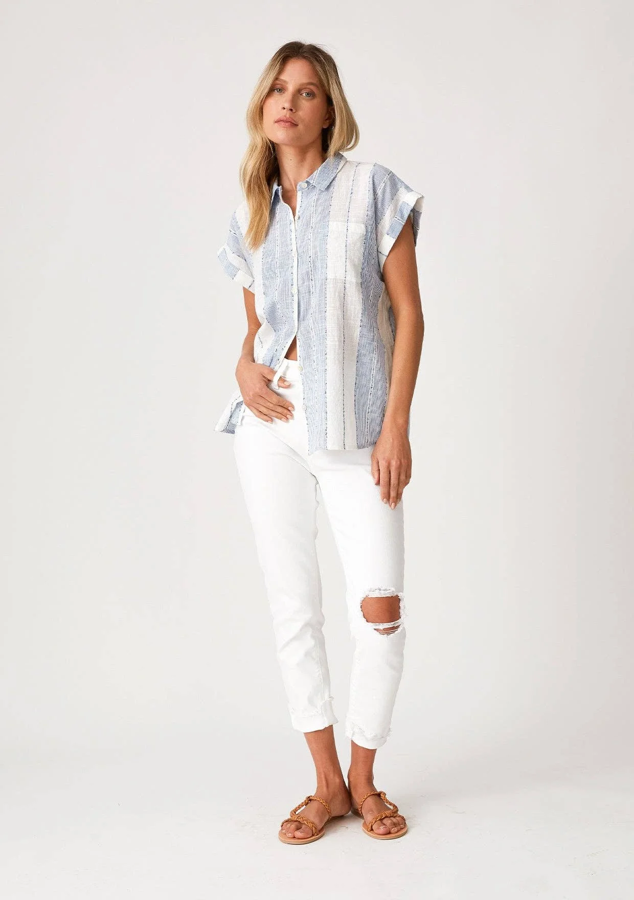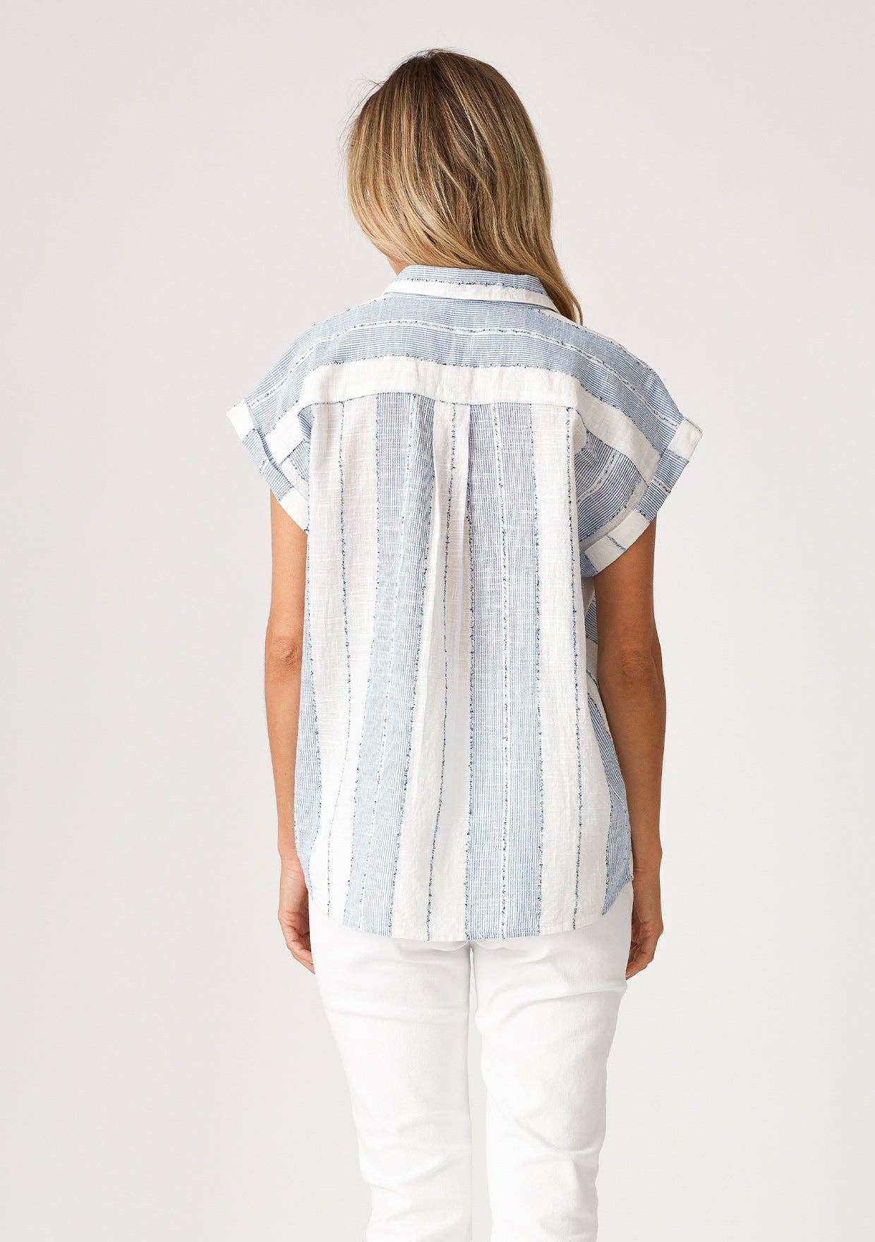 Stripe Button Down Short Sleeve Collared Blouse: White/Blue, L