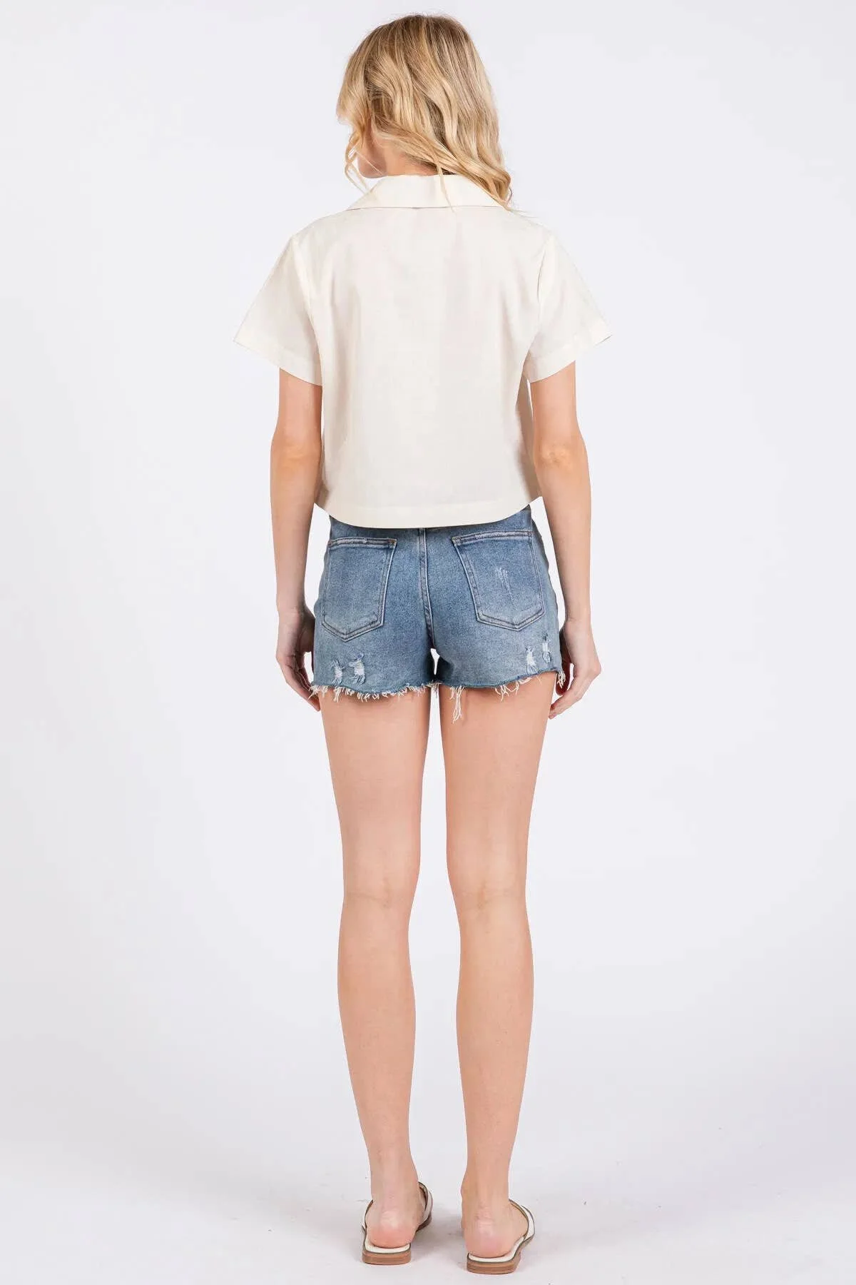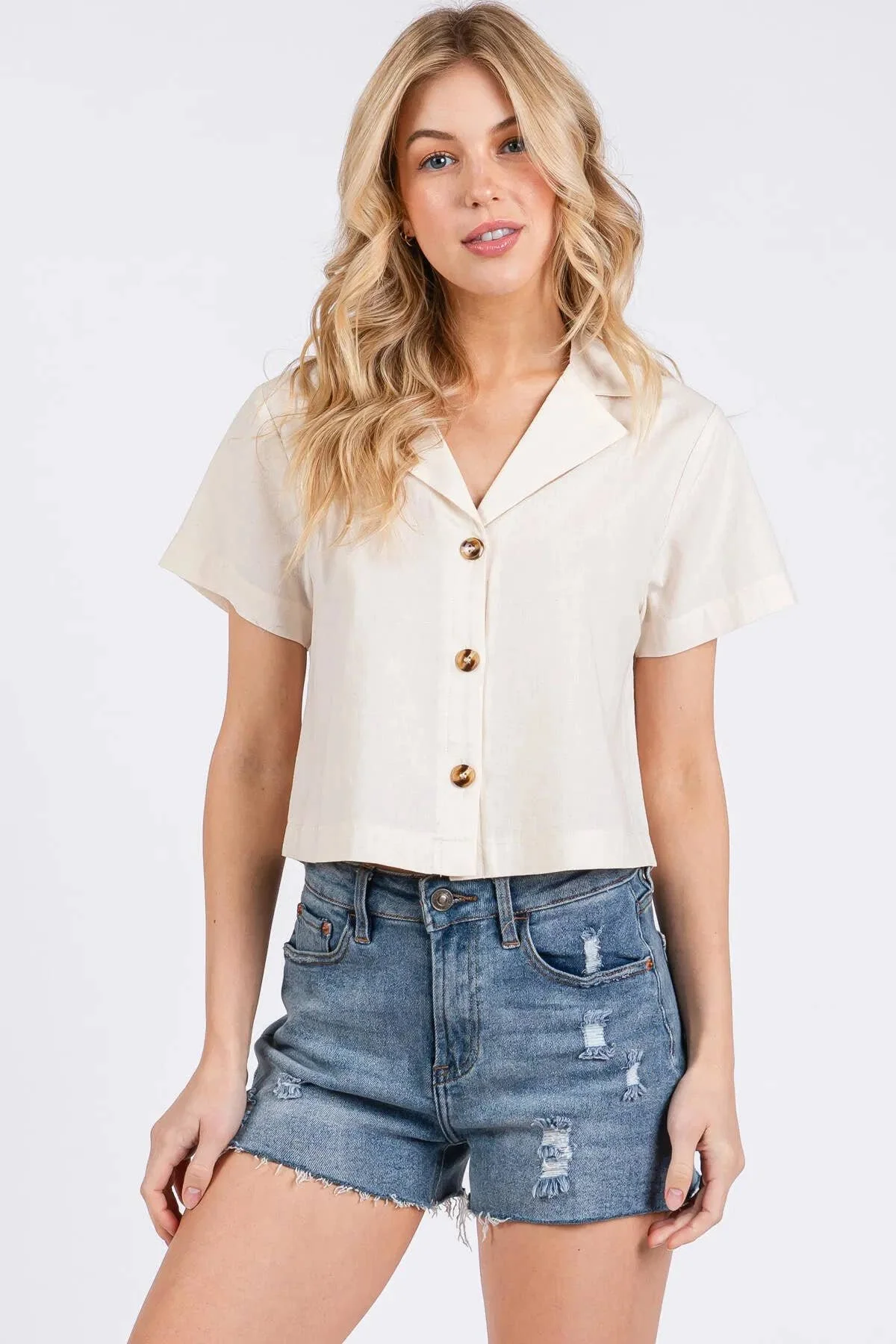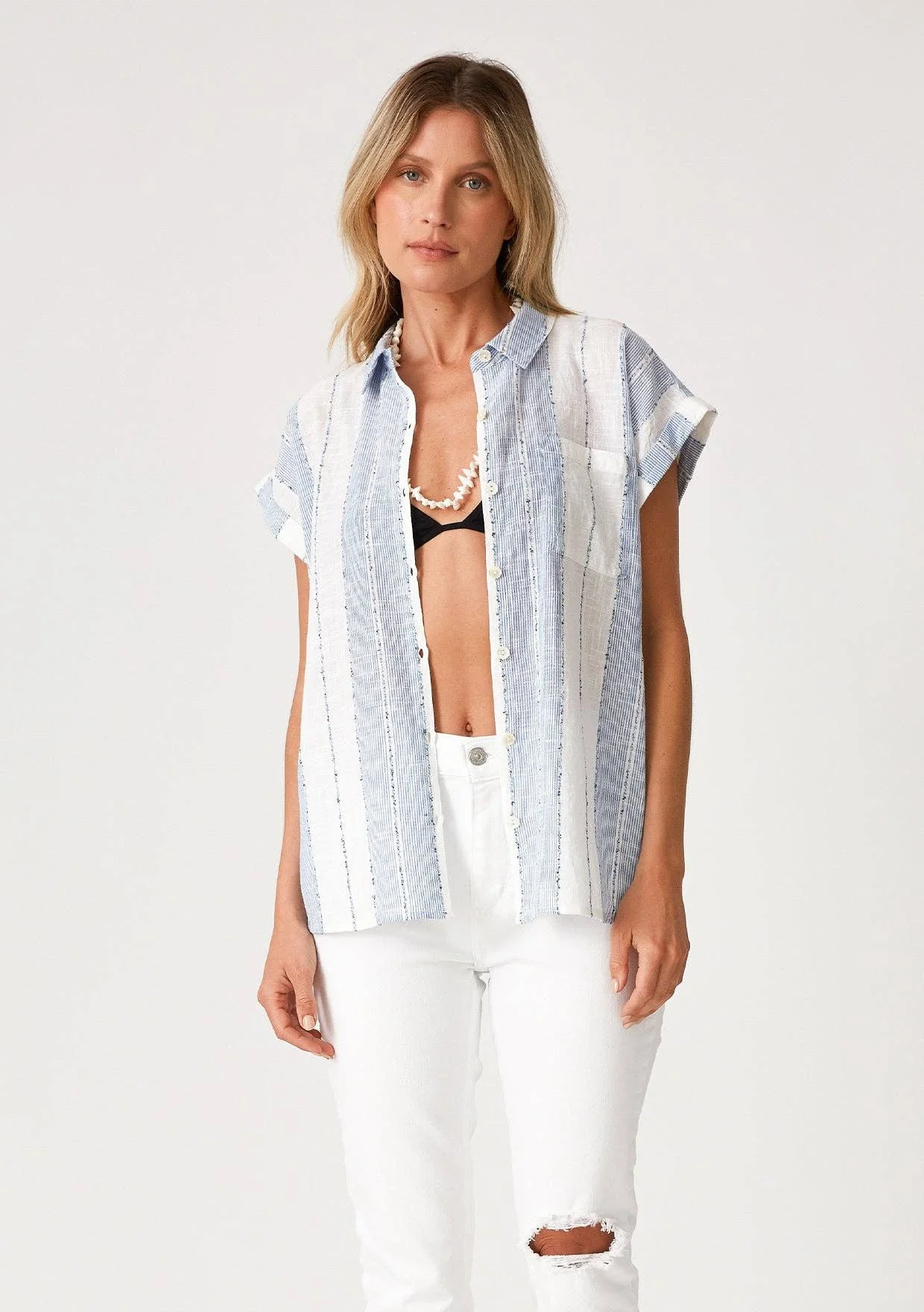 Stripe Button Down Short Sleeve Collared Blouse: White/Blue, L