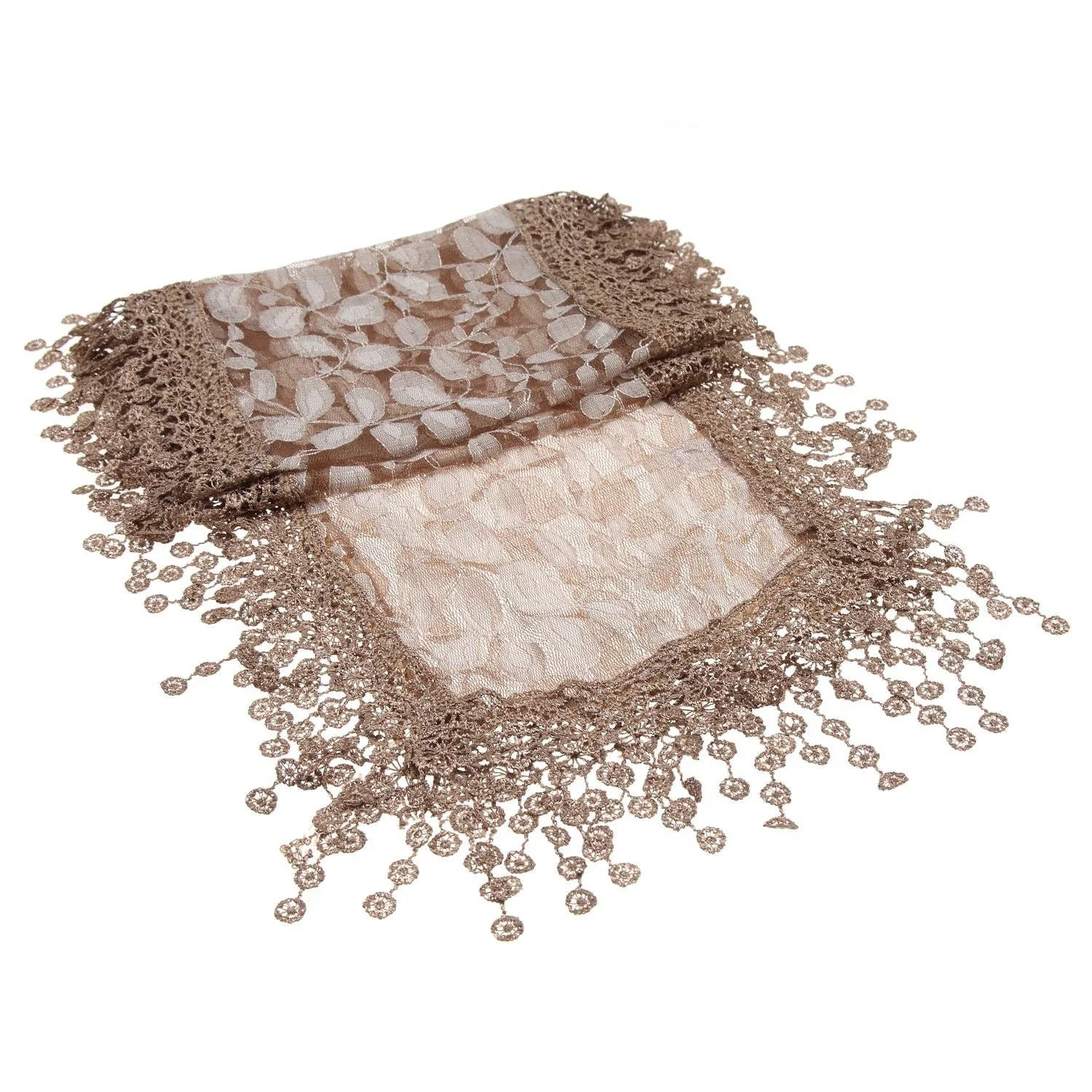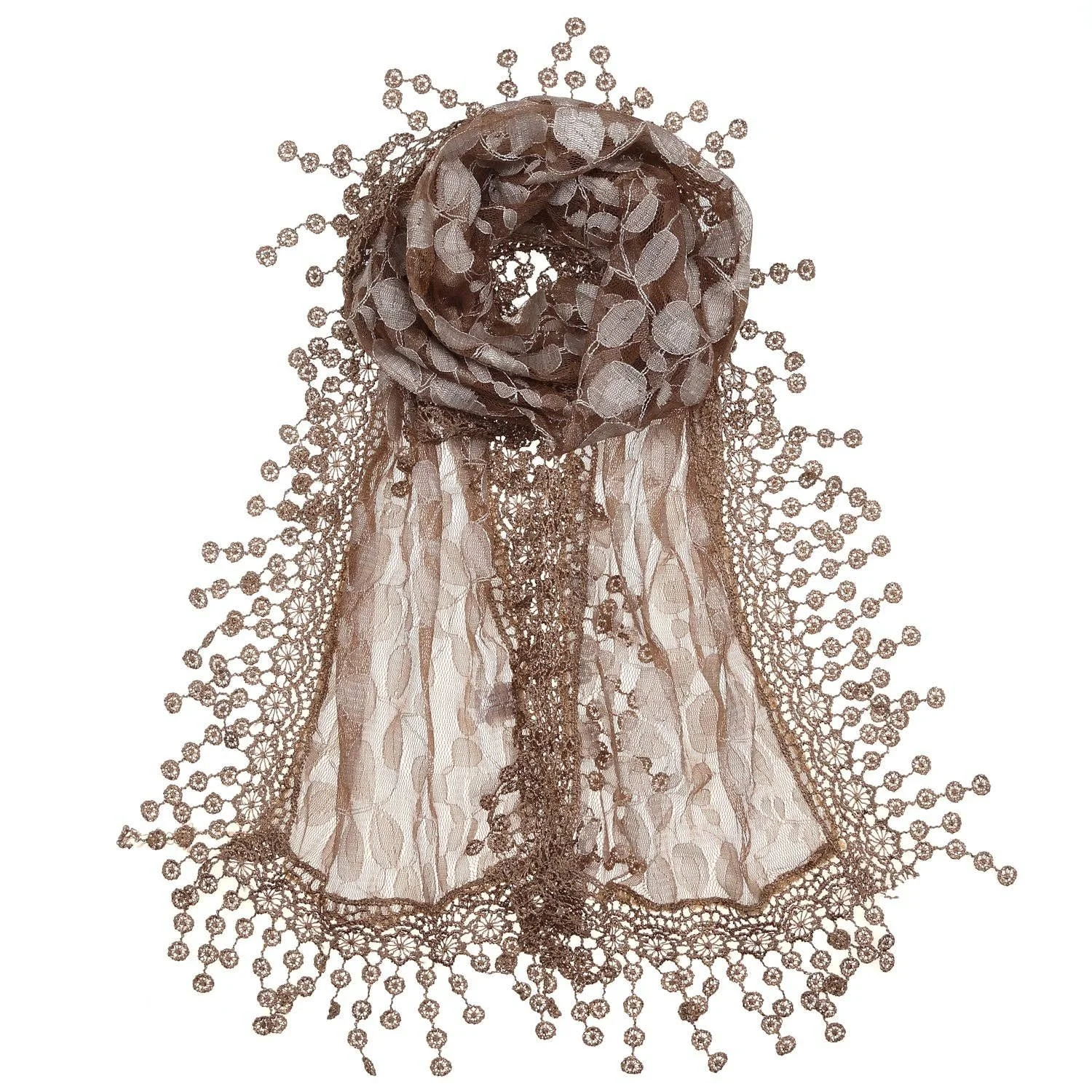 BROWN-One Piece Leaf Pattern Lace Scarf with Tassels