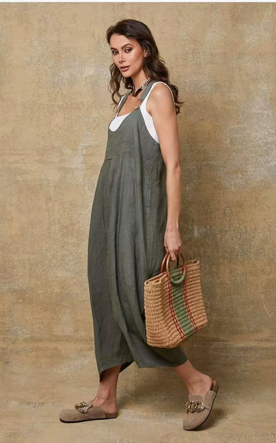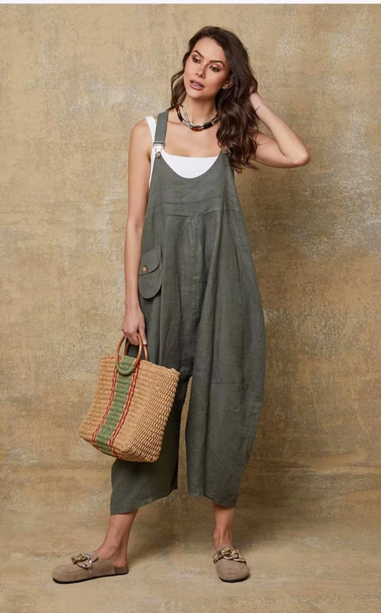 100% linen jumpsuit in a bohemian and relaxed style offers a loose and fluid fit for optimal comfort. Featuring adjustable straps with metal buckles and a buttoned side pocket, it combines practicality and elegance. Its slightly asymmetrical hem enhances its modern look. Ideal for a casual chic look, it pairs easily with a fitted top and light shoes.