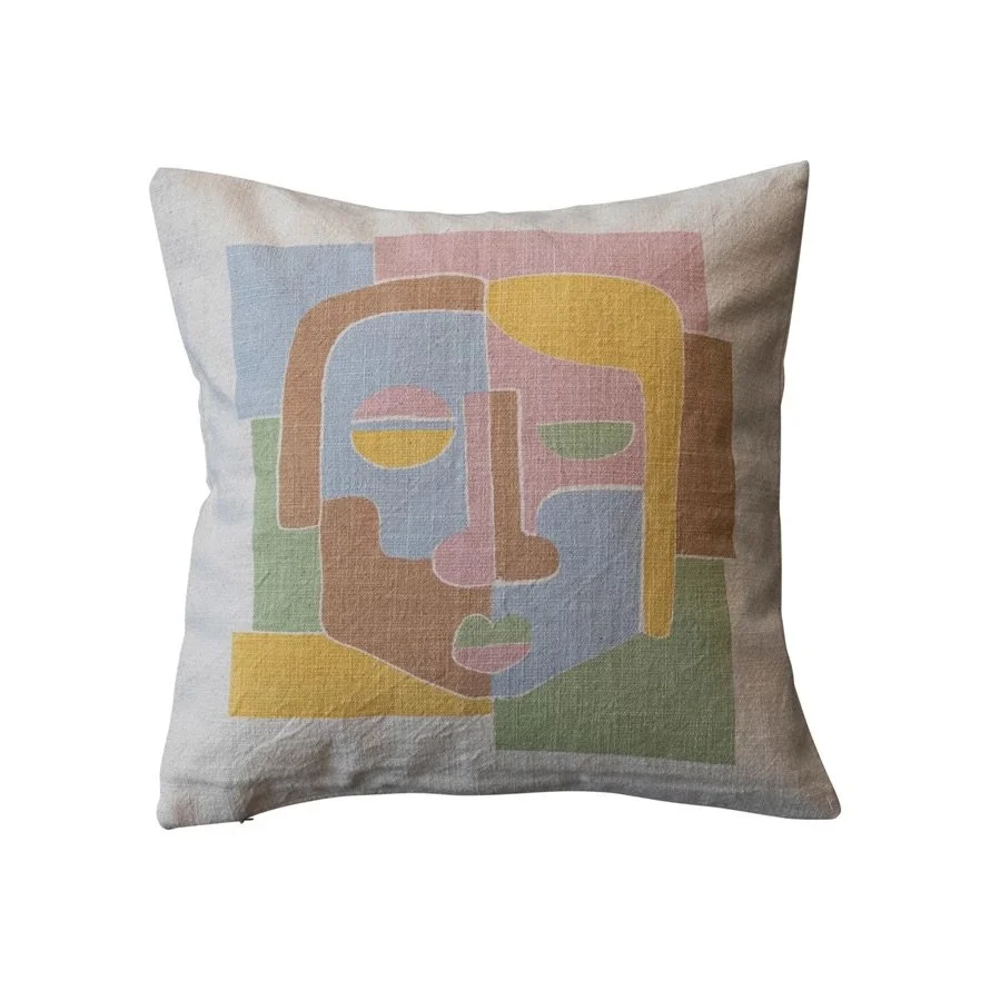 Product Description This woven cotton slub printed pillow with an abstract face is a beautiful and playful accessory for the home. It has a woven cotton slub cover that is durable and textured. The cover features a printed abstract face design that adds personality and charm to the space. The design is inspired by art and expression and has a variety of colors that create a cheerful and vibrant look. The pillow has a polyester insert fill that is soft and cozy. Use this pillow as a backrest, a headrest, or a decorative accent. Place it on the sofa, bed, chair, or bench, and mix and match it with other pillows to create a cozy and artistic look.