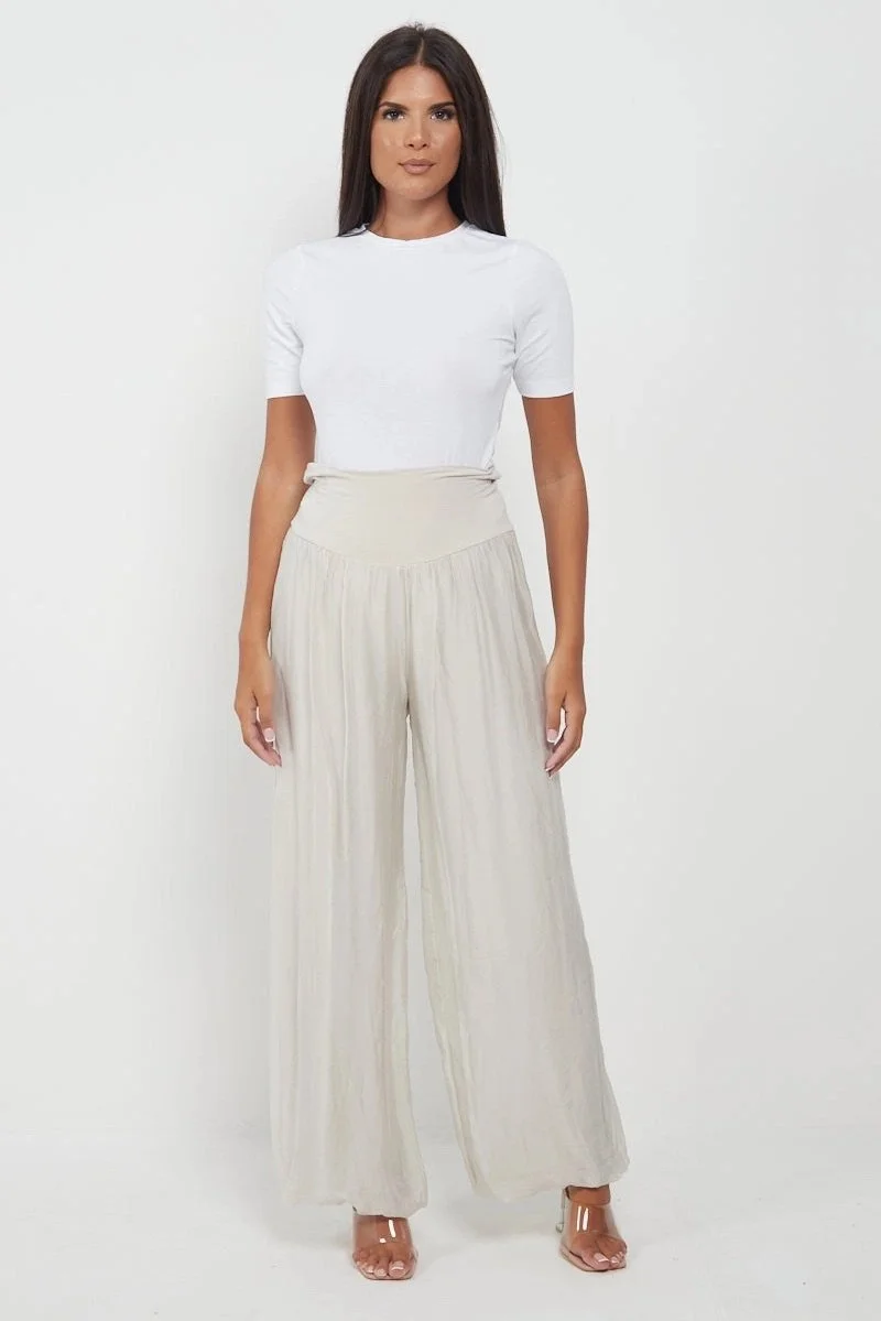 All Items › Basic Silk Palazzo Pants Image 1 of 2 Image 2 of 2 Basic Silk Palazzo Pants $76.00 sold out Made In Italy Lagenlook Plain Silk Wide Leg Palazzo Trousers * Plain Palazzo Trouser * Elasticated Waist * Wide Legs * Relaxed Fit Silver Silk Palazzo Pants: Select Silver Silk Palazzo Pants Small Medium White Silk Palazzo Pants: Select White Silk Palazzo Pants Small Medium Get notified by email when this product is in stock. Sold Out Added! Made In Italy Lagenlook Plain Silk Wide Leg Palazzo Trousers * Plain Palazzo Trouser * Elasticated Waist * Wide Legs * Relaxed Fit