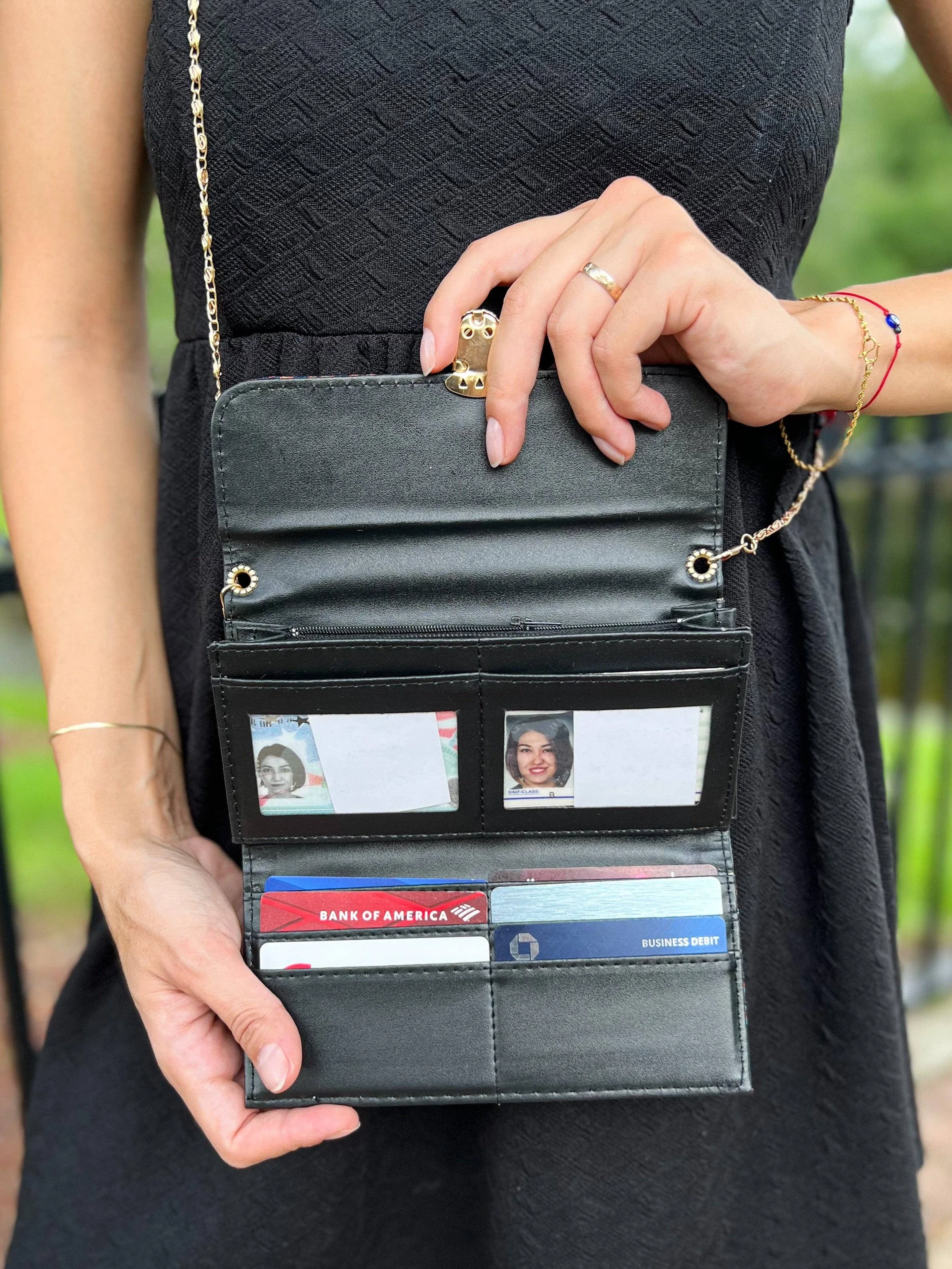 This Boho crossbody bag is made of Turkish carpet patterned brocade fabric and vegan leather. It has a metal clasp and metal chain. It can be used as a trifold wallet when you take the chain out.