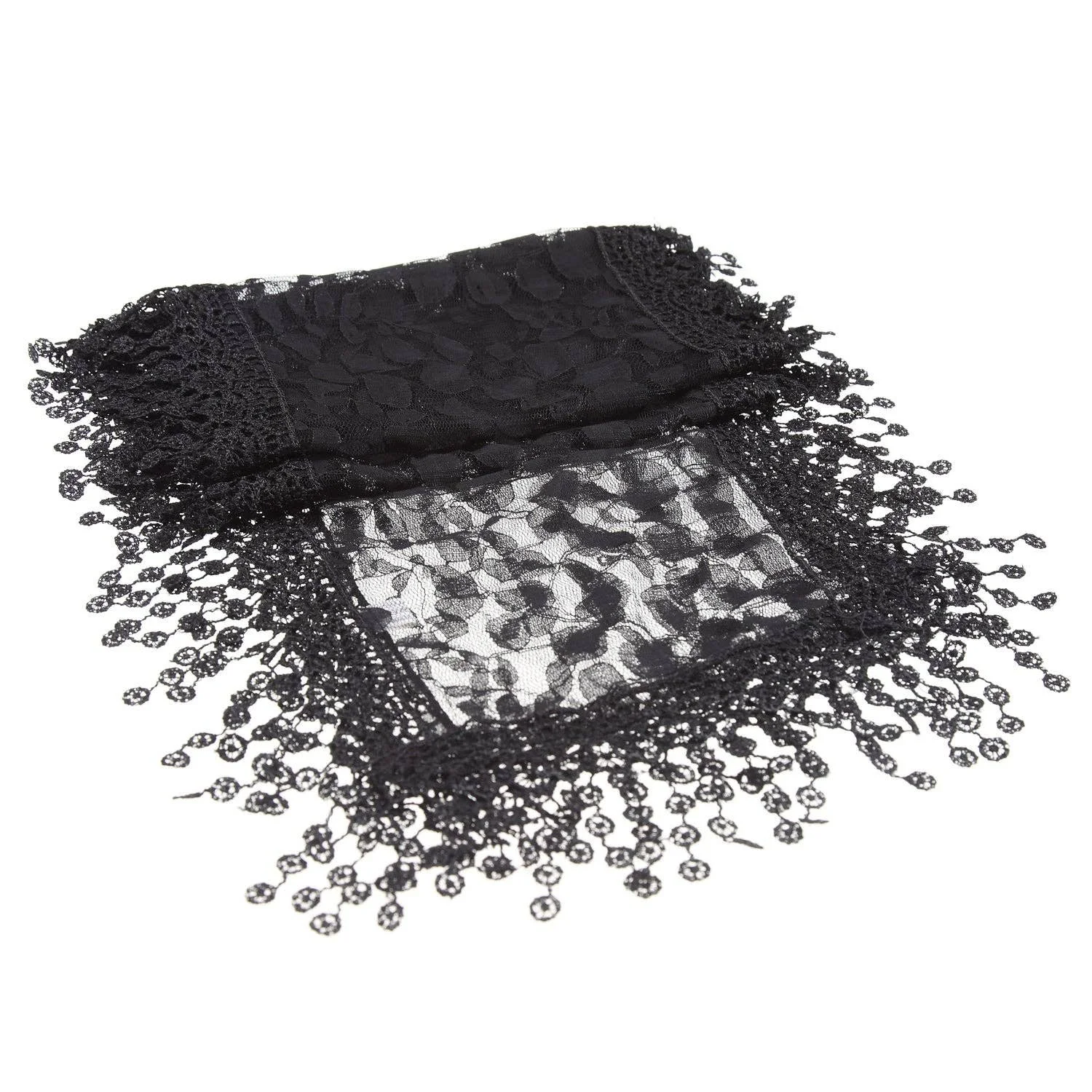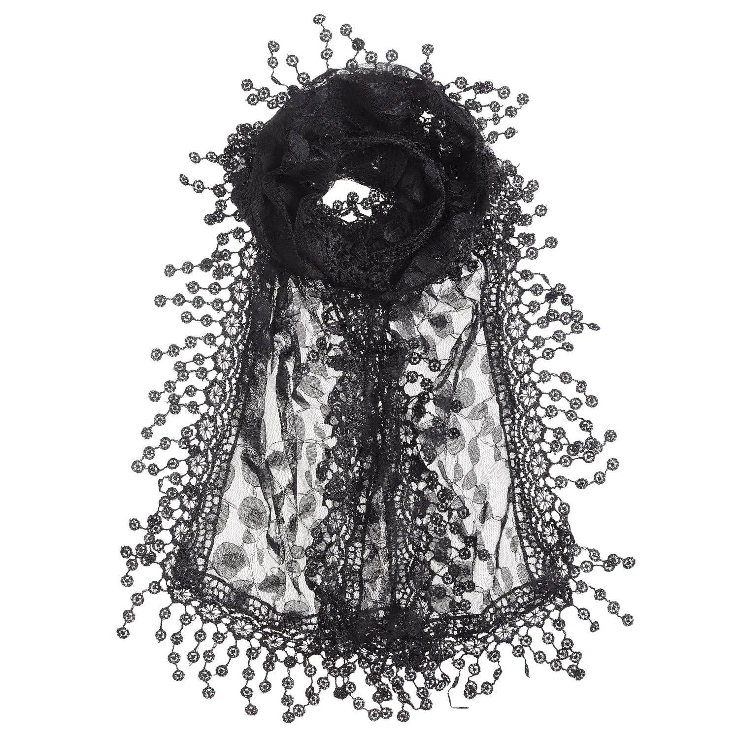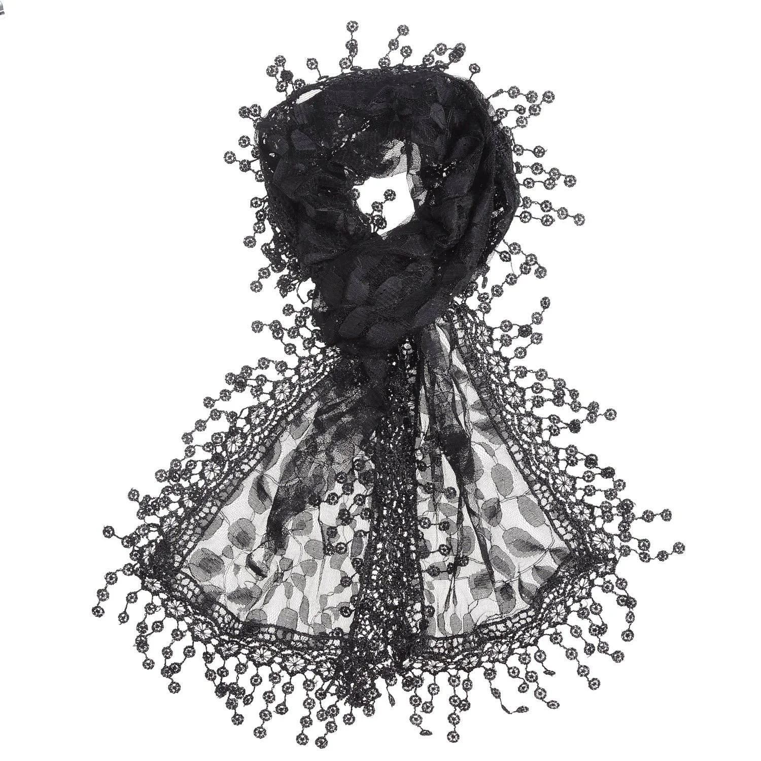 BLACK-One Piece Leaf Pattern Lace Scarf with Tassels
