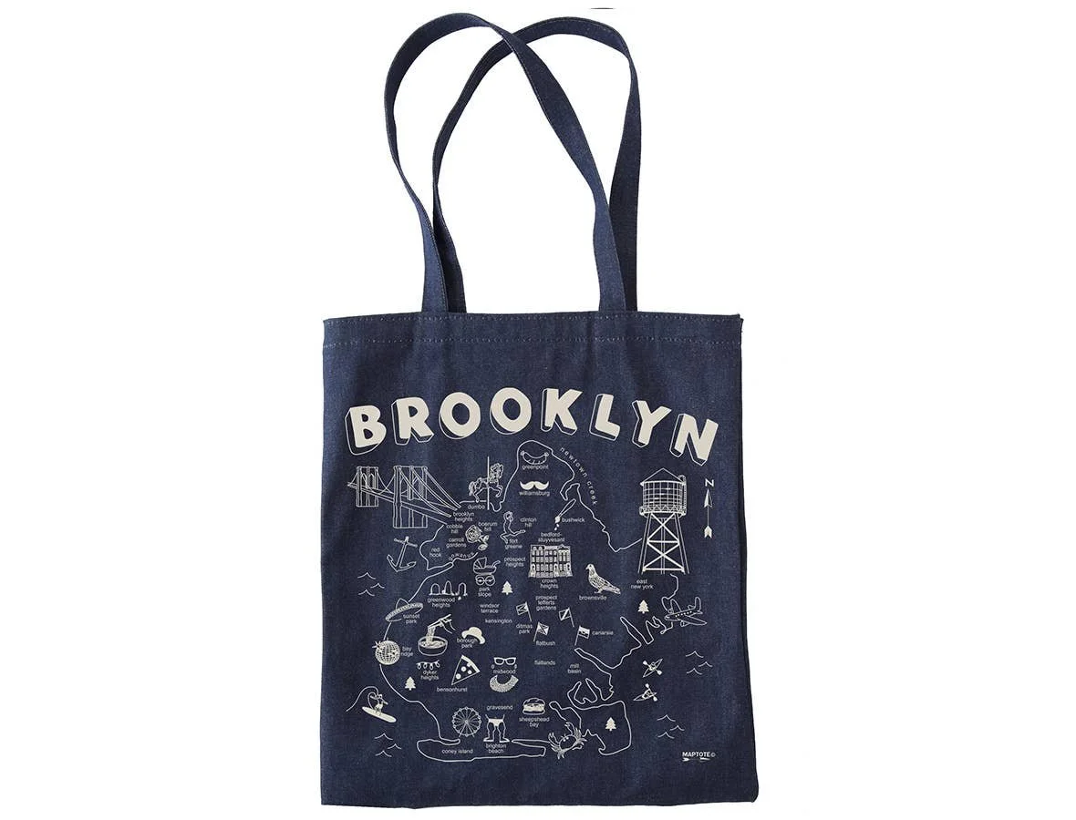 This durable and stylish denim tote bag wears well over time and has a handy inside pocket. Makes for a unique and practical souvenir featuring a map of Brooklyn, New York.