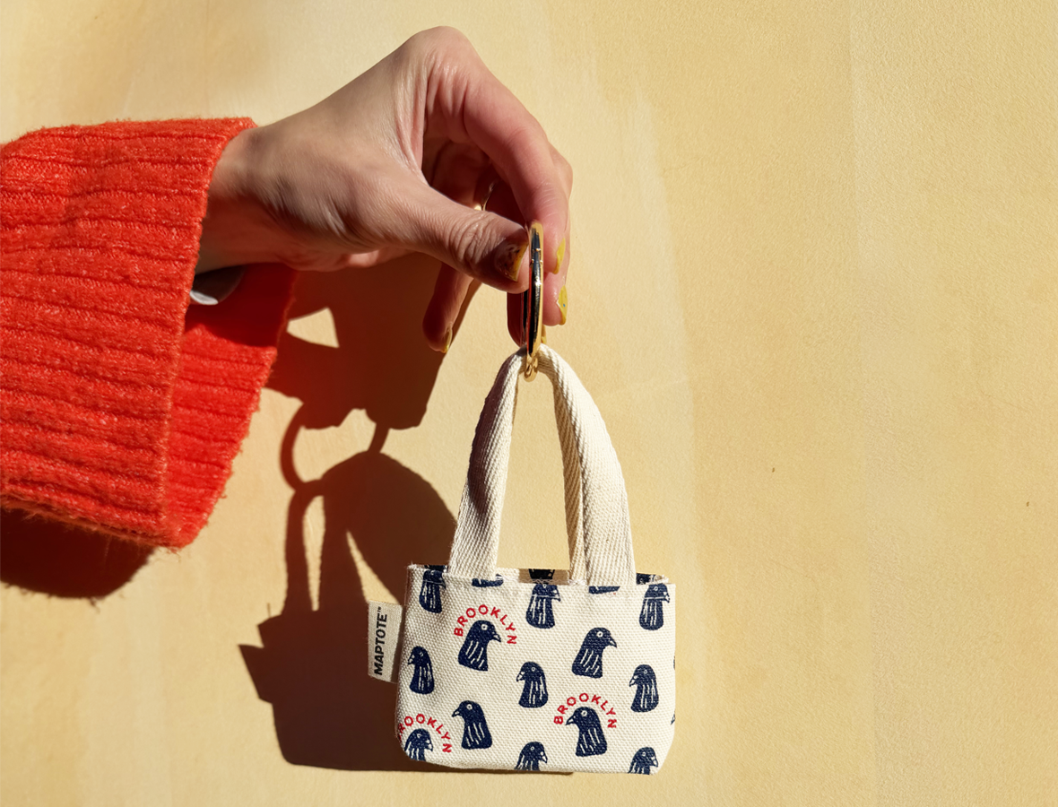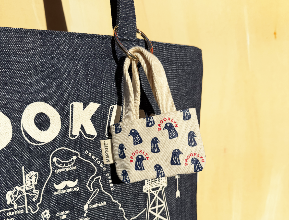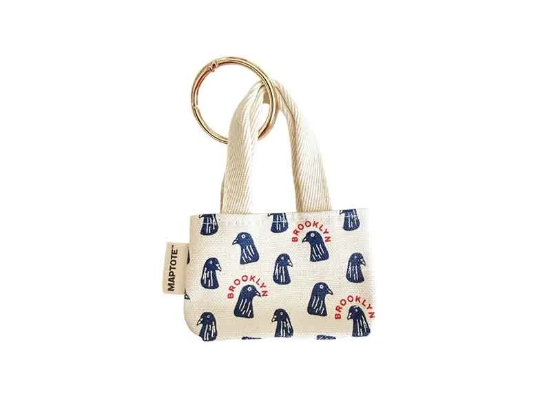 Screen printed with an all-over pigeon print, this cheeky charm adds a touch of Brooklyn charm (and squawk) to any tote, backpack, or key ring. Cut from sturdy 100% cotton canvas and finished with a shiny gold-colored clip-on ring, it’s a quirky tribute to the borough’s most unbothered bird.