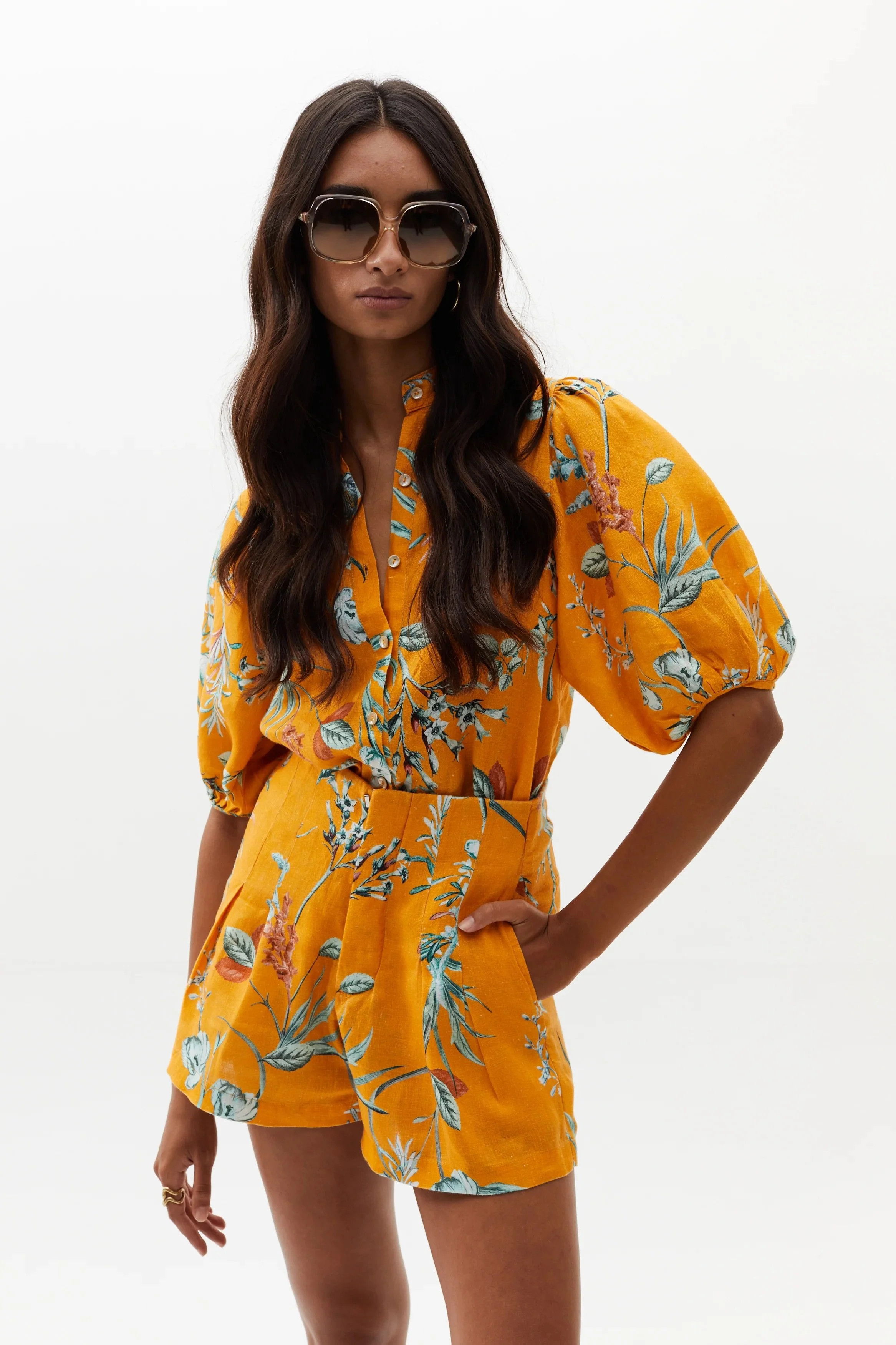The Bubble linen top is a very feminine and flattering piece for any occasion. It features a mao neckline, button front closure, and puffed sleeves. Our exclusive Sunshine print makes it the perfect colorful, floral high summer style. Pair it with the Luna pants, Elastic shorts, or your favorite jeans. DETAILS Mao neckline Elbow-length balloon sleeves Front button closure 100 percent organic linen Pre-washed and softened Imported CARE Machine wash cold Hang dry or lay flat Do not dry-clean SIZE & FIT If in between sizes, size up The model is wearing size XS Model’s measurements: Height: 70.5’’ / 179 cm Bust: 32.7’’ / 83 cm Waist: 23.6’’ / 60 cm Hips: 34.7’’ / 88 cm Size Small: Length 61 cm Chest 34 cm