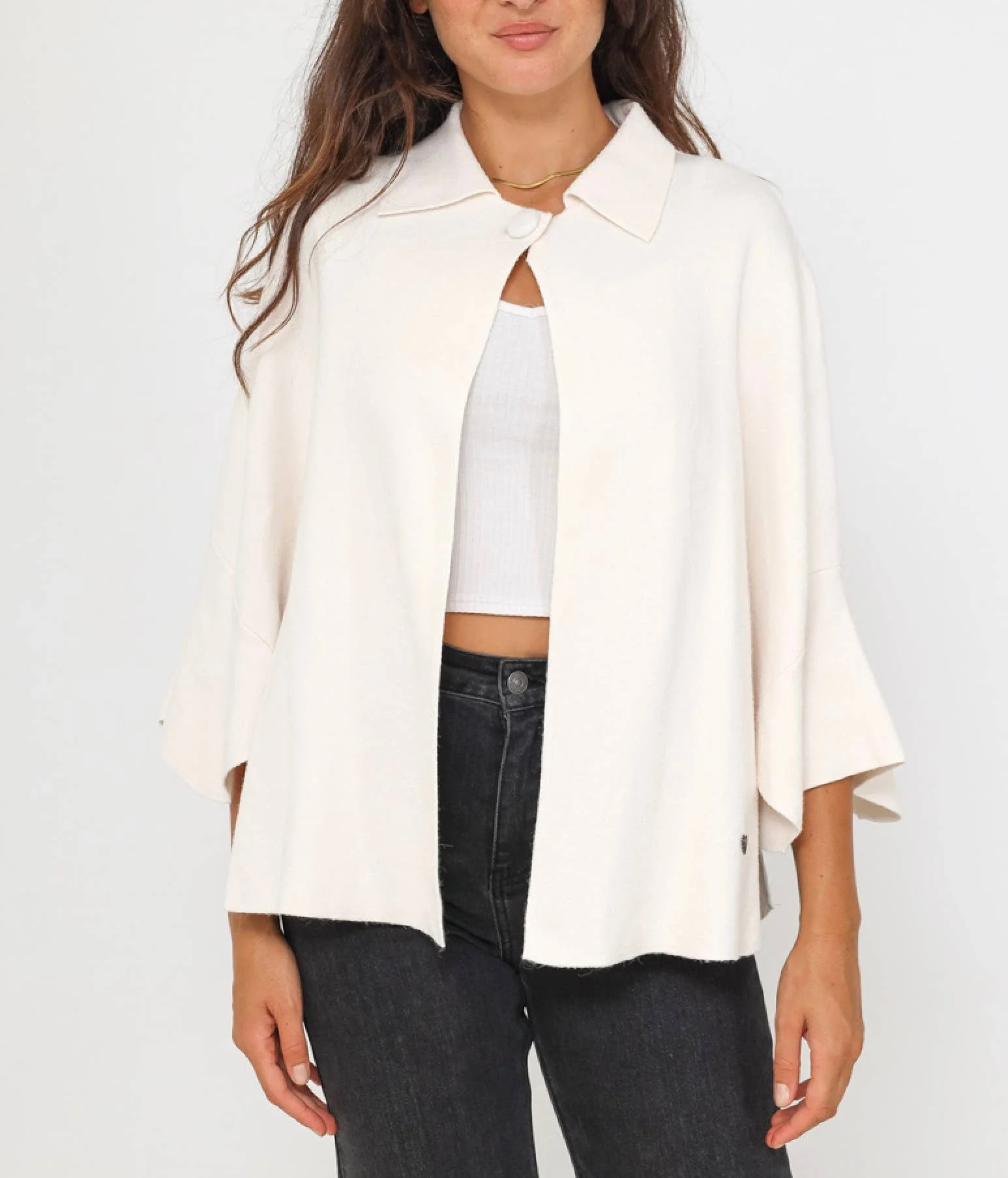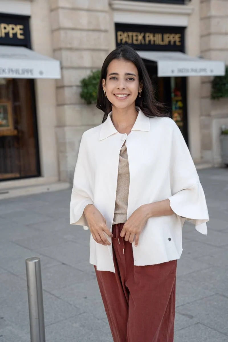 All Items › Cape-style knitted: Ecru, One size Image 1 of 5 Image 2 of 5 Image 3 of 5 Image 4 of 5 Image 5 of 5 Cape-style knitted: Ecru, One size $70.00 sold out Cape-style knitted vest with button on the collar, large 3/4 sleeves and side opening. One size 38-44 (M-XXL) Get notified by email when this product is in stock. Sold Out Added! Cape-style knitted vest with button on the collar, large 3/4 sleeves and side opening. One size 38-44 (M-XXL)
