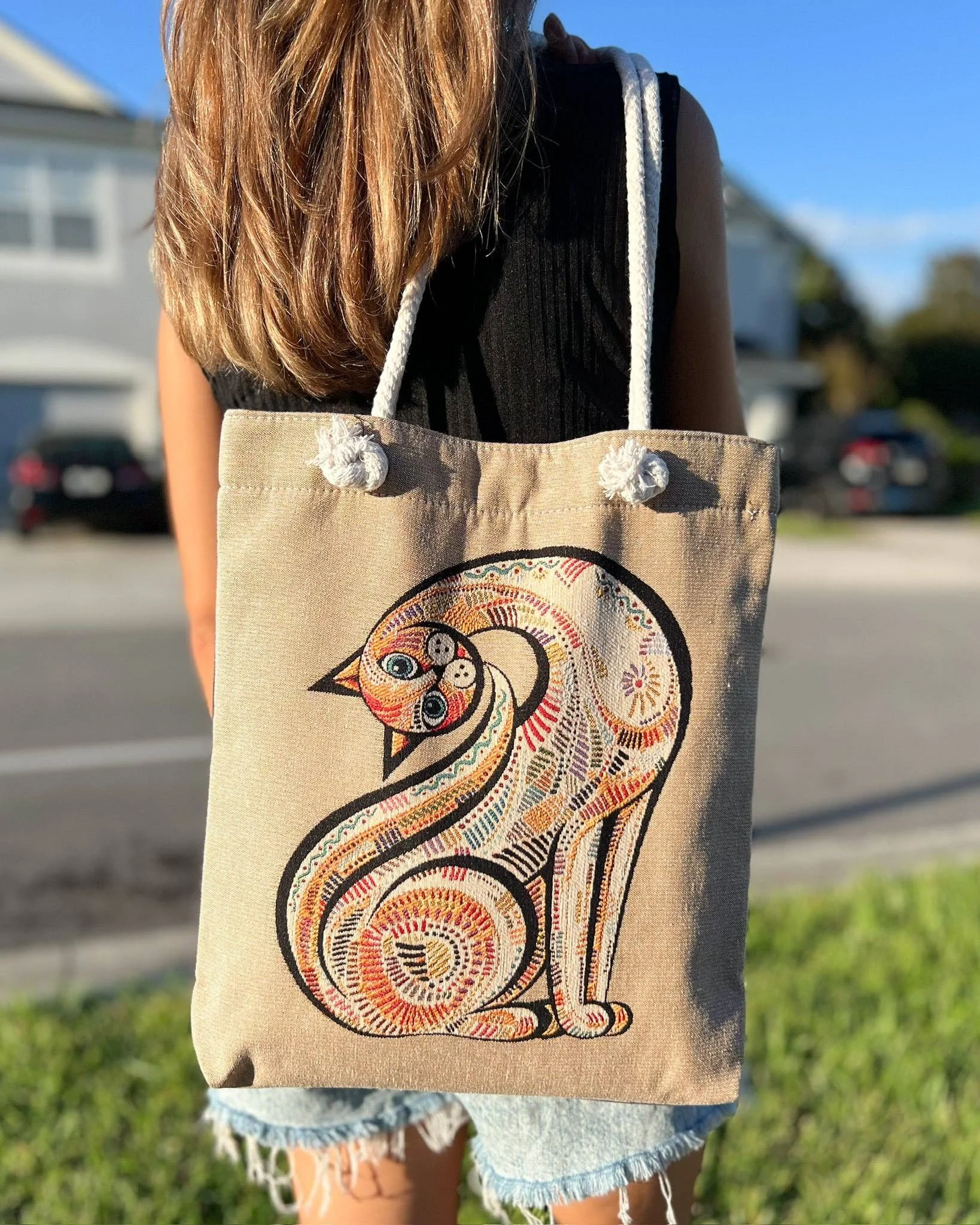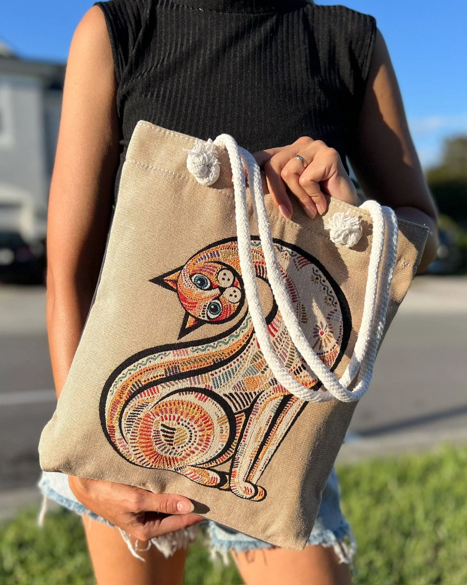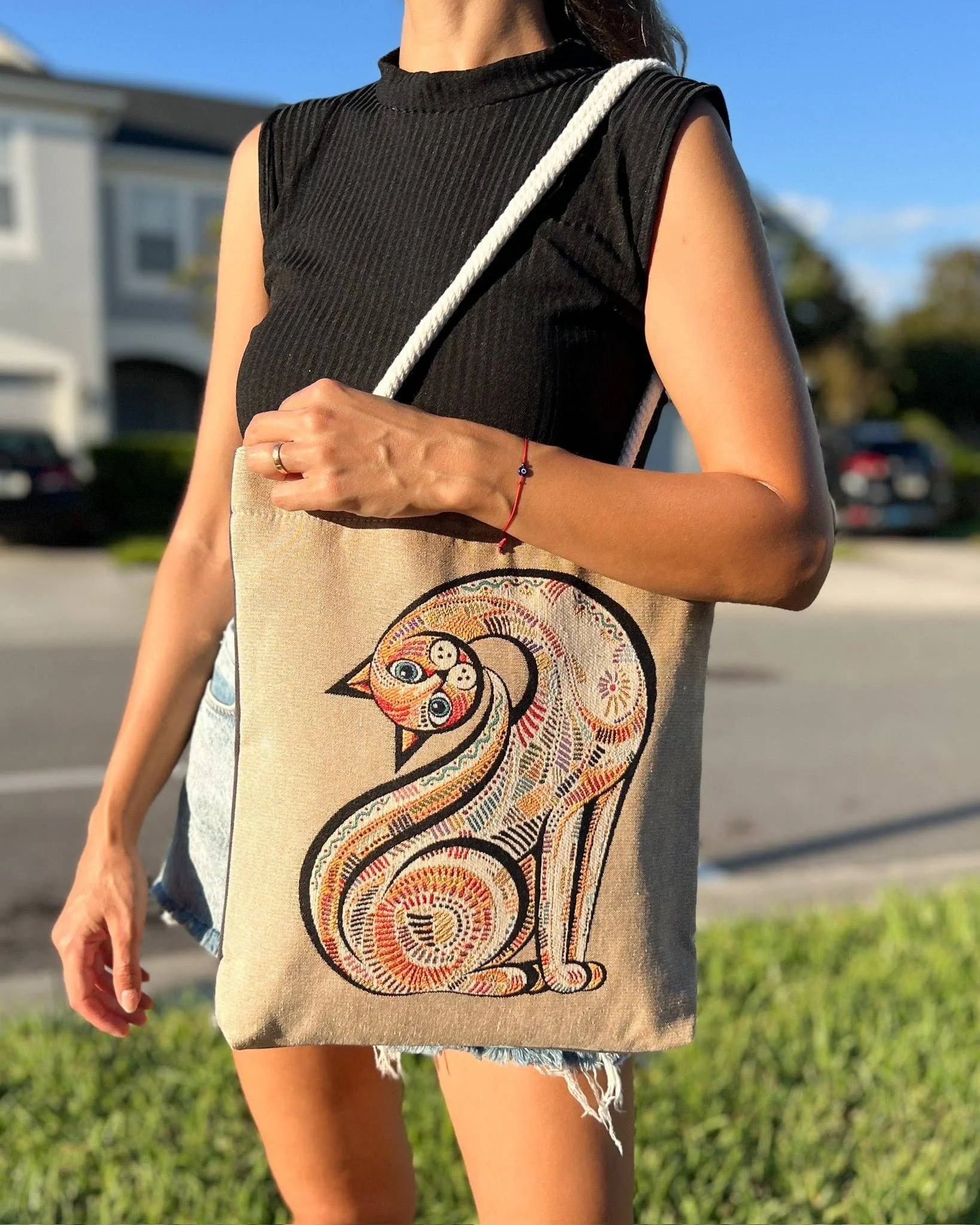 Crafted from premium woven fabric, our tote bag showcases a unique threaded design not printed. Our woven tote bag effortlessly transitions from day to night, complementing any outfit or any occasion. It can be used as a daily shoulder bag, tote bag and beach bag. The design is featured on 1 side while the back of the tote bag is blank. This shoulder bag can also be washed in the machine on gentle cycle. Product dimensions: 16 in X 13 in (40 cm X 33 cm)