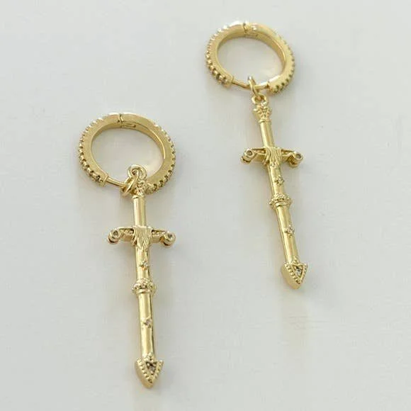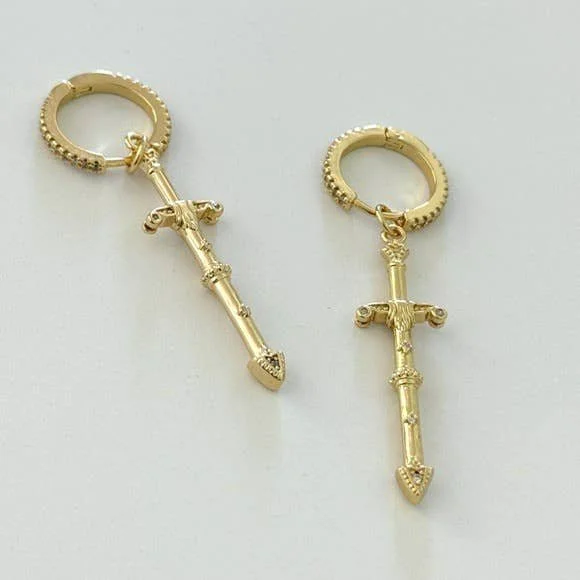 All Items › Dagger Hoops Image 1 of 3 Image 2 of 3 Image 3 of 3 Dagger Hoops $65.00 sold out 14K Gold filled embedded with clear Cz stones featuring gold filled dagger charmsHoops measure 15mmTramps+Thieves DesignMade in Los Angeles Get notified by email when this product is in stock. Sold Out Added! 14K Gold filled embedded with clear Cz stones featuring gold filled dagger charmsHoops measure 15mmTramps+Thieves DesignMade in Los Angeles