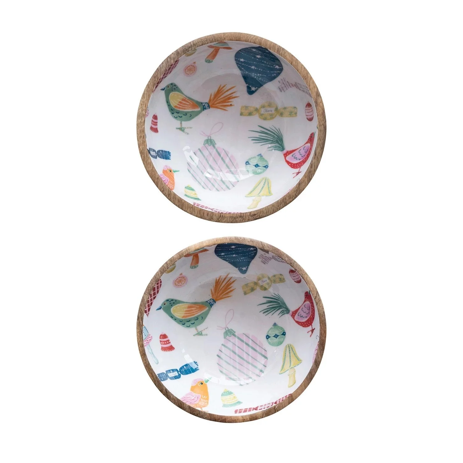 Enameled Mango Wood Footed Bowls w/ Seasonal Pattern, set of 2
