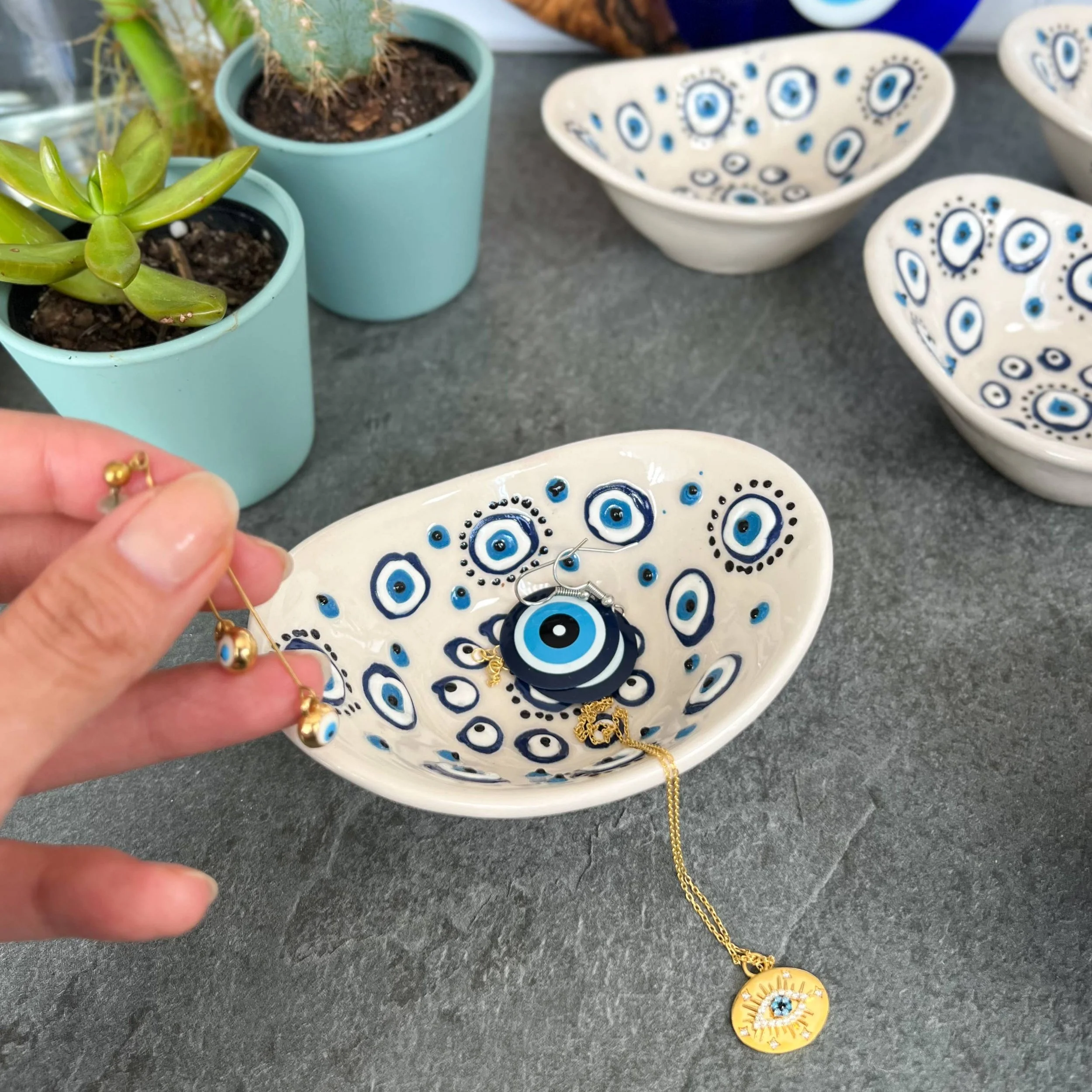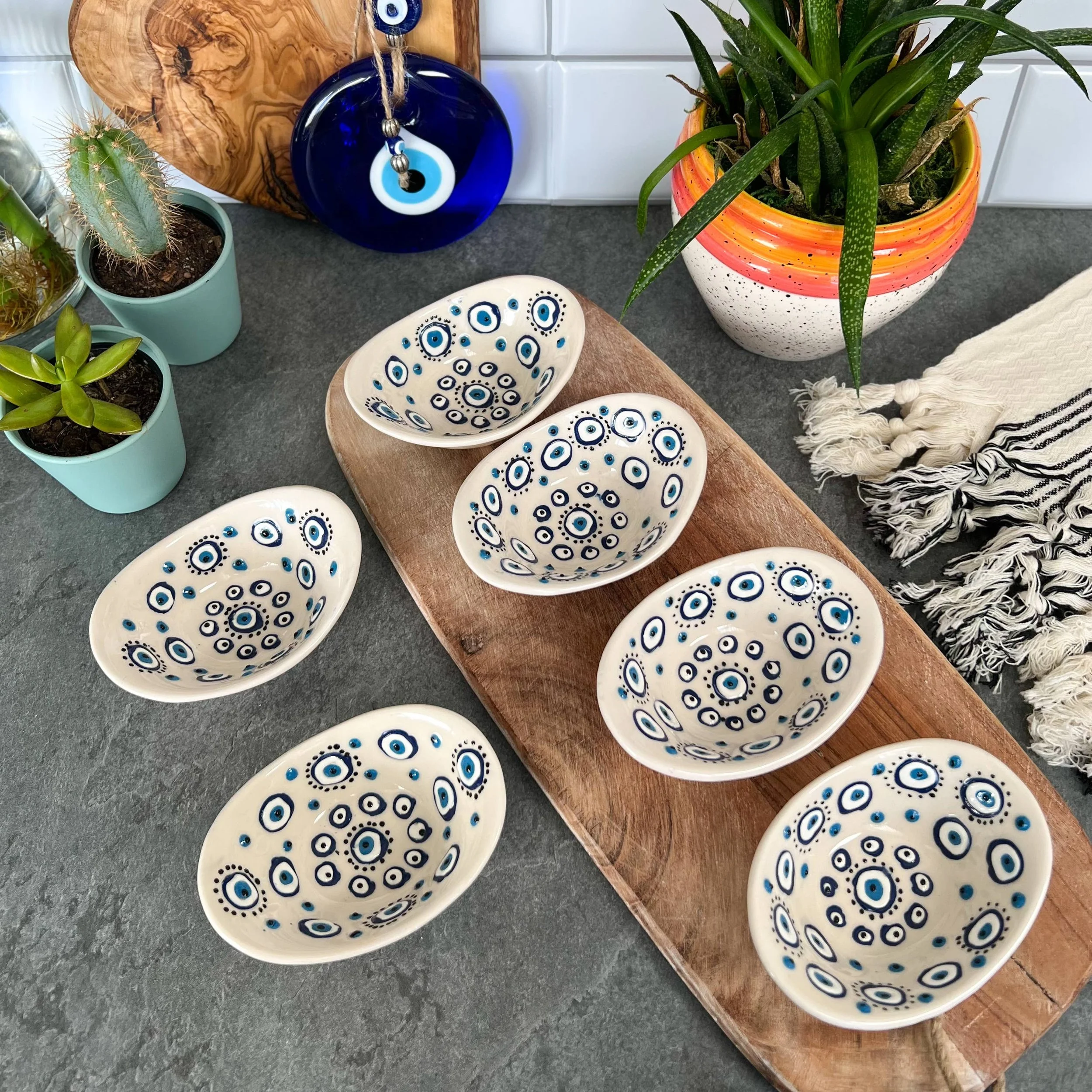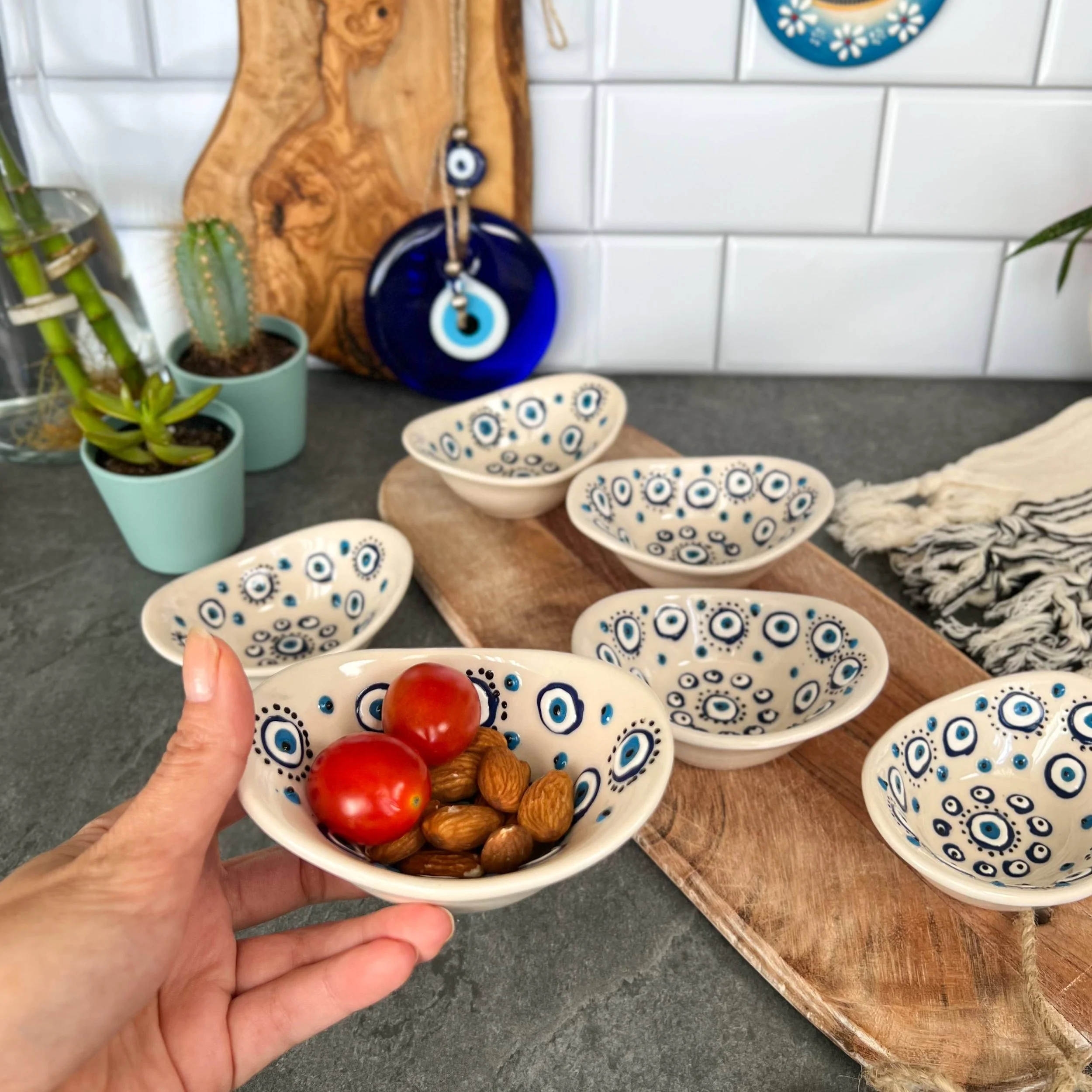 These cute ceramic bowls are handmade in Turkey. They can be used for dipping sauces, nuts, cheese boards, olives in the kitchen. Also, they can be used for storing jewelry, display... They are dishwasher safe. Our ceramics are handmade that is why they are all unique and genuine. The design on the design can differ as we hate limiting the creativity of the maker. These are not machine-made items, and small imperfections may happen.
