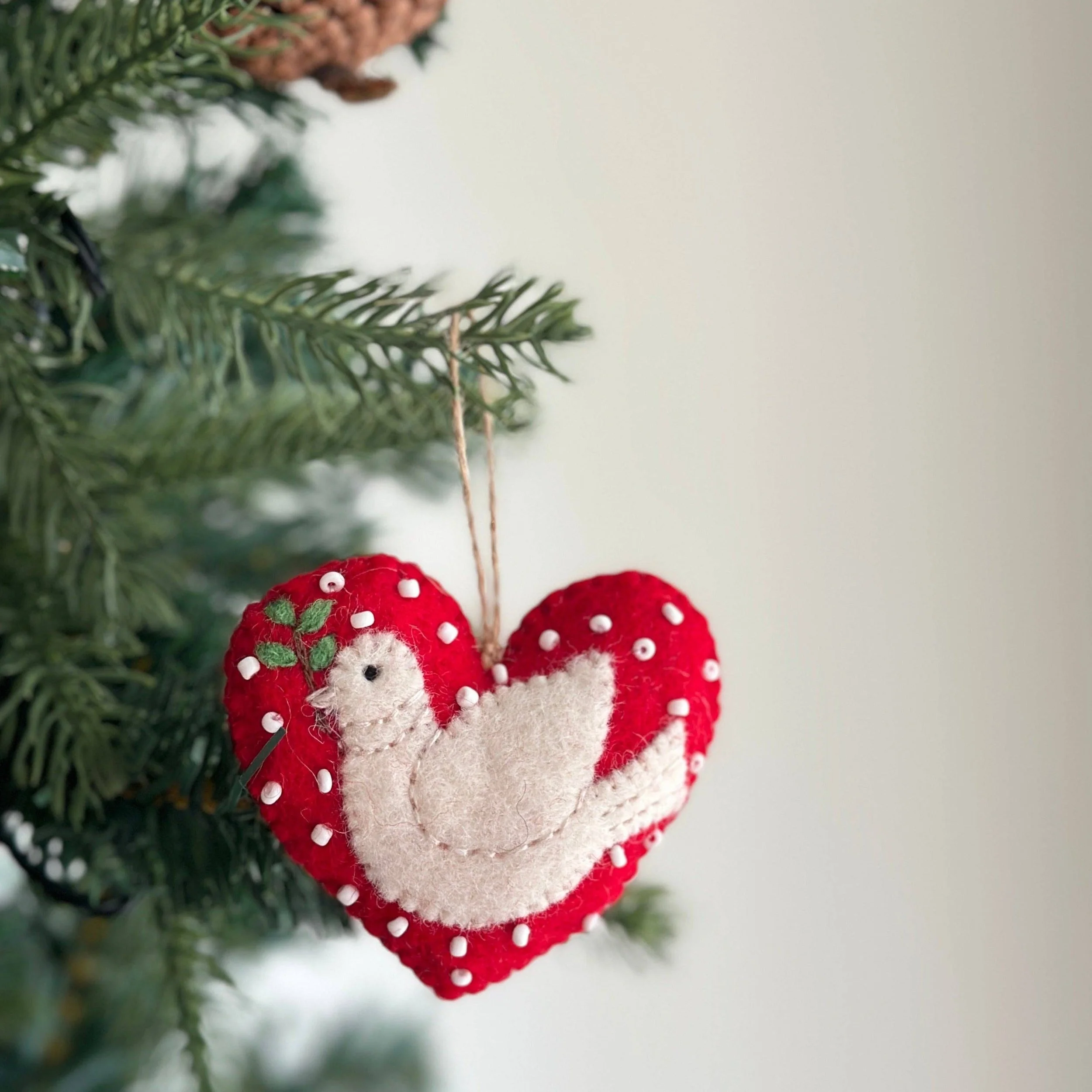Bring a message of peace and hope to your holiday decor with our beautiful Felt Dove Ornament. Handcrafted by skilled artisans in Nepal using soft and durable wool felt, this ornament features a pure white dove holding a delicate olive twig - the universal symbols of peace and forgiveness.