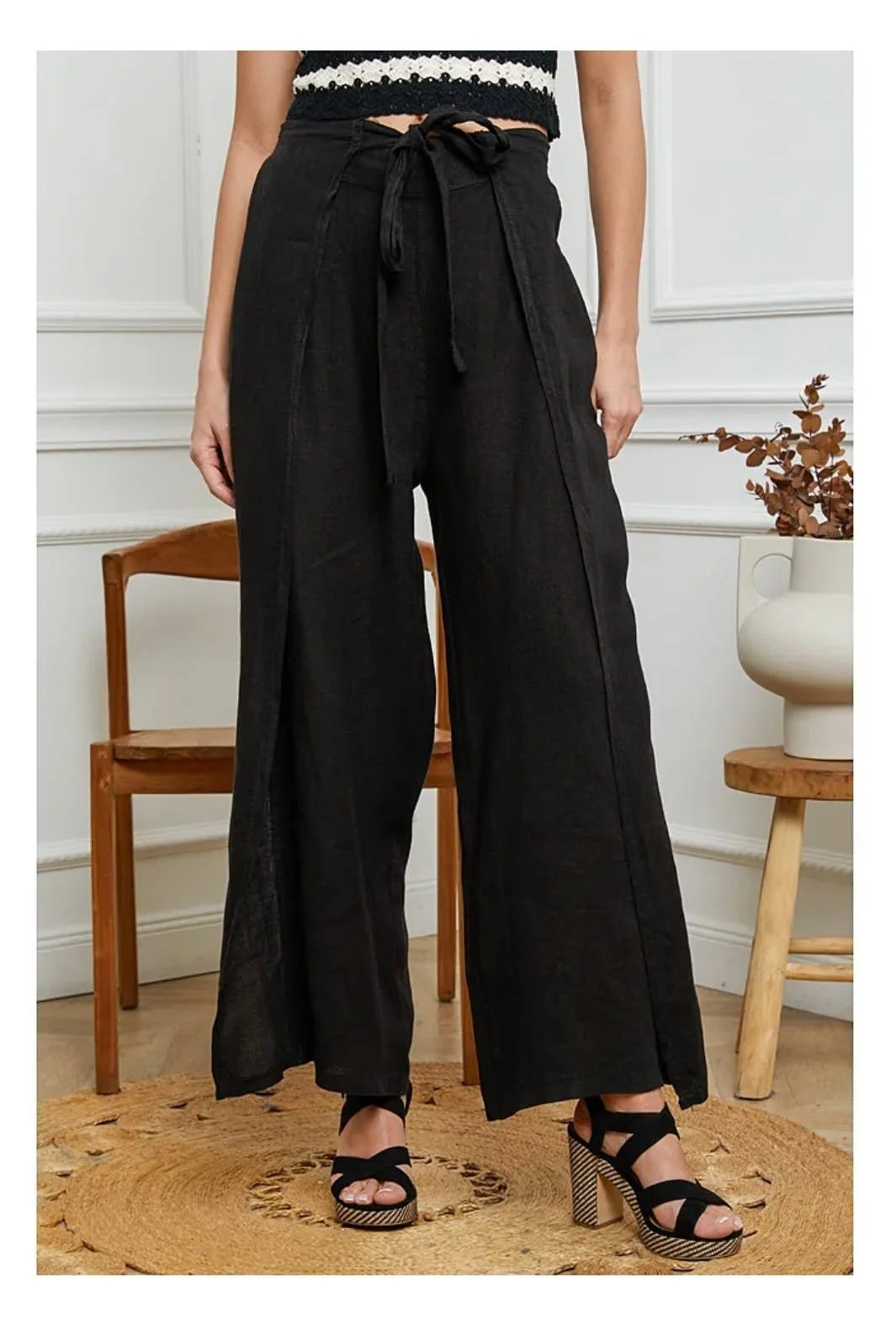 All Items › Front Tie Linen Pants: Black Image 1 of 5 Image 2 of 5 Image 3 of 5 Image 4 of 5 Image 5 of 5 Front Tie Linen Pants: Black $78.00 sold out Linen Wide-Leg Pants Get notified by email when this product is in stock. Sold Out Added! Linen Wide-Leg Pants