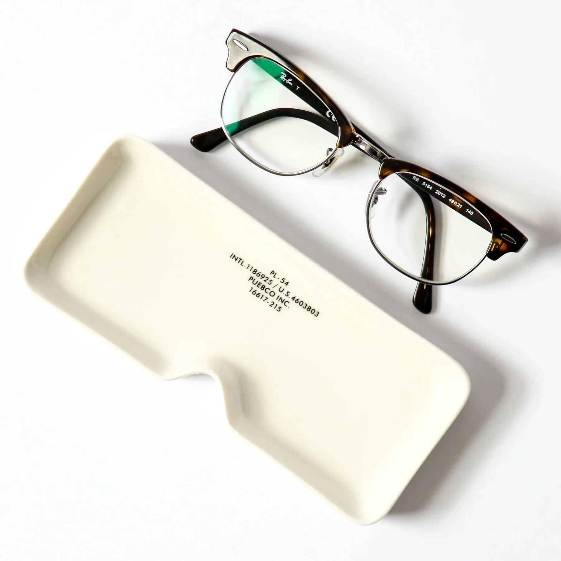 GLASSES TRAY - SQUARE Losing your glasses is a thing of the past thanks to this glasses tray from Puebco. Crafted from ceramic with a vintage aesthetic, it features a square silhouette to perfectly place your specs onto and is complete with glazed lettering and a smooth finish adding to its minimal design.