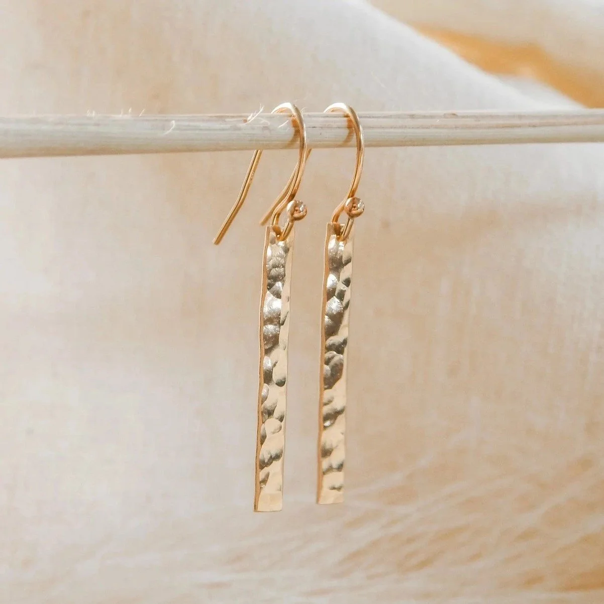 Exquisite, minimal hammered bars in Sterling Silver, 14k Gold Fill or 14k Rose Gold Fill, paired with ball-end ear wires create a simple yet elegant look. Perfect for any occasion, these earrings are sure to make a statement!