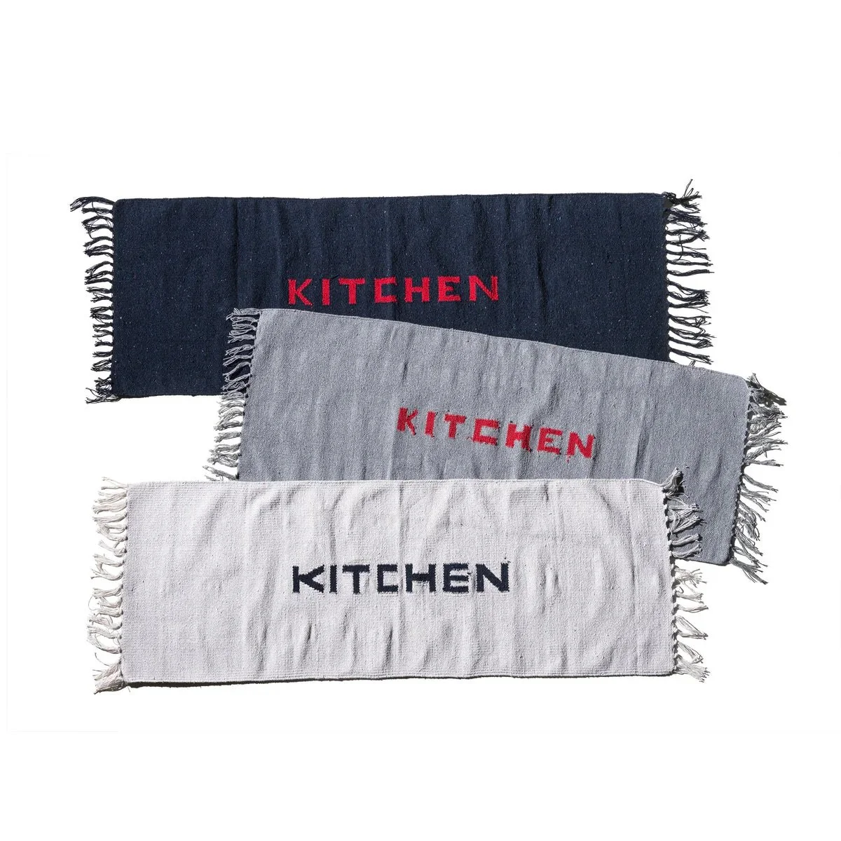 HANDLOOMED RECYCLE YARN KITCHEN MAT-NAVY It is a rug woven one by one with a handloom in a town in India where the production of textiles is thriving. The reason why the people who spin the yarn, the people who dye it, and the people who weave it work on a small scale is that there is no need to set up a large factory. Even though it is a hand loom, it is woven by hand, so the density is uneven, and it has a taste that is not found in mass-produced products woven by machines.