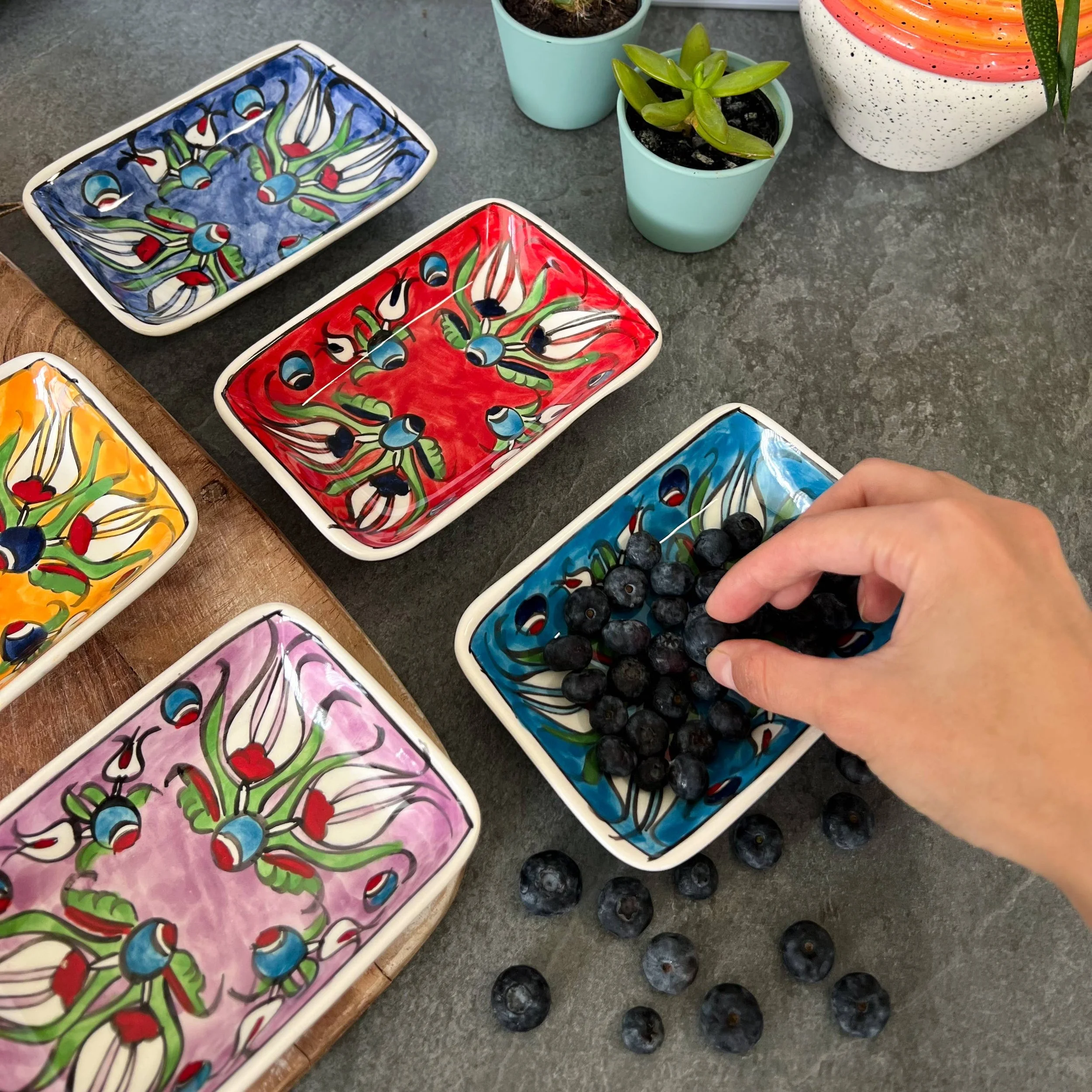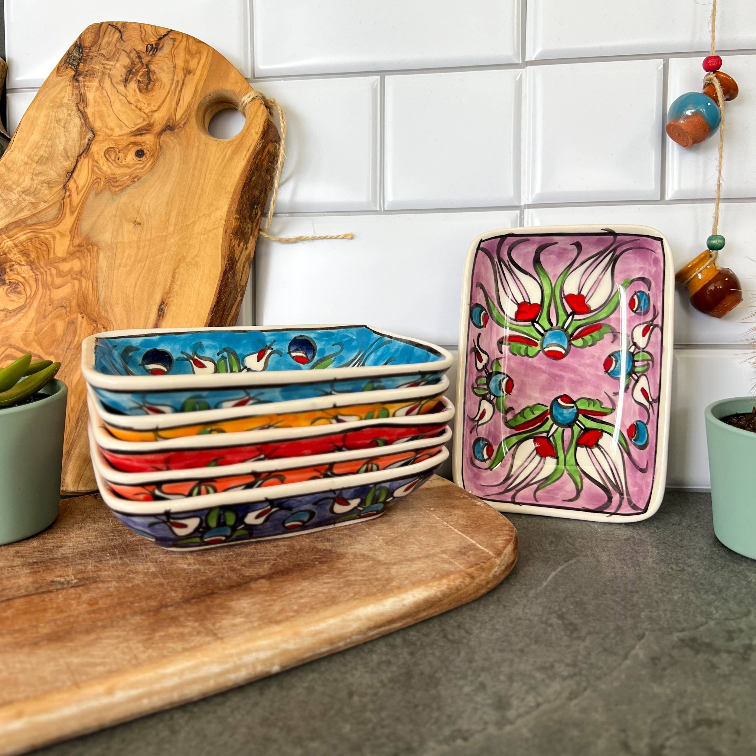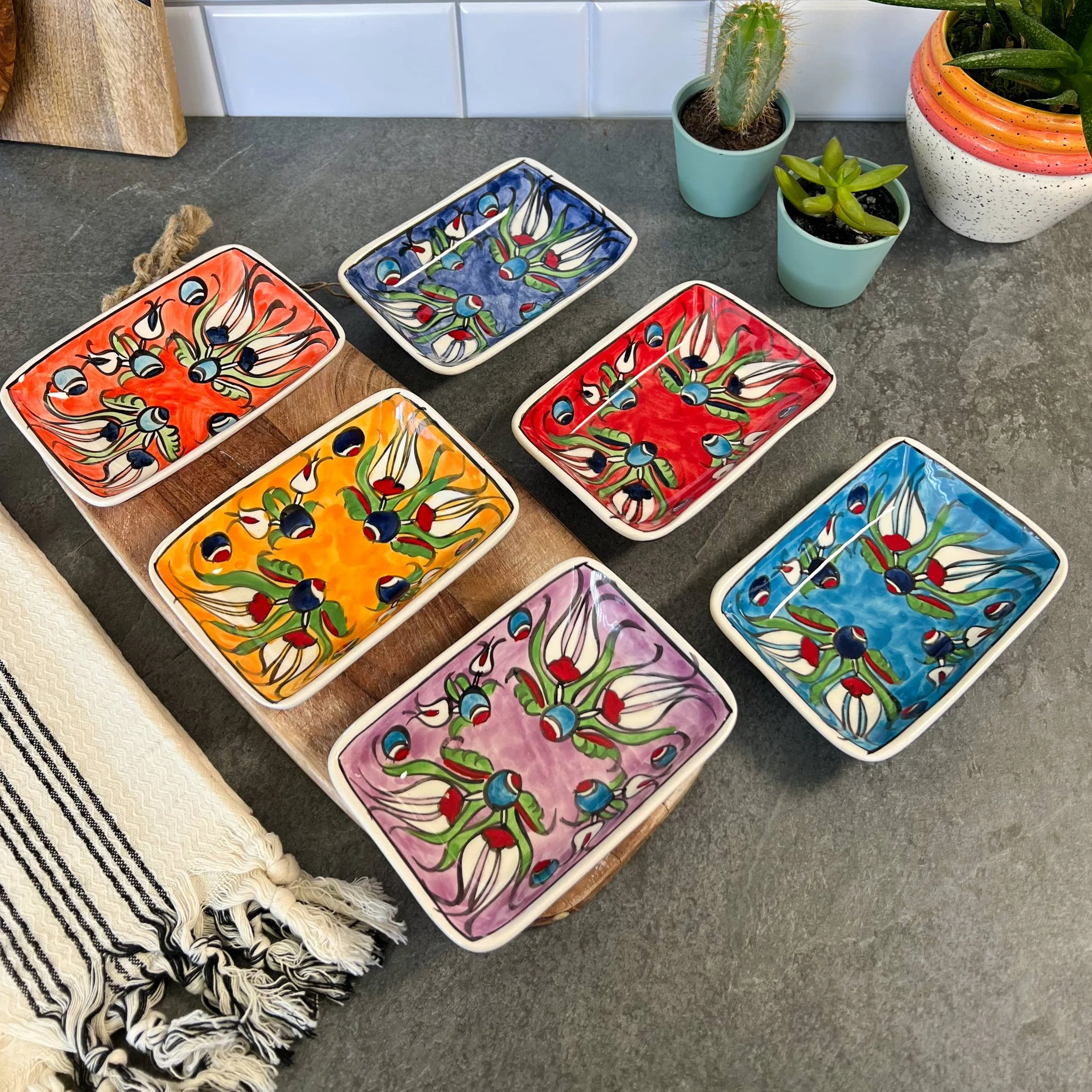 These cute ceramic bowls are handmade in Turkey. They can be used for sauces, nuts, cheese boards, olives, tapas, fruits... Also, they can be used for storing jewelry, display... They are dishwasher safe.. ·Material: Ceramic ·Paint: 100% Natural-Mineral Paint ·Length: 5.5"-14cm ·Width: 4"-10cm ·Height: 1.5"-3.5cm After glazing, the products are oven-baked in 1040 Celsius degrees for 9 hours. Thus, they are very durable. These are not machine-made items, and small imperfections may happen, and we call them signature of the maker, and I hope you can appreciate them. They come as a set of 6 in a craft box with bubblers giving extra protection. Although we try to get it stamped with "Handmade" at the bottom, some may be missing this detail. Please message us directly, if you have any chipped or broken ones, and we can gladly replace it for you. It is very important for my small business as reporting damaged without getting in touch affects my shop on Faire.