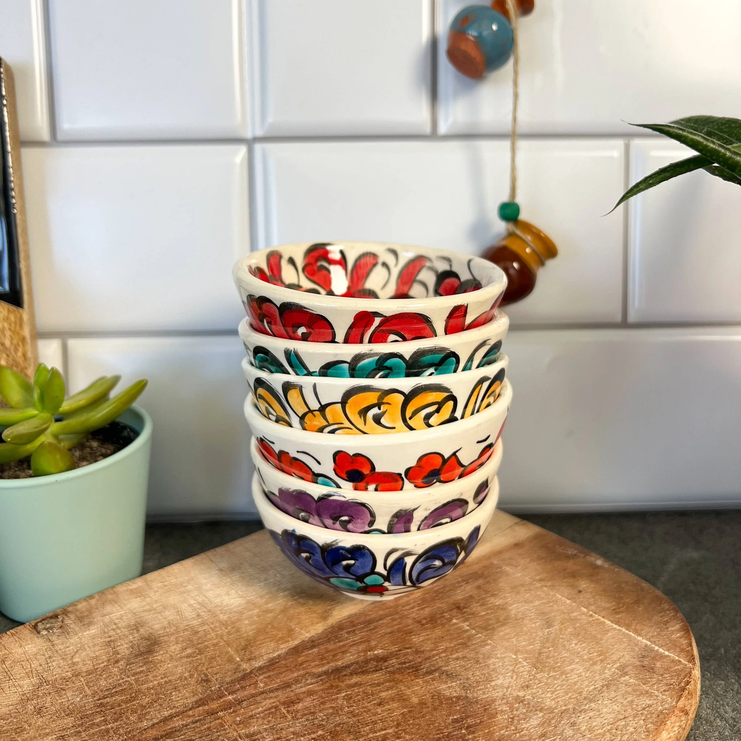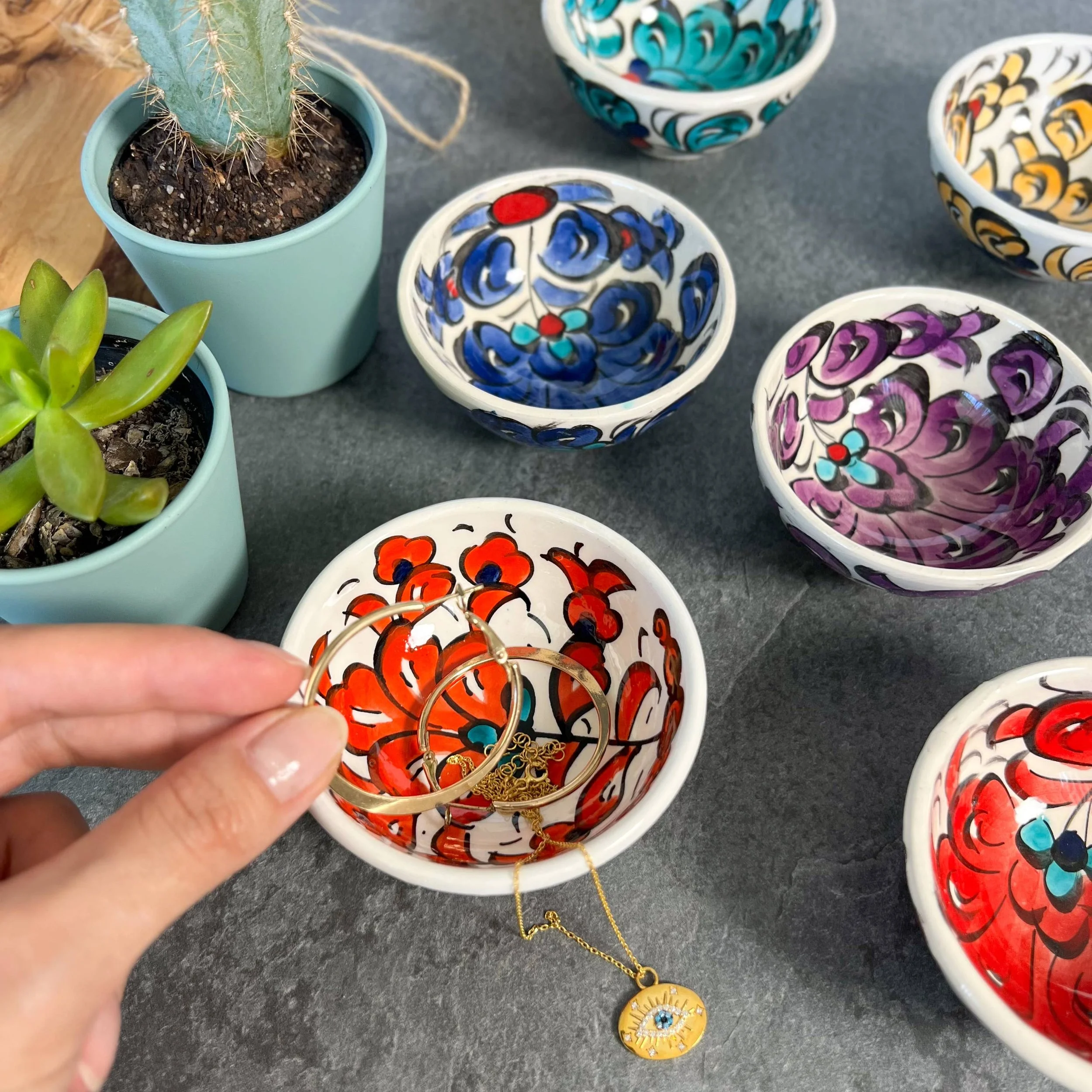 These cute ceramic bowls are handmade in Turkey. These bowls are 3" wide. They can be used for dipping sauces, nuts, cheese boards, olives in the kitchen. Also, they can be used for storing jewelry, display...