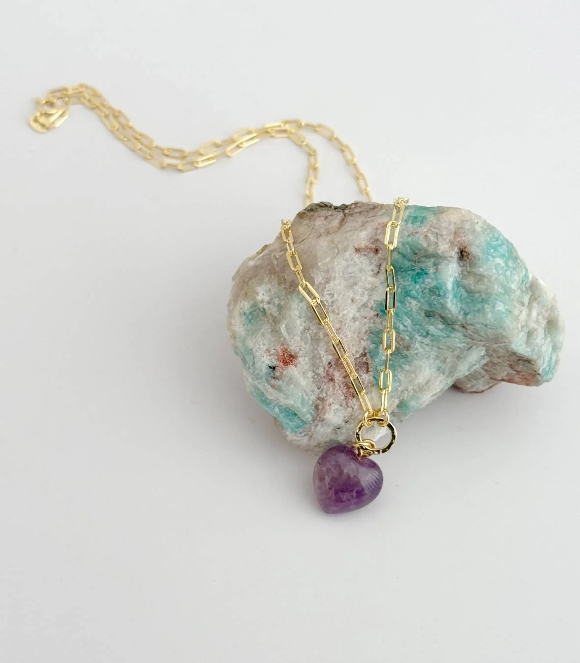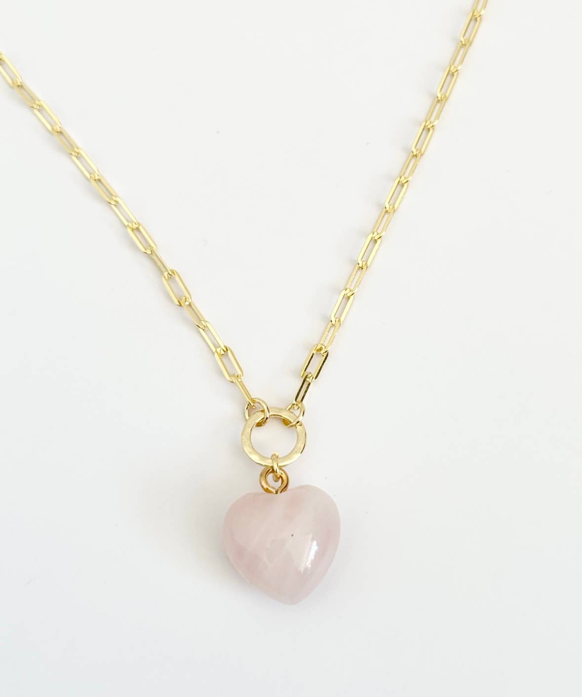 14K Gold Filled staple chain necklace featuring small Rose Quartz heart stone pendent Measures 18” long Available in Rose Quartz, Lapis Lazuli & Amethyst Made in Los Angeles