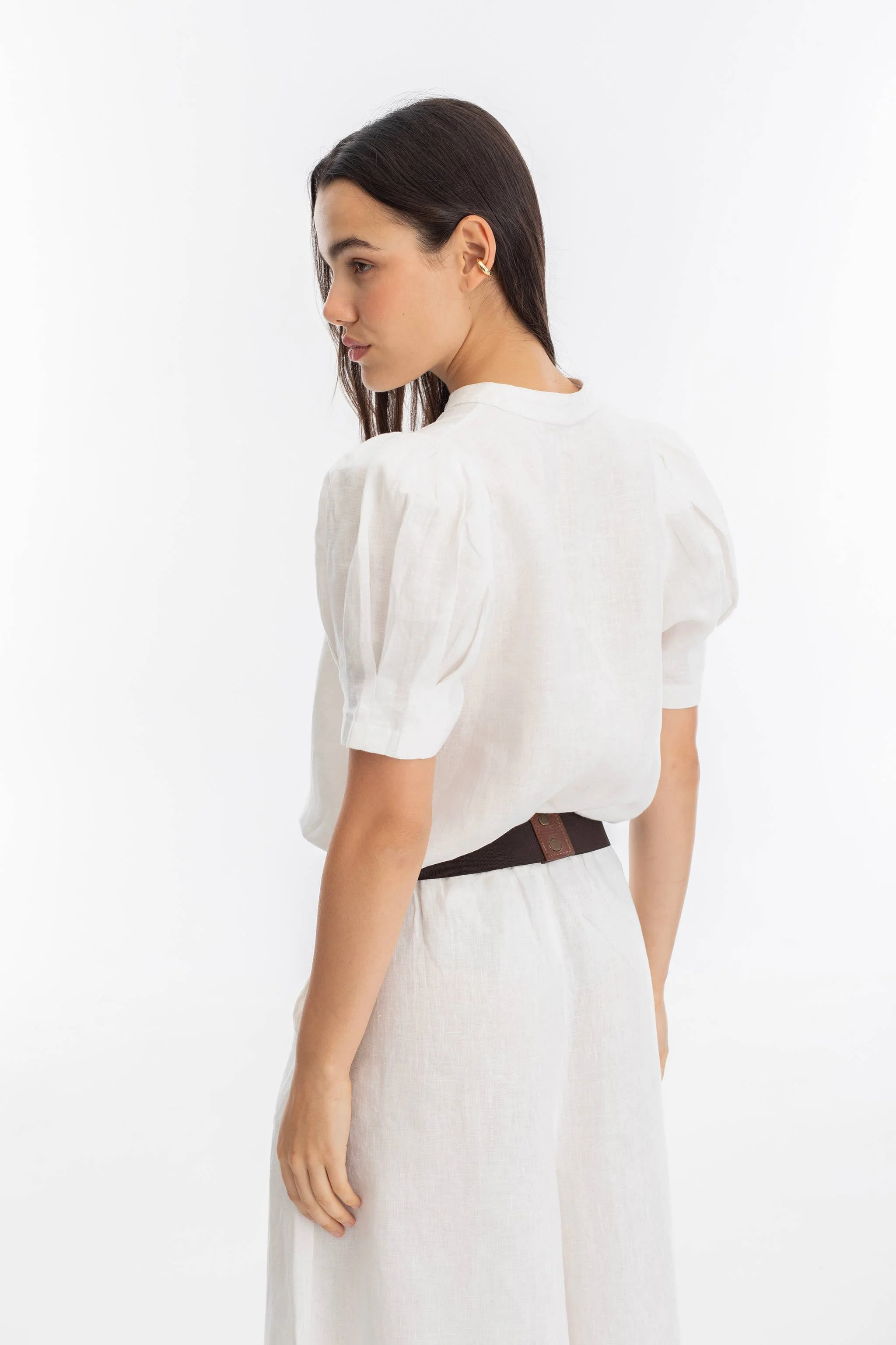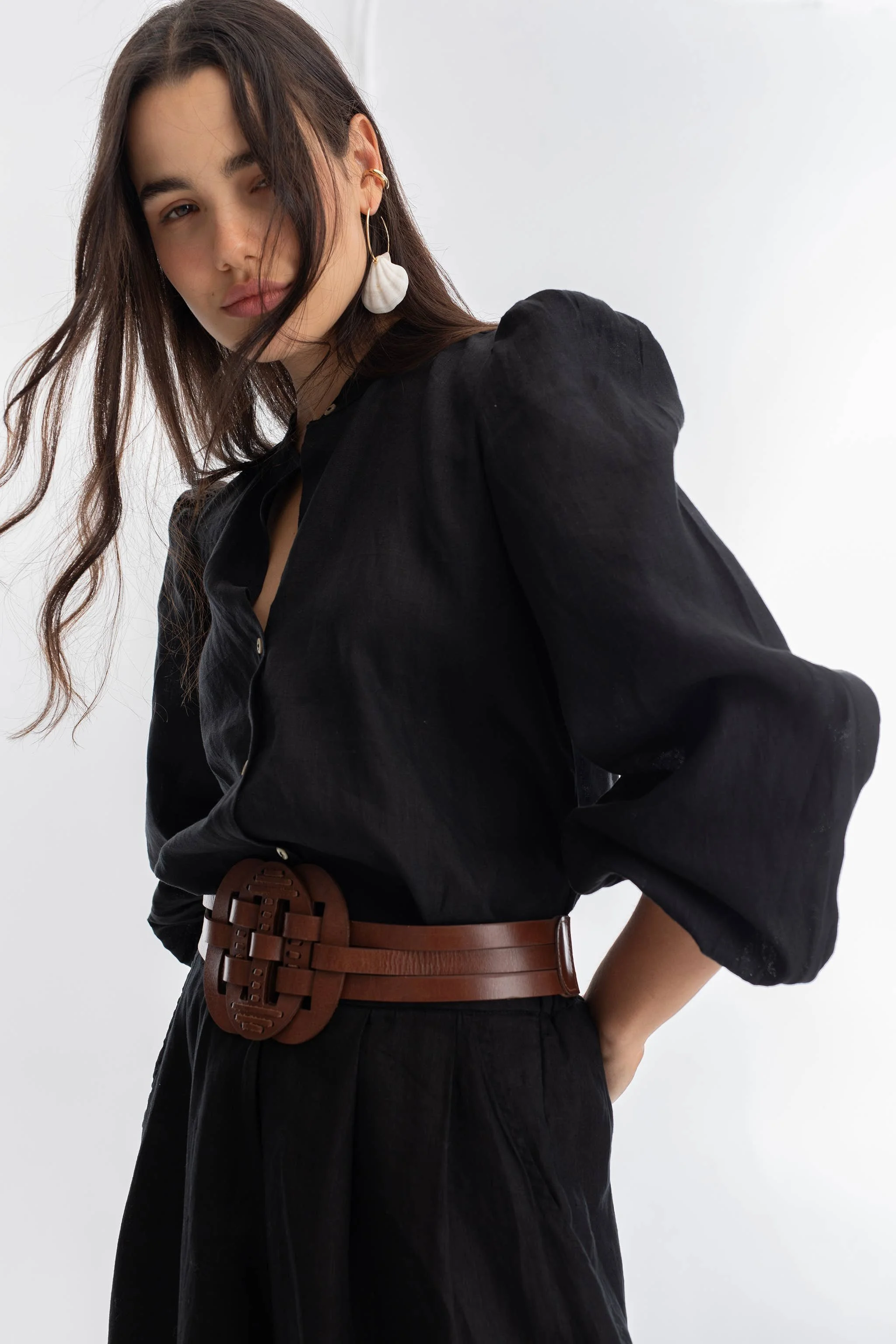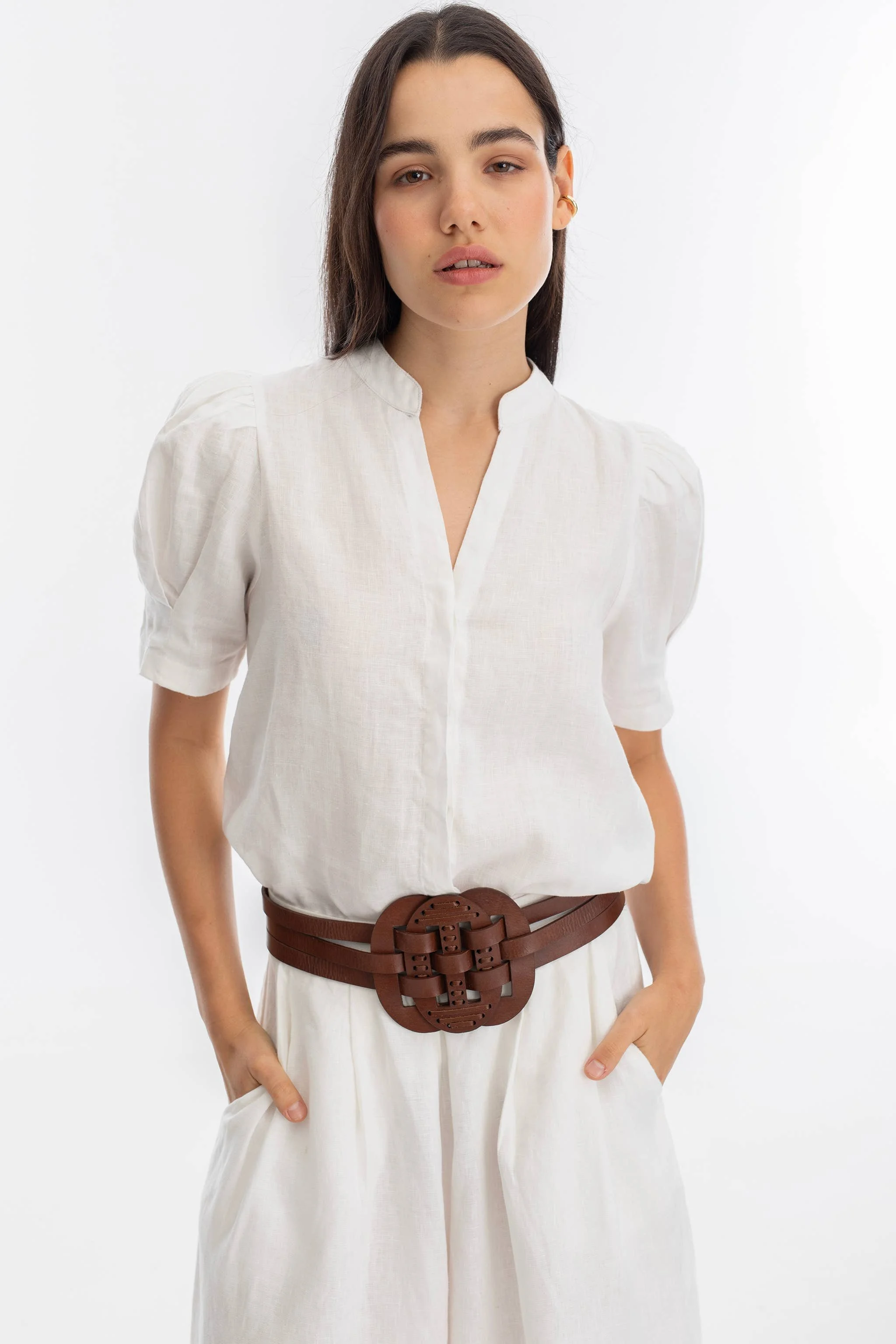 The Helena Belt is crafted from 100% natural cow leather and features an elastic waistband at the back for added comfort, along with an adjustable snap button closure for a perfect fit. This versatile statement piece can be worn at either the high or low waist, making it ideal for layering over our linen sets or pairing with your favorite jeans.