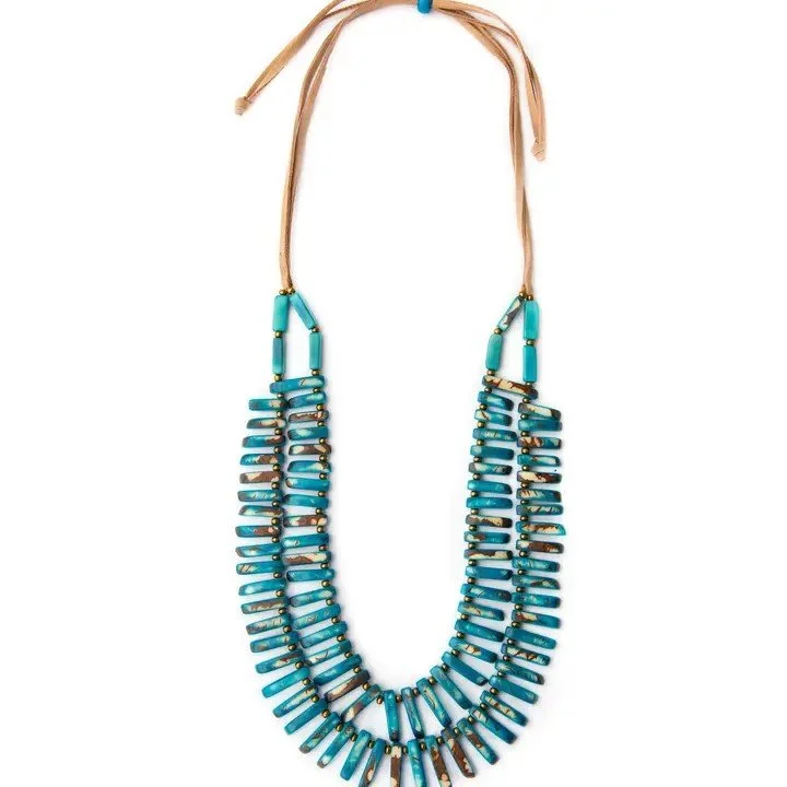 An eye-catching design that is not only trendy, but also sustainable. Handmade with organic tagua pieces with natural leftover grain. Adjustable 22"-38" L Materials: Sustainable Tagua nut Faux leather cord Organic Vegetable dyes Handmade in Ecuador Due to the nature and size of the tagua nuts, all sizes are approximate…not exact. Colors may vary from the pictures slightly due to the nature of the Tagua Nut.
