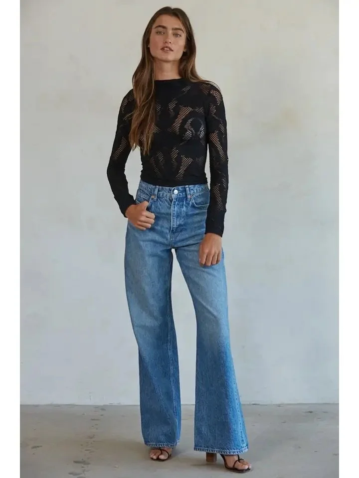 This knit jacquard top features a see-through fishnet overlay, crafted from a 92% nylon and 8% spandex blend. The material is a stretchy knit that offers comfort and flexibility, making it perfect for layering or a stand-alone statement piece. The intricate jacquard pattern adds texture and visual interest, while the mock neck and long sleeves provide a sophisticated look.