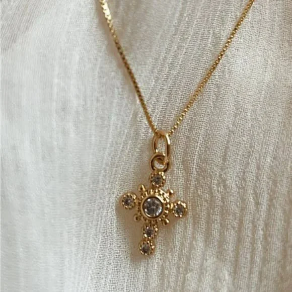All Items › Jules Cross Necklace Image 1 of 3 Image 2 of 3 Image 3 of 3 Jules Cross Necklace $62.00 Limited Availability Dainty 925 sterling gold vermeil plated cross necklace embedded with small clear CZ stonesDainty and lightweightMeasures 18” longTramps+Thieves DesignMade in Los Angeles Get notified by email when this product is in stock. Add To Cart Added! Dainty 925 sterling gold vermeil plated cross necklace embedded with small clear CZ stonesDainty and lightweightMeasures 18” longTramps+Thieves DesignMade in Los Angeles