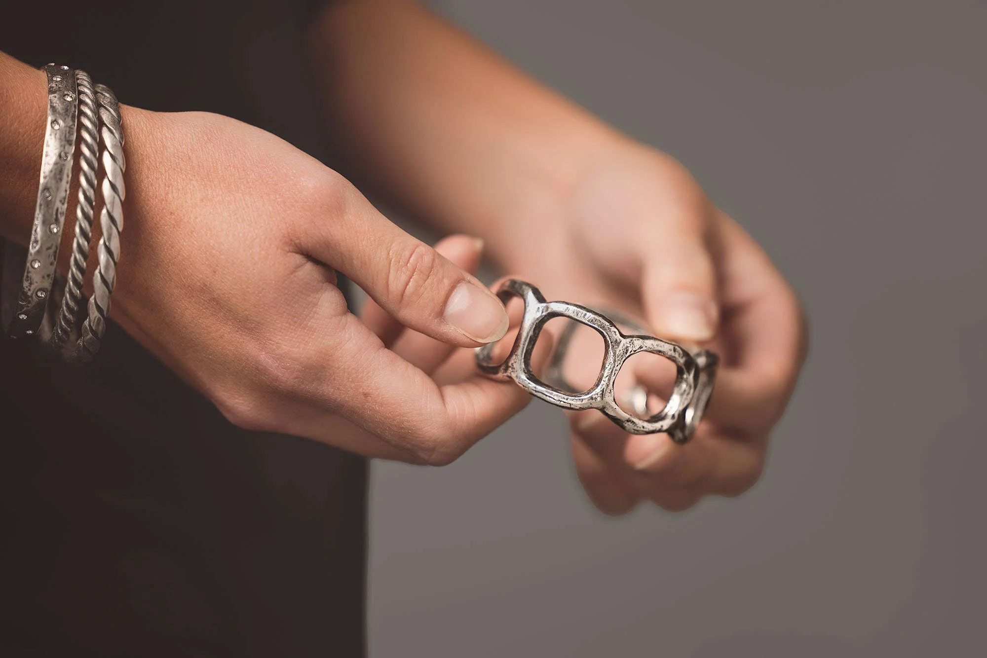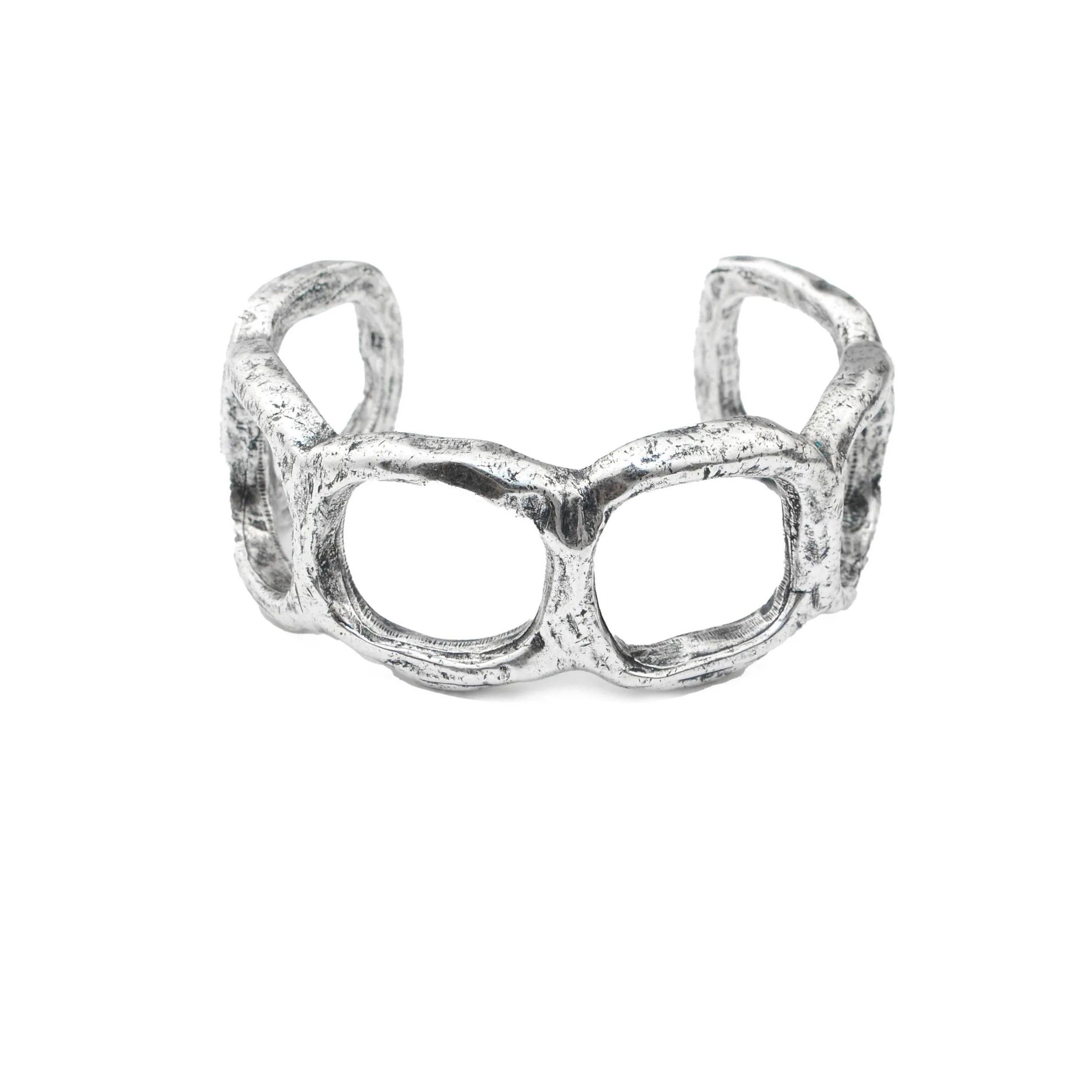 The "Kaia Cuff" is a masterful display of unique artistry, featuring a bold and organic design plated in oxidized sterling silver with a light patina for an heirloom quality. Its openwork silhouette captures the essence of modern elegance, making it a versatile statement piece that is both impactful and tastefully sophisticated.