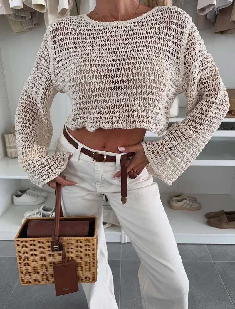 All Items › Knit Long Sleeve Crop Top: BEIGE, One Size Image 1 of 3 Image 2 of 3 Image 3 of 3 Knit Long Sleeve Crop Top: BEIGE, One Size $46.00 sold out Loose knit long sleeve crop with open texture and round neck. Adds a laid-back touch to casual outfits. Great for resort or off-duty looks. Get notified by email when this product is in stock. Sold Out Added! Loose knit long sleeve crop with open texture and round neck. Adds a laid-back touch to casual outfits. Great for resort or off-duty looks.