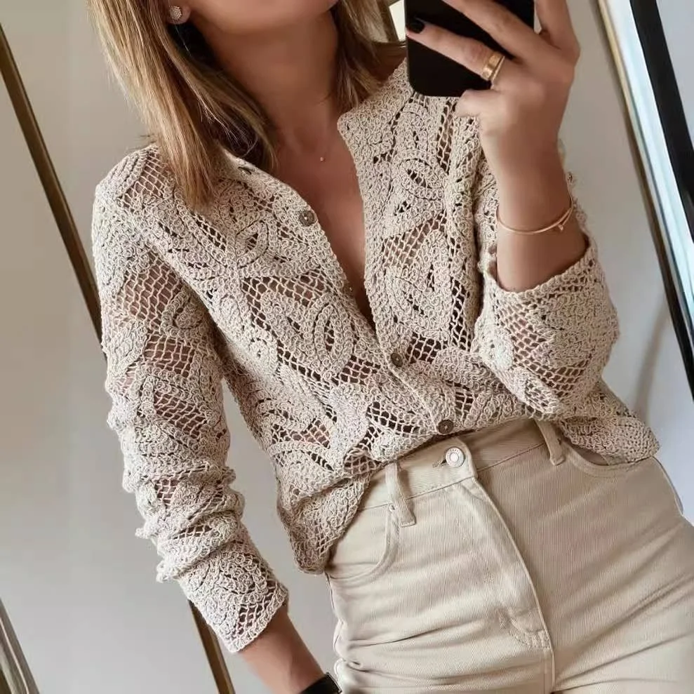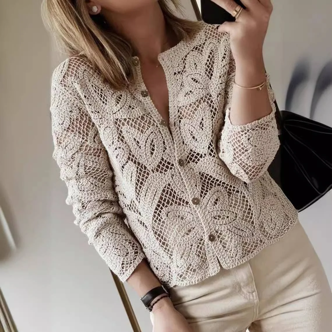 All Items › Knitted Long Sleeve Cardigan S Image 1 of 4 Image 2 of 4 Image 3 of 4 Image 4 of 4 Knitted Long Sleeve Cardigan S $69.00 sold out Women's Knitted Long Sleeve Blouse Sheer Openwork Button Shirt,Lightweight Cover-Up Cardigan Get notified by email when this product is in stock. Sold Out Added! Women's Knitted Long Sleeve Blouse Sheer Openwork Button Shirt,Lightweight Cover-Up Cardigan