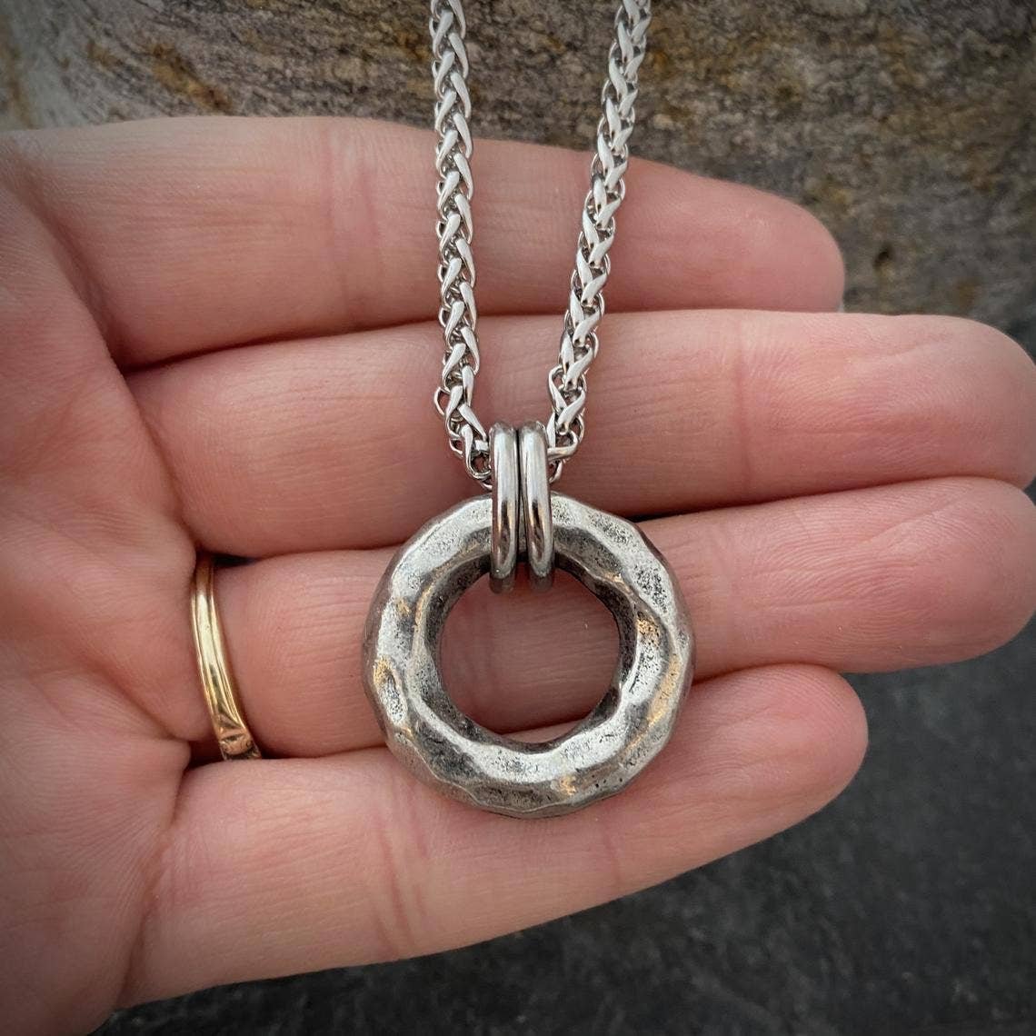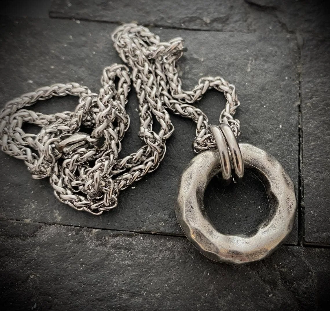 Large Hammered Ring Men's Necklace, Heavy Pewter Ring: 24