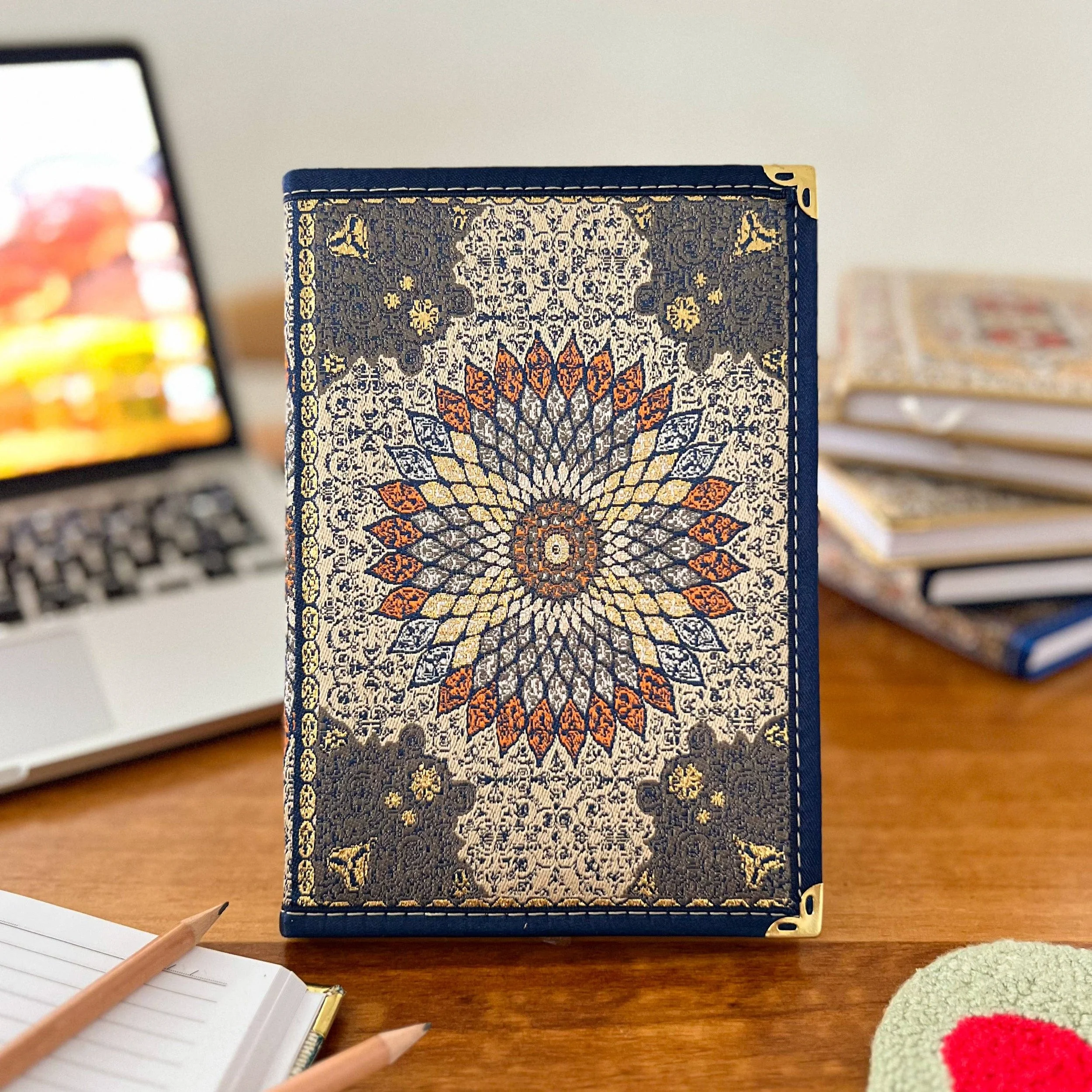 Our bohemian fabric notebooks are perfect for Diaries, Journals and a perfect companion for your work and meetings or school or even travels. Each boho notebook is filled with lined pages and has hardcover with Turkish carpet pattern designed brocade fabric on the top with a gold, glittery look and soft and luxurious touch.