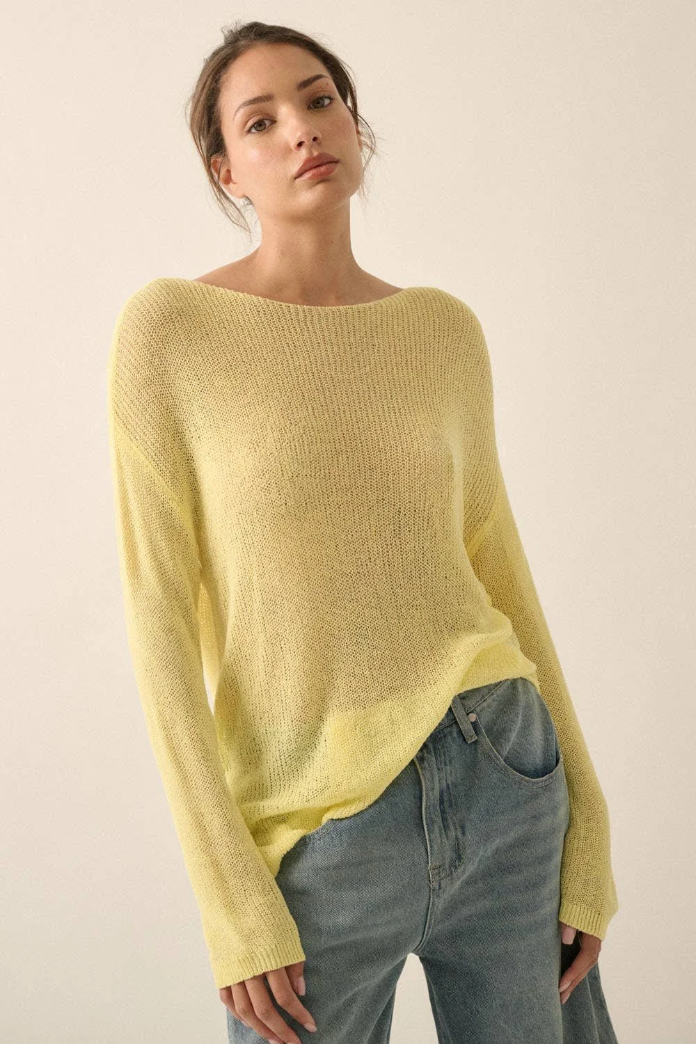 All Items › Lightweight Knit SP M Image 1 of 5 Image 2 of 5 Image 3 of 5 Image 4 of 5 Image 5 of 5 Lightweight Knit SP M $49.00 sold out A solid lightweight knit sweater with the following features:Boat neckline.Long sleeves.Dropped shoulder.Side slit.Loose fit.Unlined. Model Info:Height: 5 ft 9.5 in | Bust: 31 in | Waist: 23 in | Hips: 33 in | Wearing Size S. Get notified by email when this product is in stock. Sold Out Added! A solid lightweight knit sweater with the following features:Boat neckline.Long sleeves.Dropped shoulder.Side slit.Loose fit.Unlined. Model Info:Height: 5 ft 9.5 in | Bust: 31 in | Waist: 23 in | Hips: 33 in | Wearing Size S.