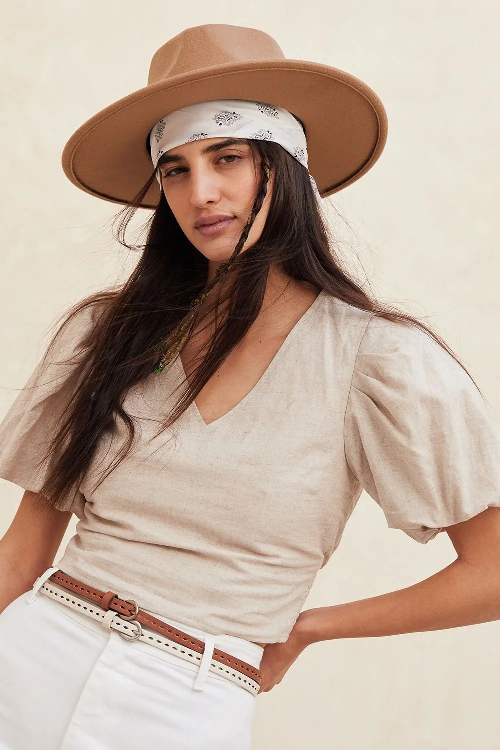 A solid, woven peasant top with the following features: Wide v neck. Short balloon sleeves. Smocked elastic back waist. Fitted silhouette. Cropped length.