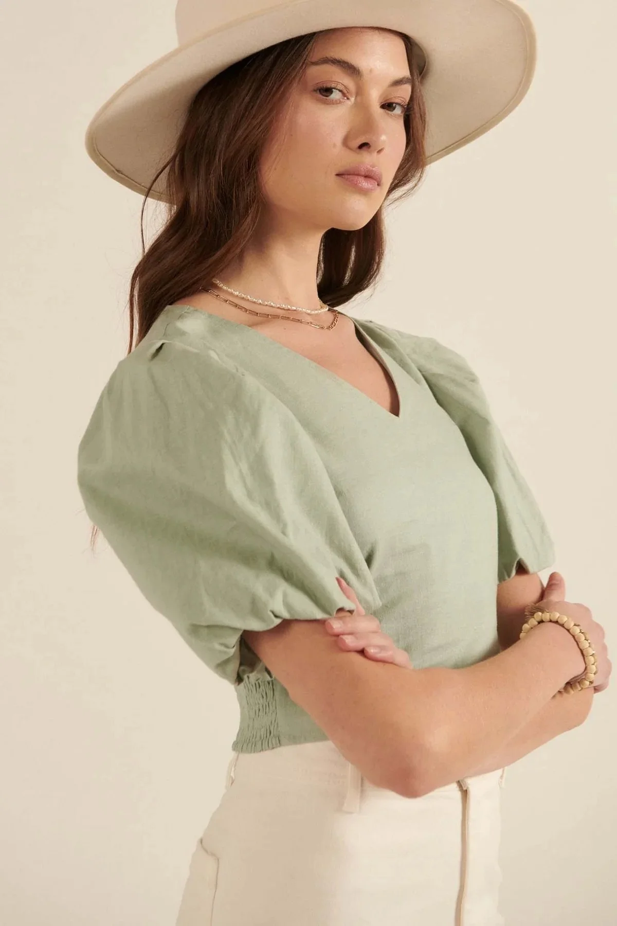 All Items › Like a Queen Puff-Sleeve V-Neck Blouse Seagrass Image 1 of 1 Like a Queen Puff-Sleeve V-Neck Blouse Seagrass $60.00 Solid, linen-blend top.Short balloon sleeves.V necklineSmocked elastic-back hem.Fitted silhouette.Cropped length.55% Linen, 45% Rayon. Like a Queen Puff-Sleeve V-Neck Blouse Seagrass: Small Medium Large Get notified by email when this product is in stock. Quantity: Add To Cart Added! Solid, linen-blend top.Short balloon sleeves.V necklineSmocked elastic-back hem.Fitted silhouette.Cropped length.55% Linen, 45% Rayon.
