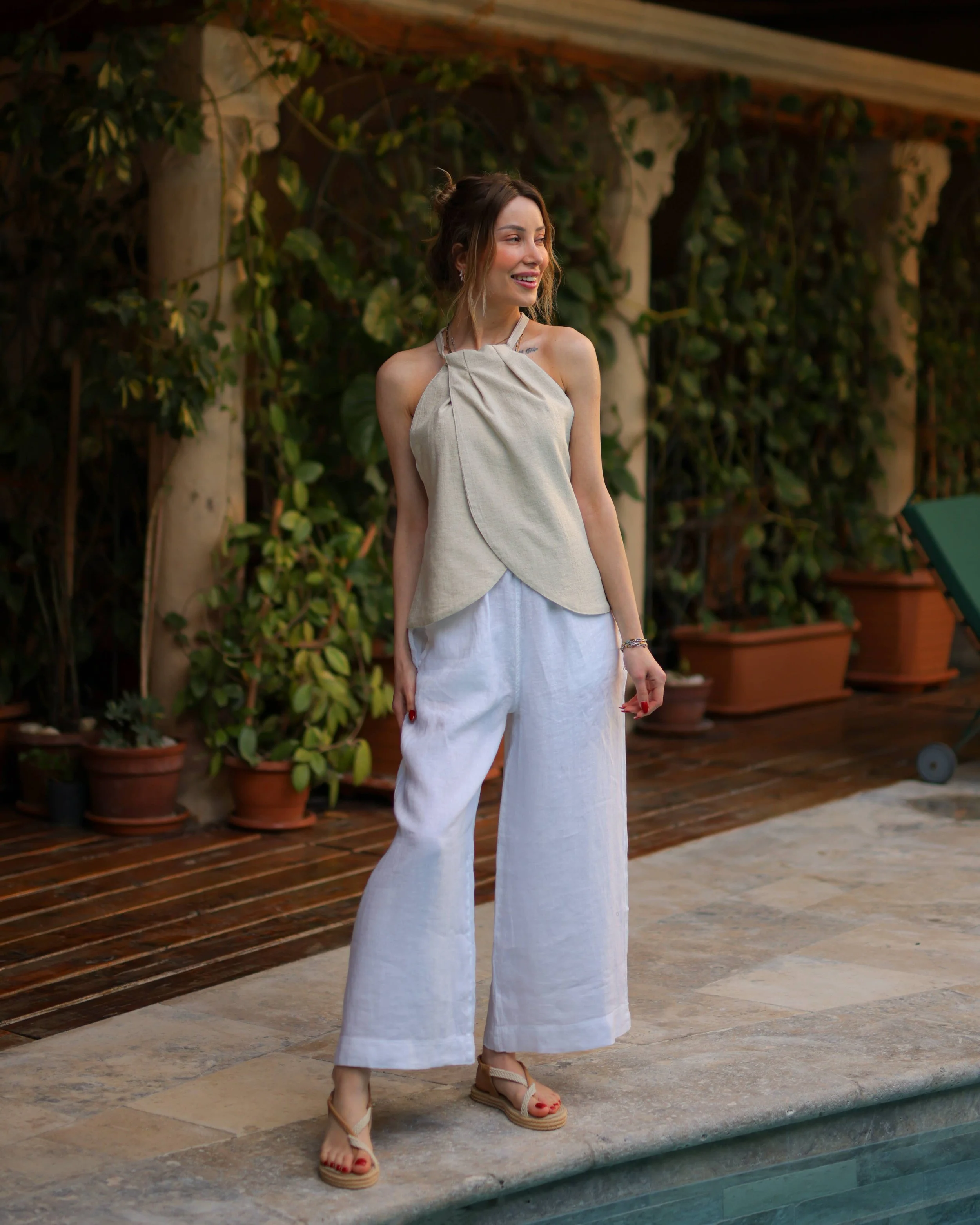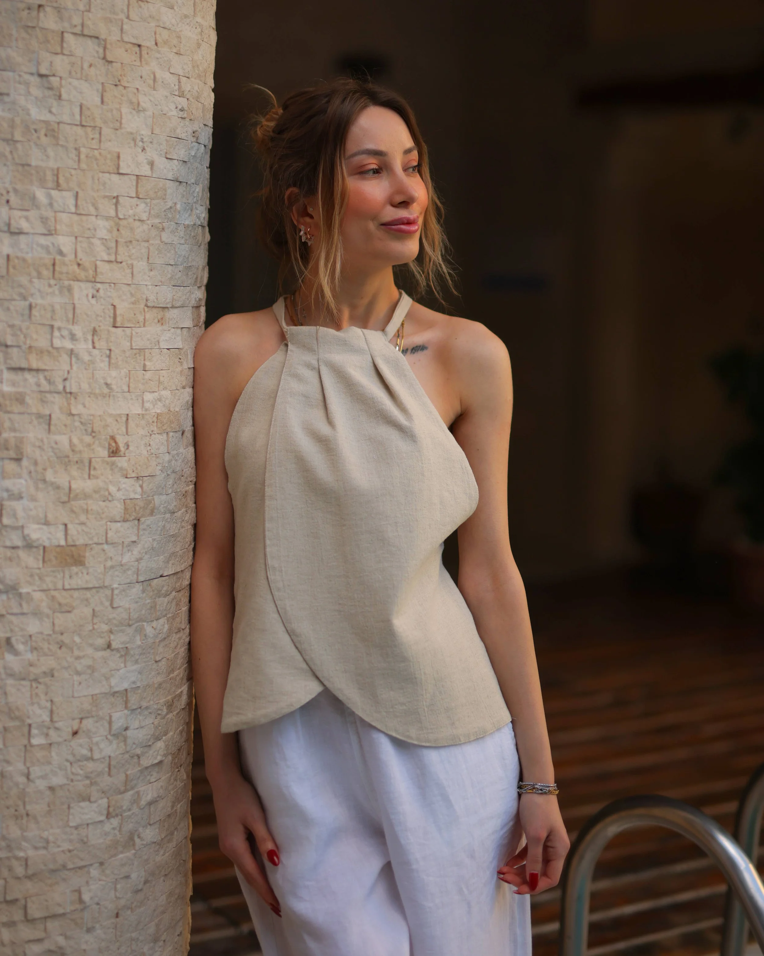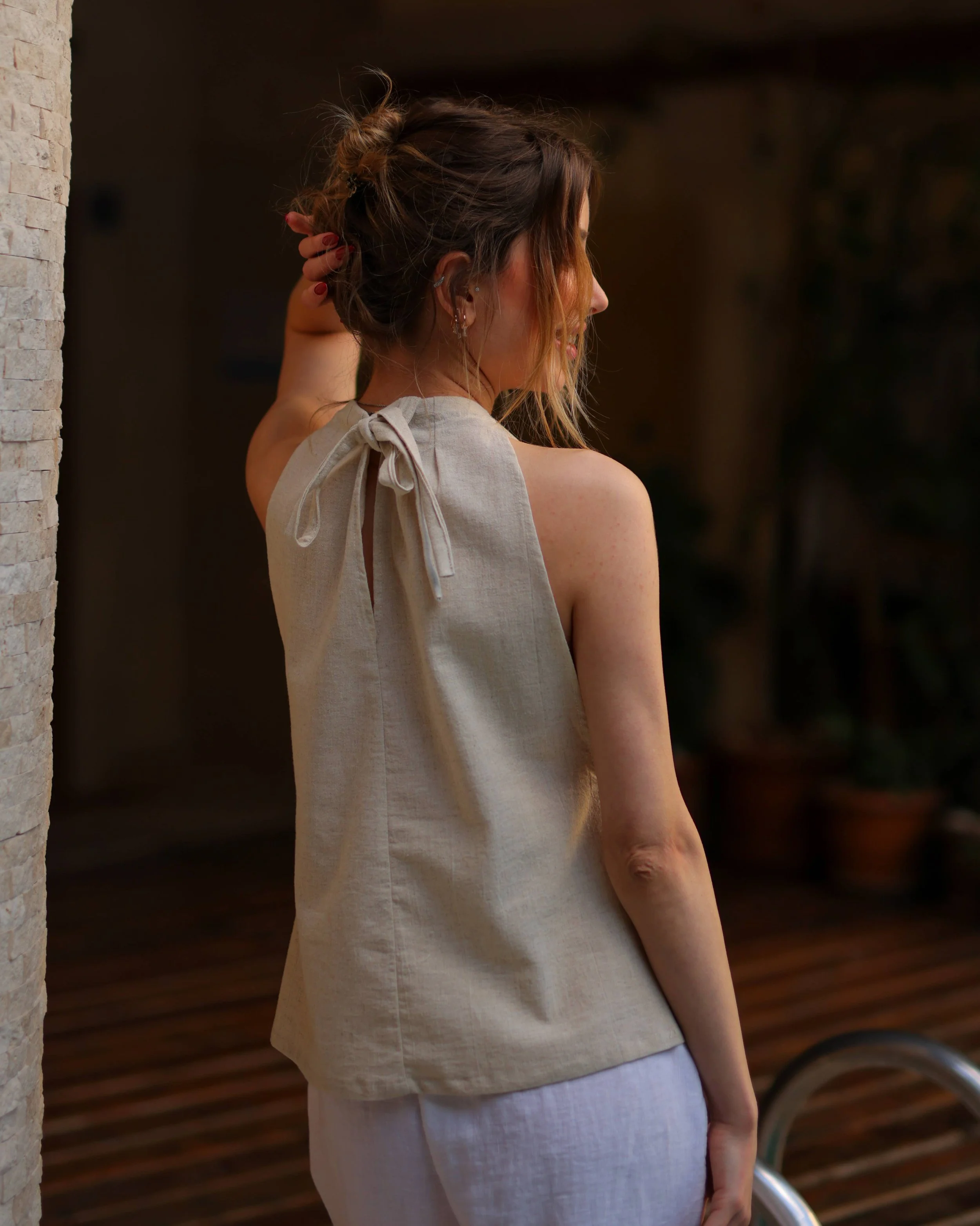 This linen halter top combines the lightweight and breathable qualities of 100% linen with a stylish and comfortable design, perfect for any weather.