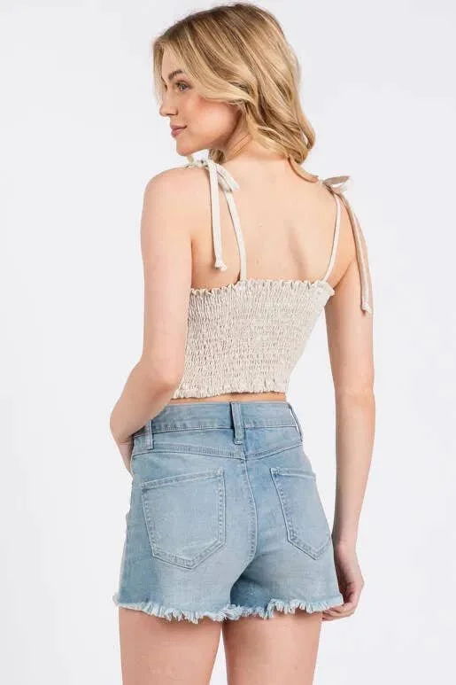 All Items › Linen Shoulder Tie Crop Cami Top:Oatmeal, M Image 1 of 5 Image 2 of 5 Image 3 of 5 Image 4 of 5 Image 5 of 5 Linen Shoulder Tie Crop Cami Top:Oatmeal, M $49.00 sold out Linen shoulder tie and back smocked detail crop cami top. , matching bottom: ns80206 Get notified by email when this product is in stock. Sold Out Added! Linen shoulder tie and back smocked detail crop cami top. , matching bottom: ns80206