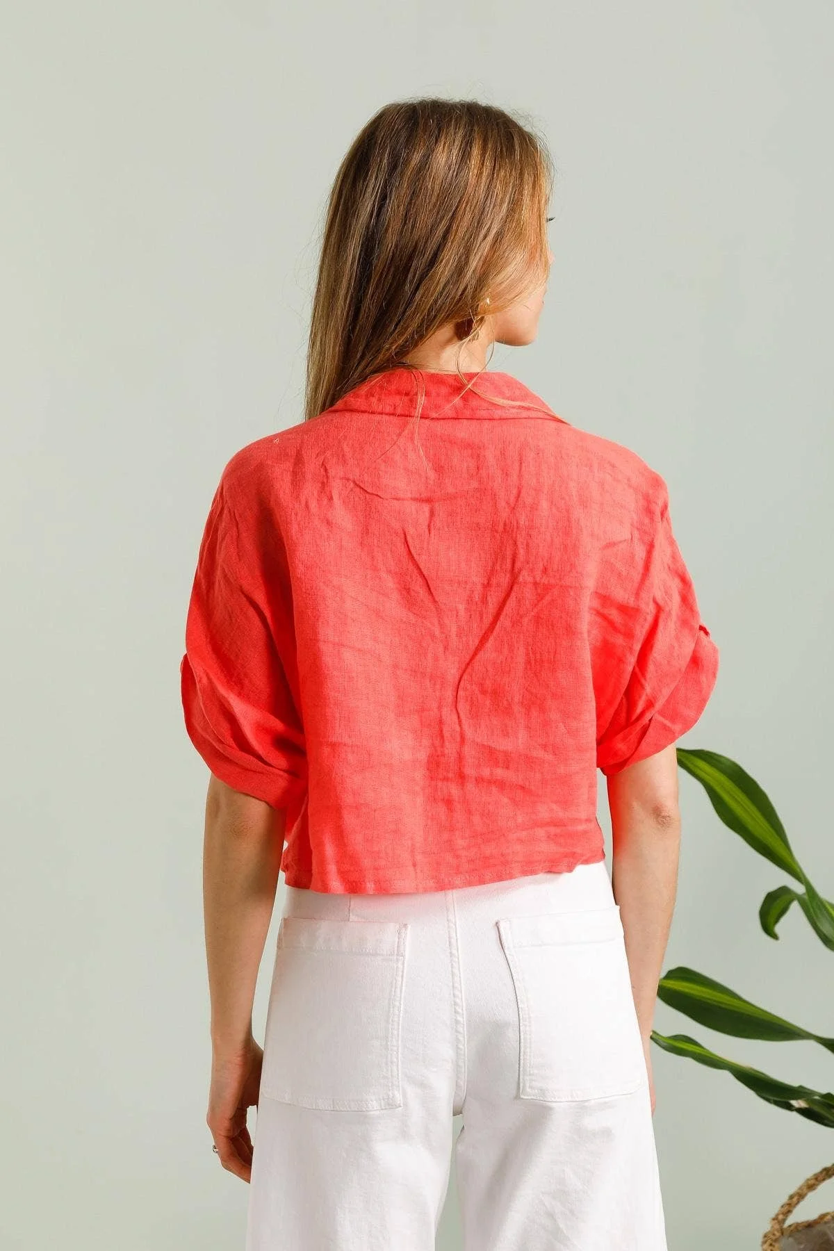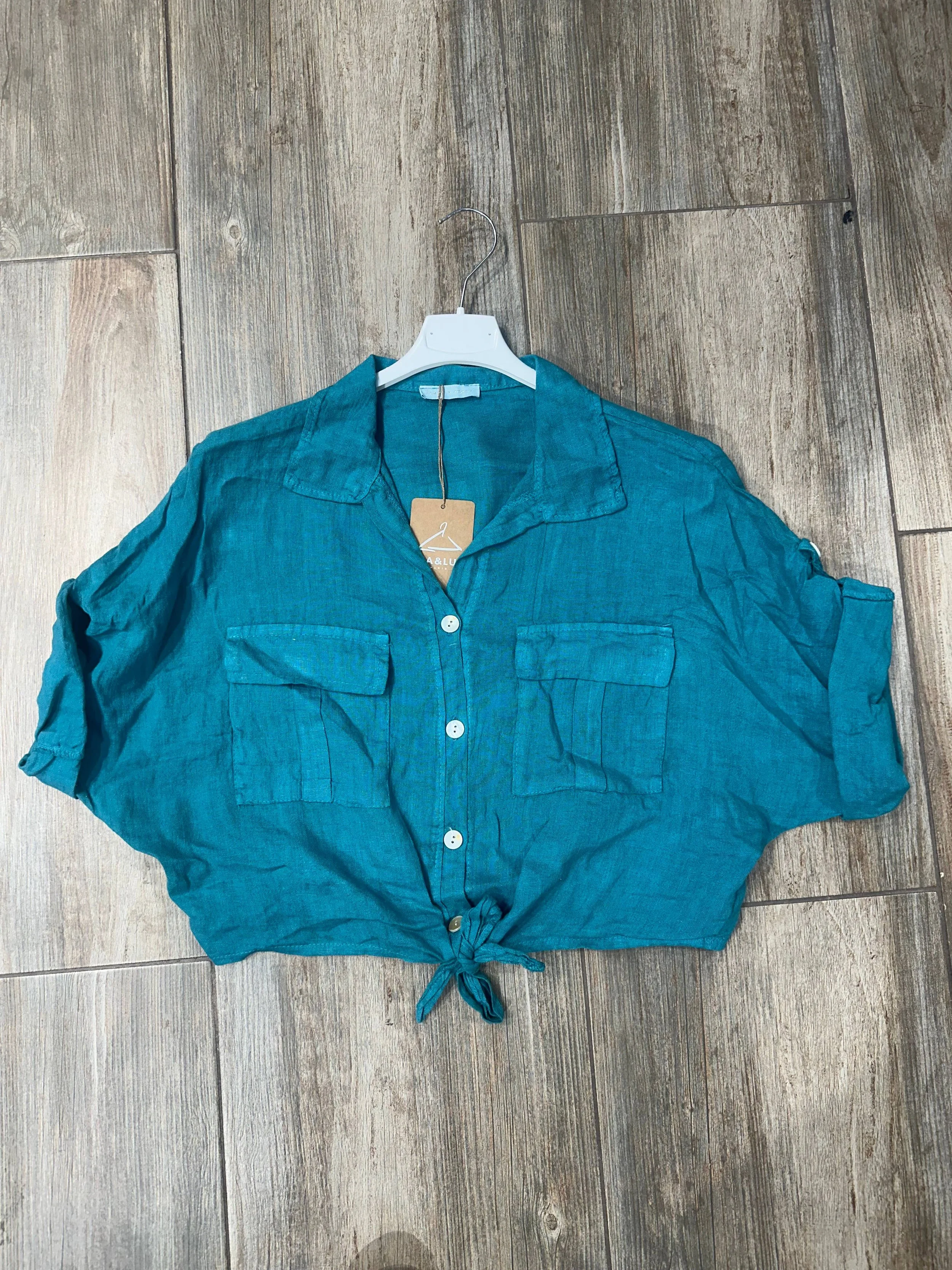 100% Linen shirt with a classic collar, a button placket with white buttons, and two large patch pockets at the front. The bottom is tied at the waist, giving a casual and stylish touch. The sleeves are wide, with an oversized cut, and they can be rolled up with a button and a tab. Made in Italy