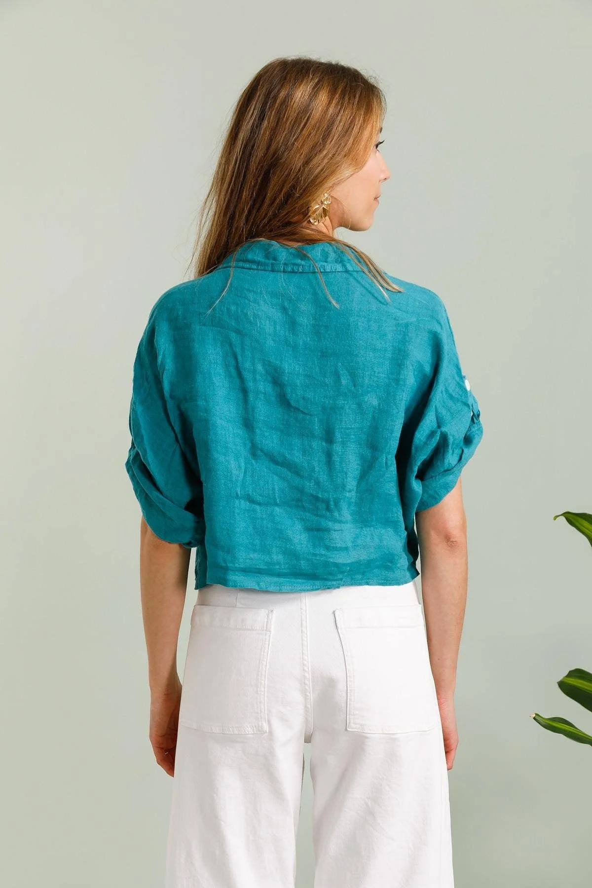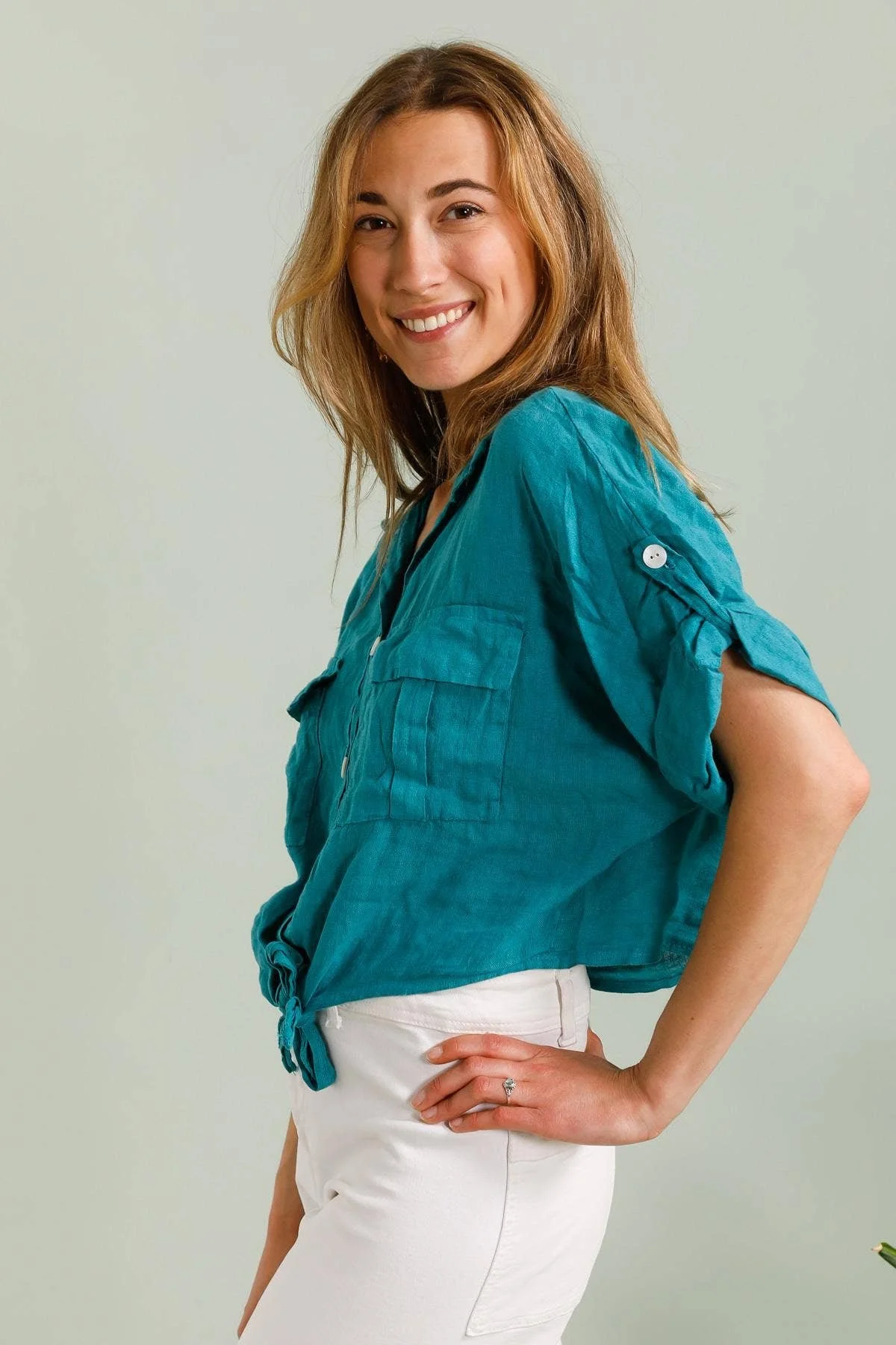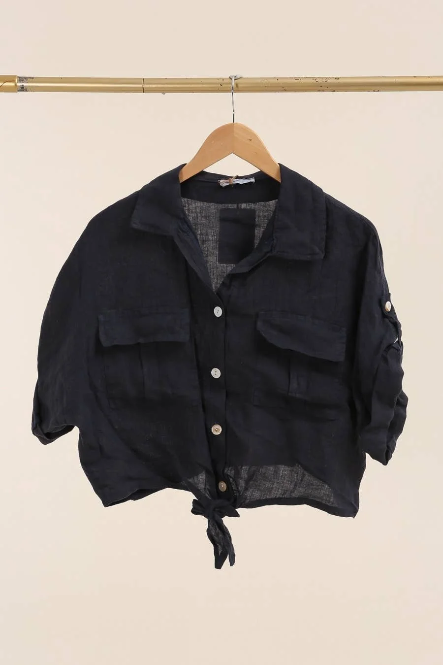Linen shirt with a classic collar, a button placket with white buttons, and two large patch pockets at the front. The bottom is tied at the waist, giving a casual and stylish touch. The sleeves are wide, with an oversized cut, and they can be rolled up with a button and a tab.