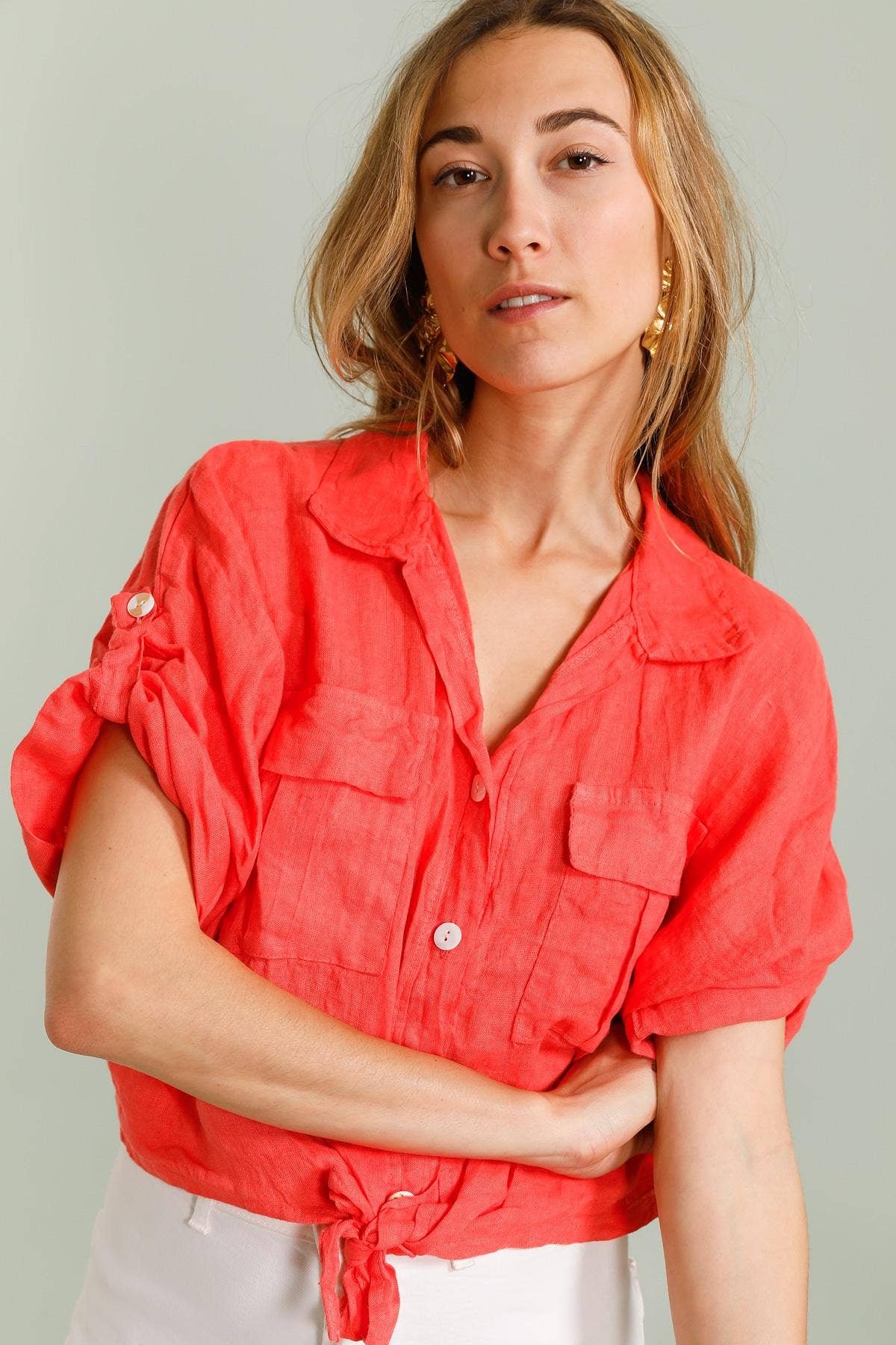 Linen shirt with a classic collar, a button placket with white buttons, and two large patch pockets at the front. The bottom is tied at the waist, giving a casual and stylish touch. The sleeves are wide, with an oversized cut, and they can be rolled up with a button and a tab.