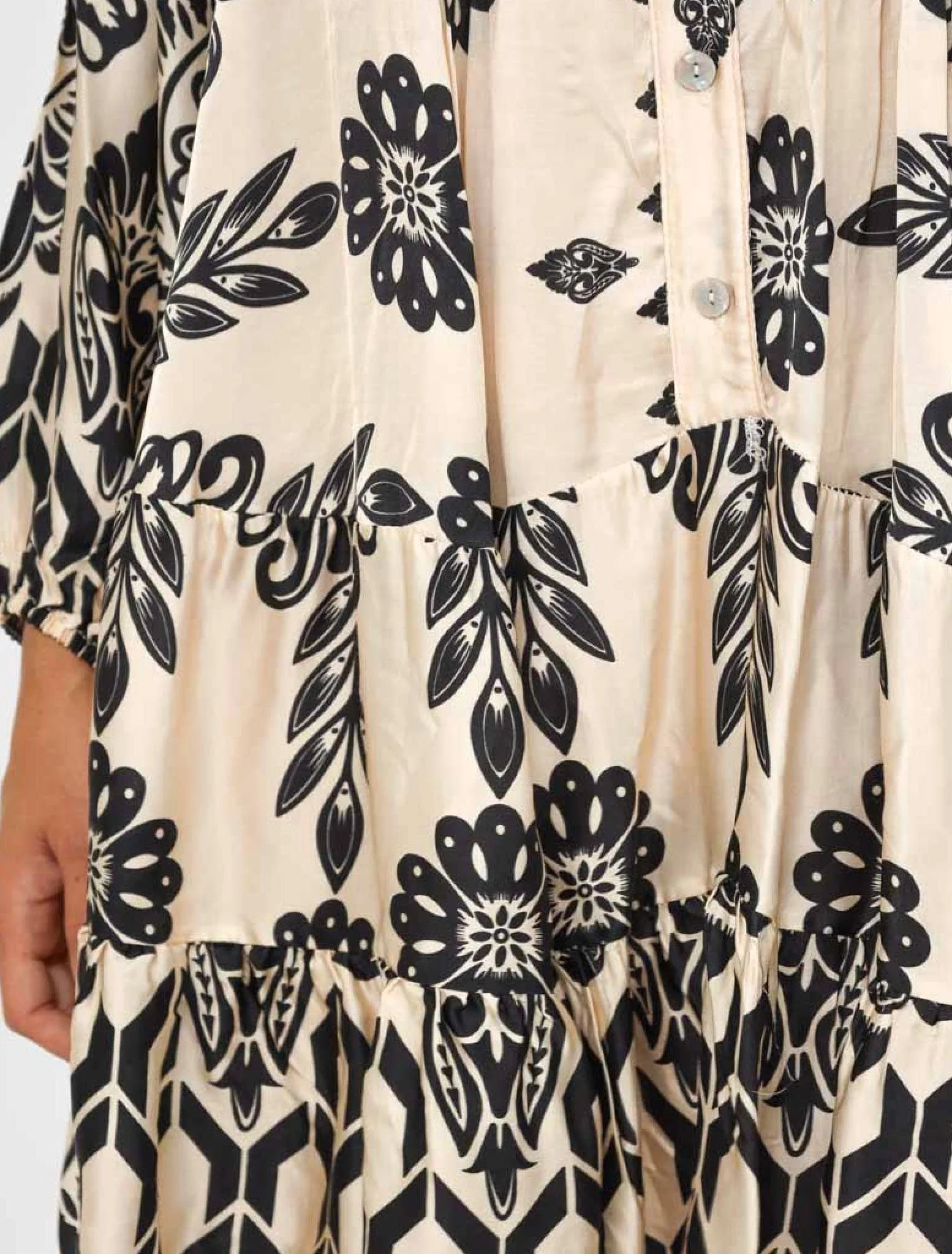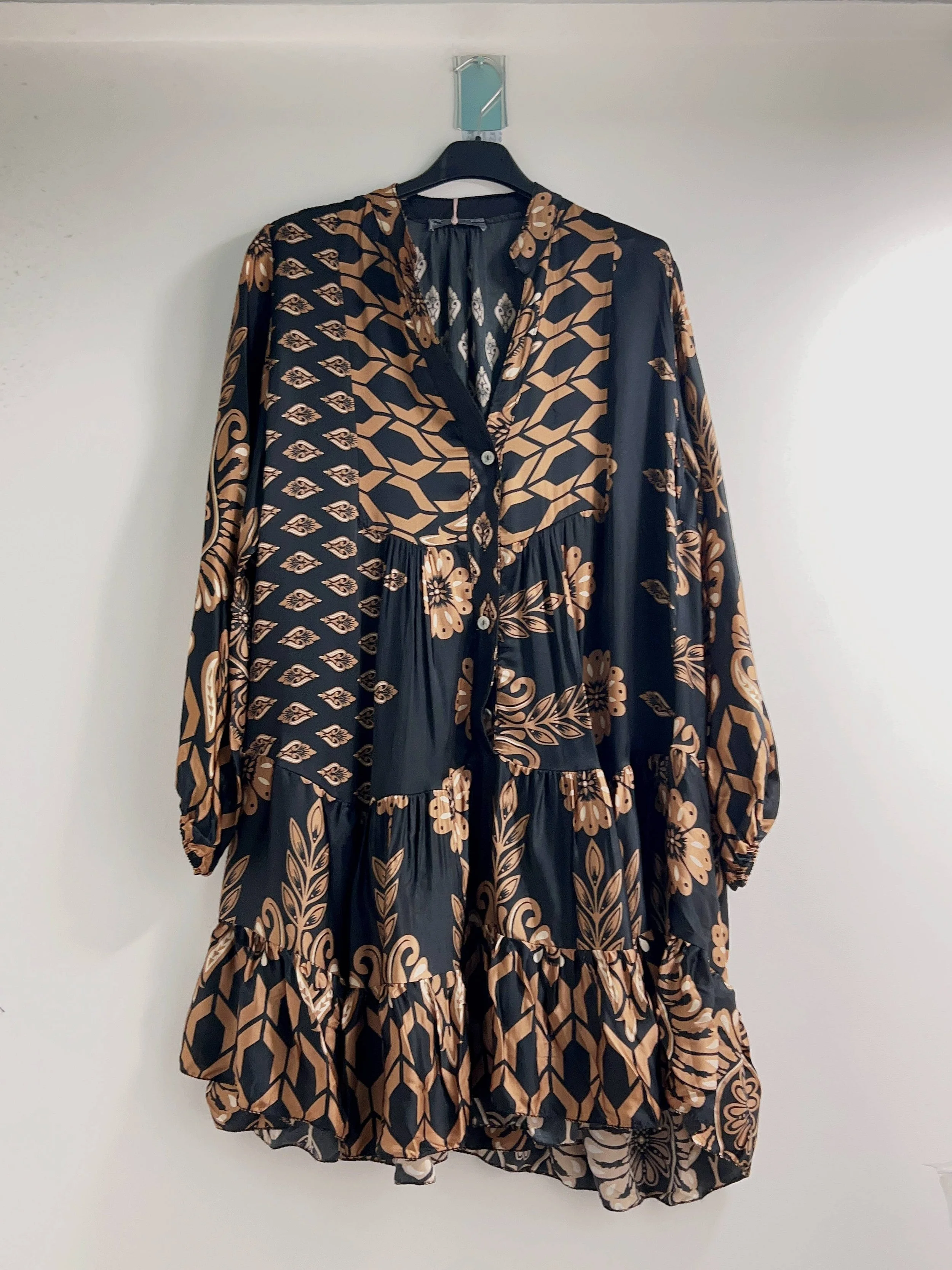 All Items › Long sleeve printed silk mini dress: Black, One size Image 1 of 5 Image 2 of 5 Image 3 of 5 Image 4 of 5 Image 5 of 5 Long sleeve printed silk mini dress: Black, One size $79.00 sold out Short printed dress with 3/4 sleeves and ruffles. One size 38-44 (M-XXL). Get notified by email when this product is in stock. Sold Out Added! Short printed dress with 3/4 sleeves and ruffles. One size 38-44 (M-XXL).