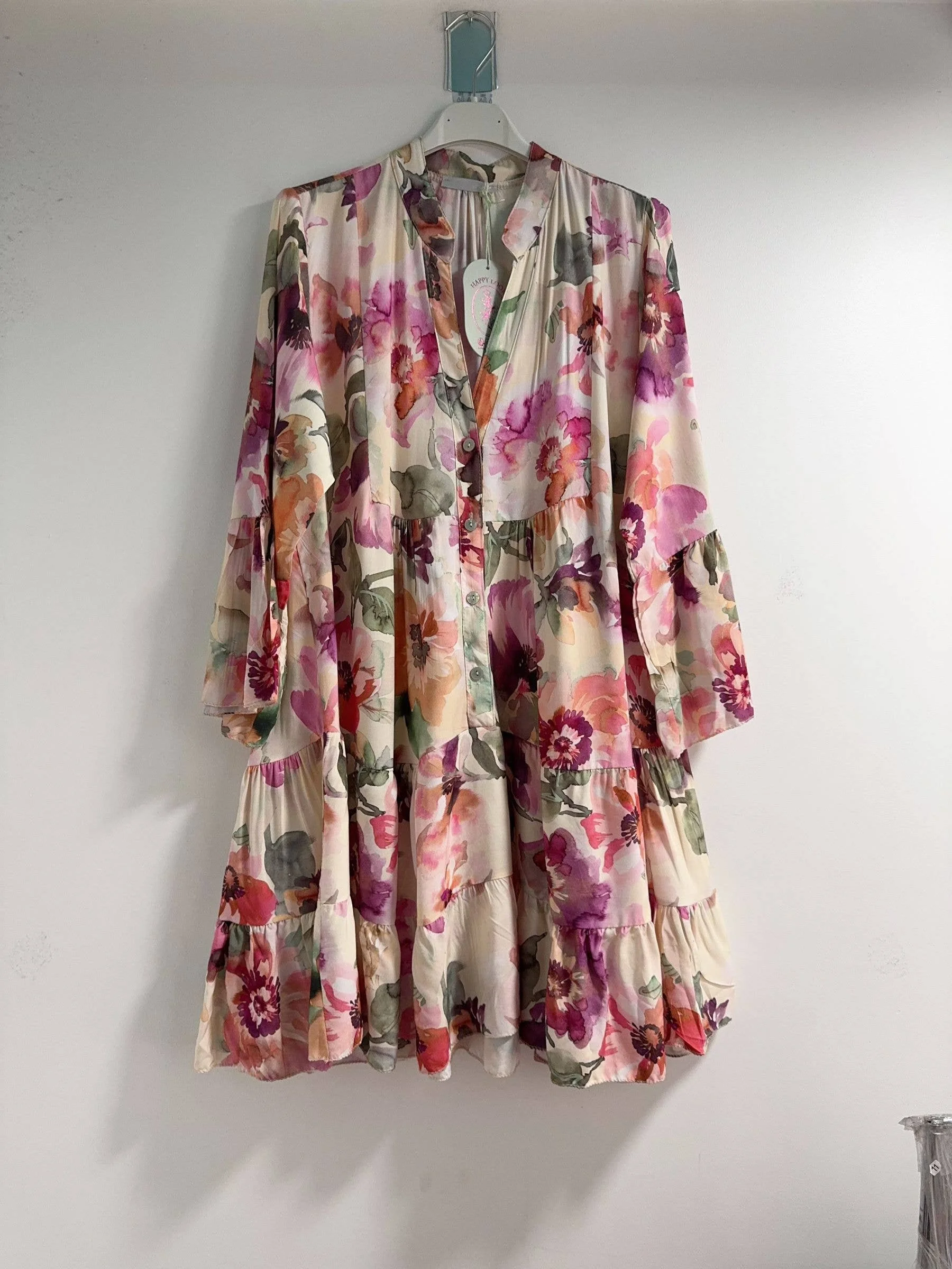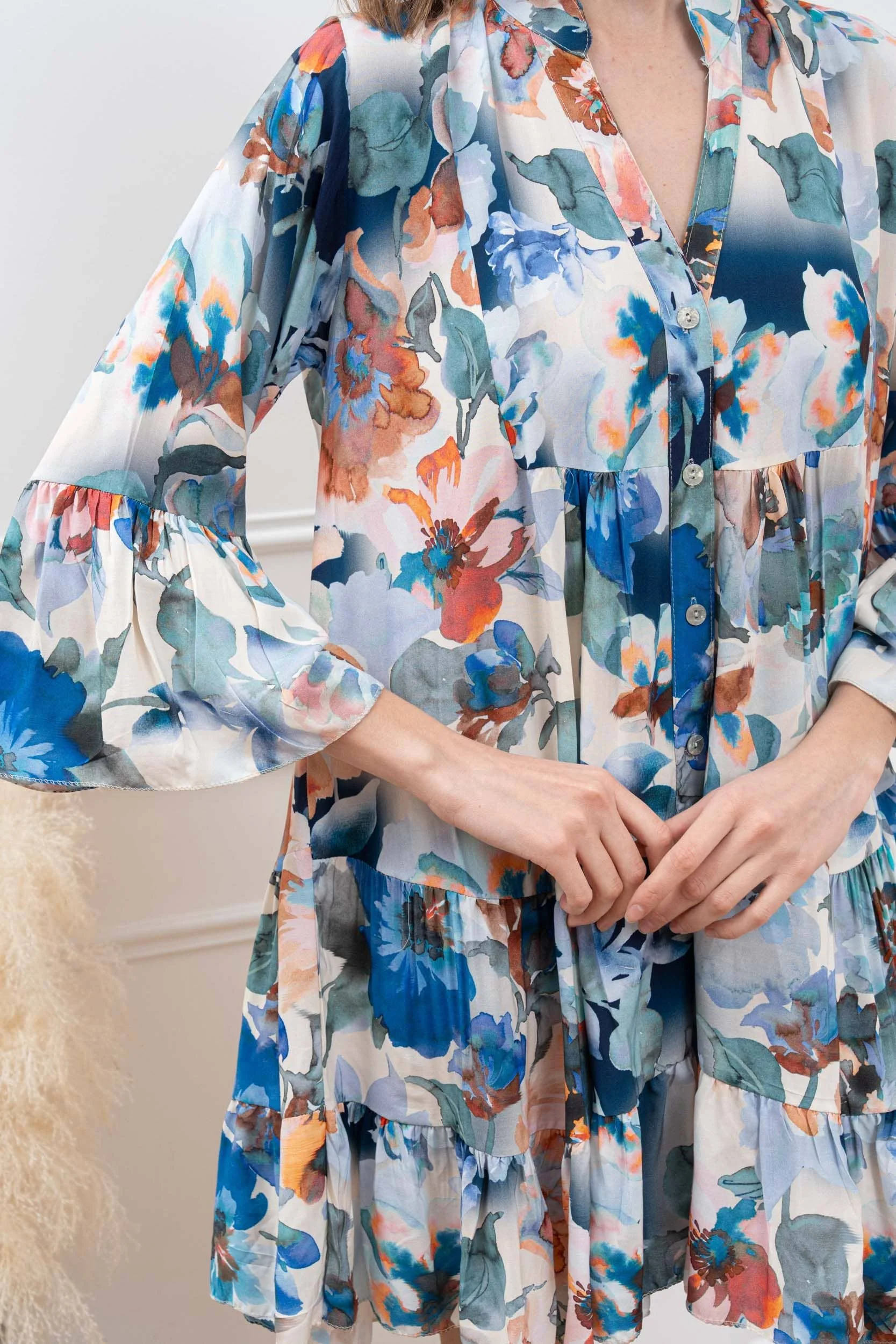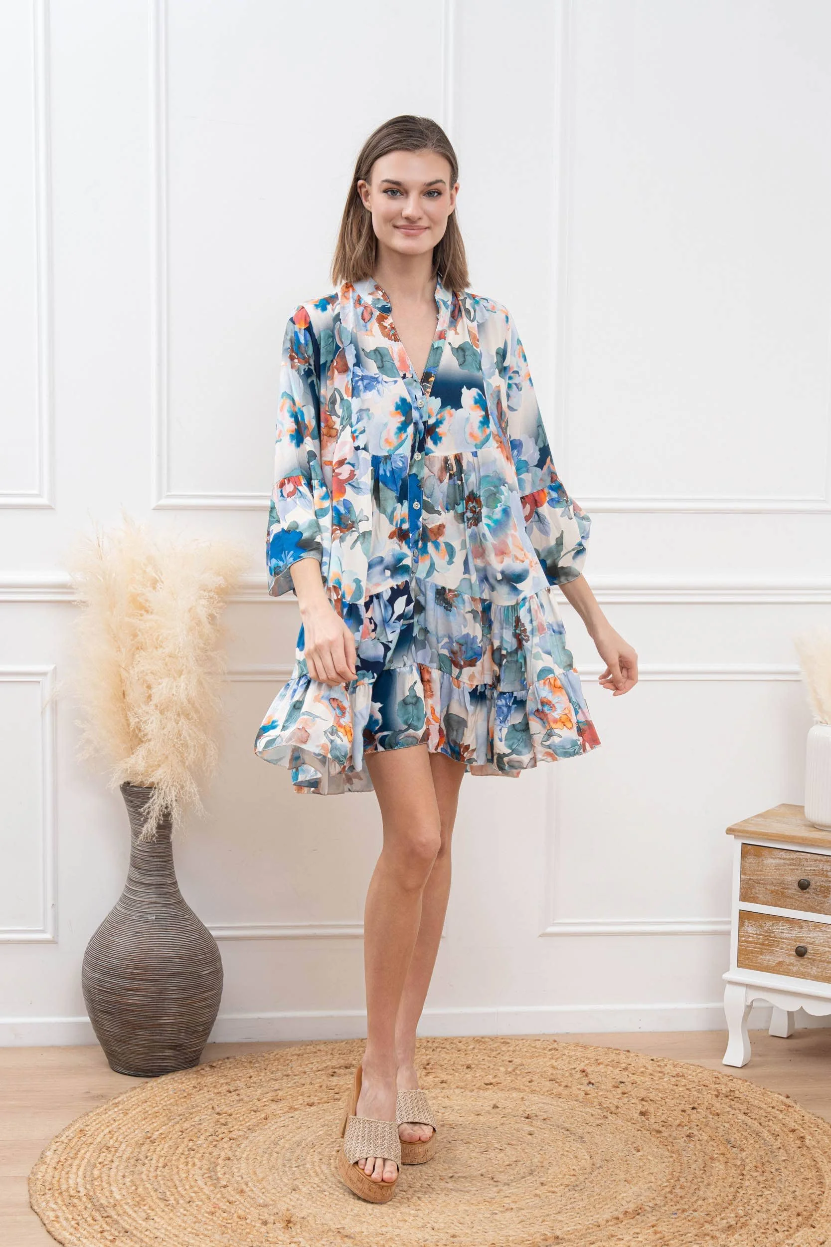 Material: Lightweight and flowing fabric, ideal for hot days. Soft to the touch and pleasant to wear. Fit: Short and flared, with a subtle neckline that enhances the silhouette while remaining comfortable with 3/4 ruffled sleeves.