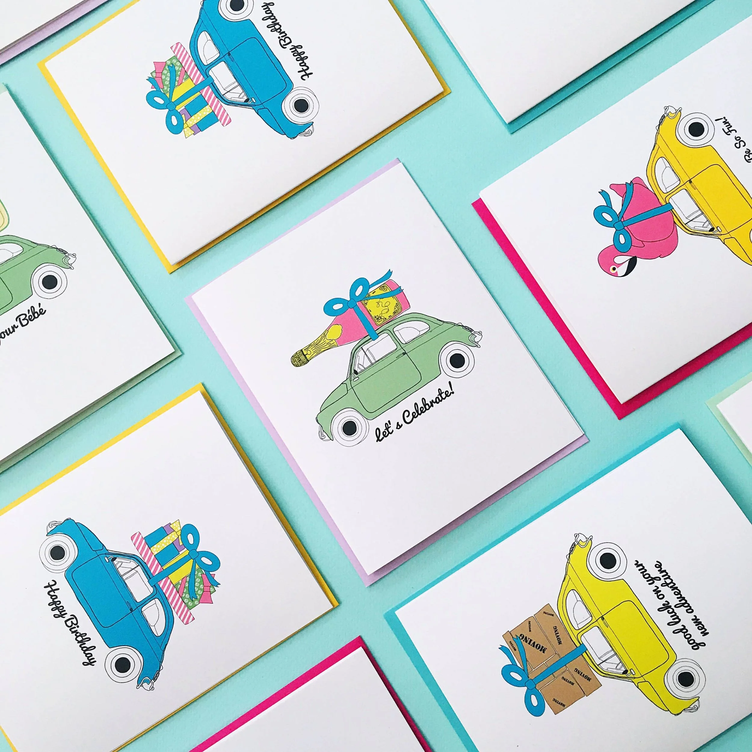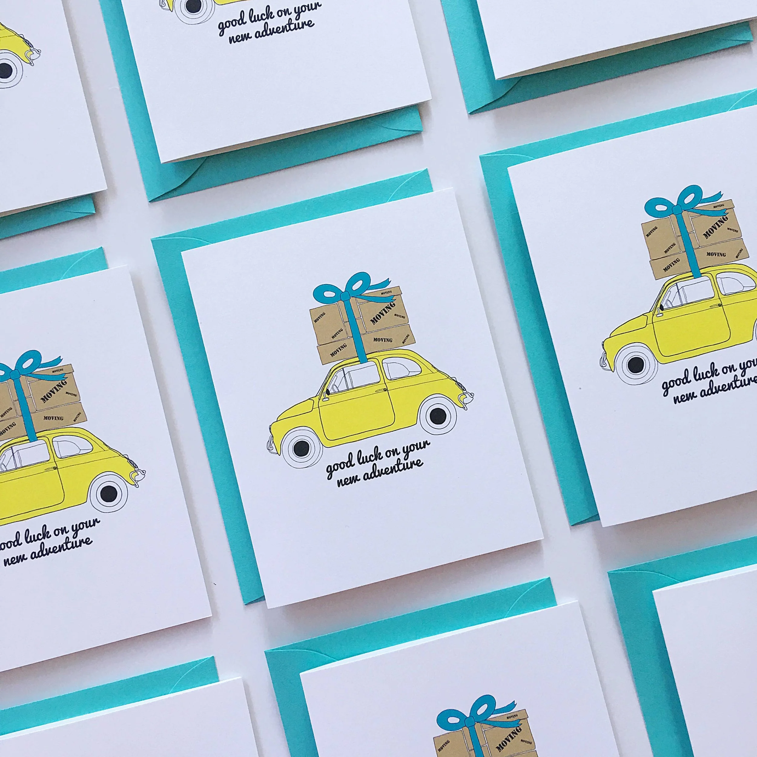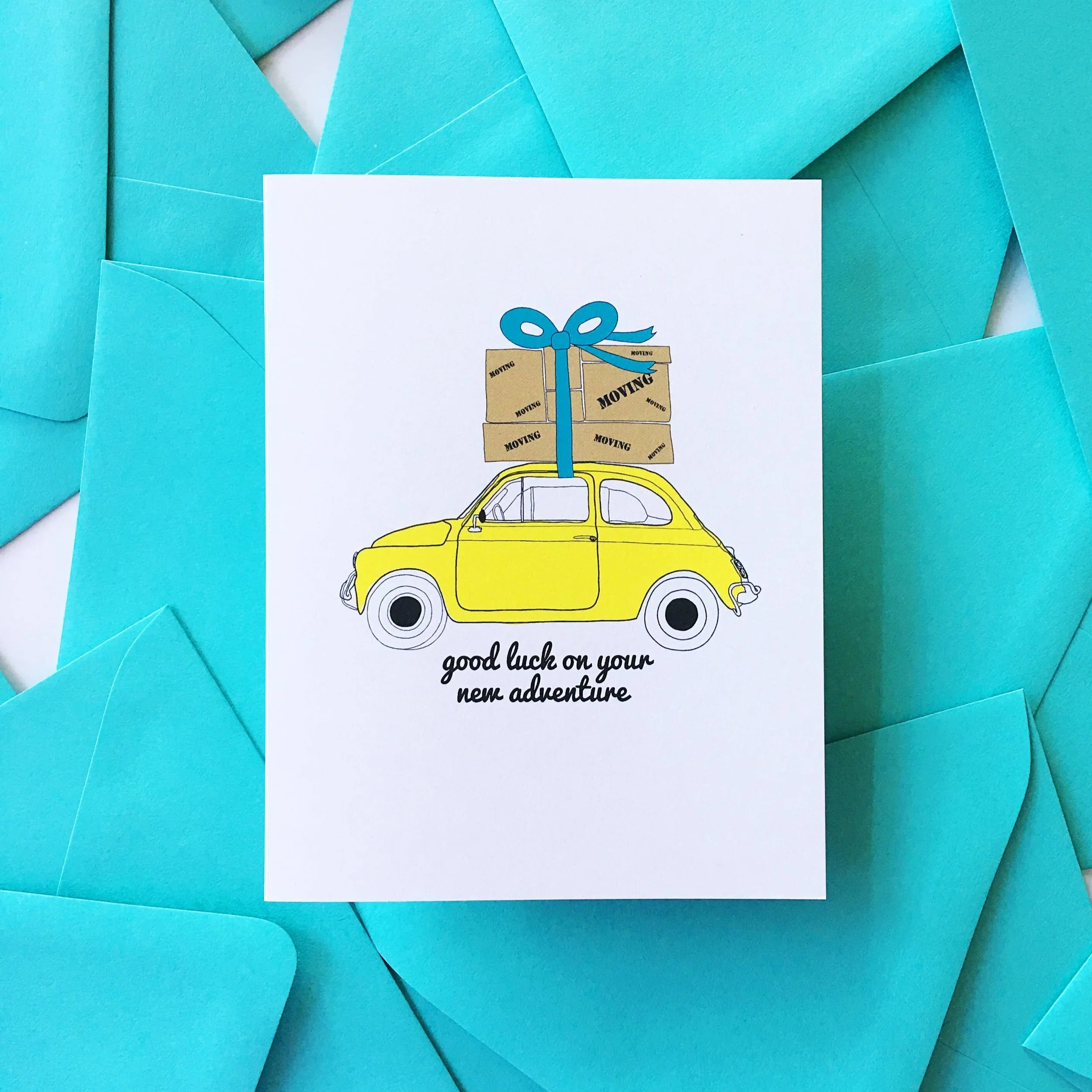 Moving boxes on top of a teeny Fiat is our way of adding humor to someone moving on to a new job, new home, new life ...
