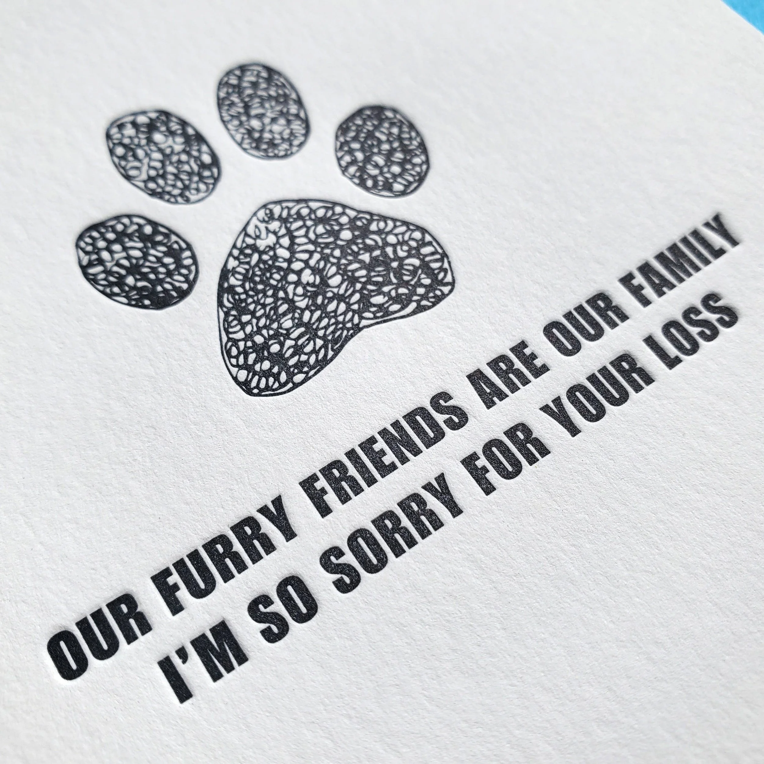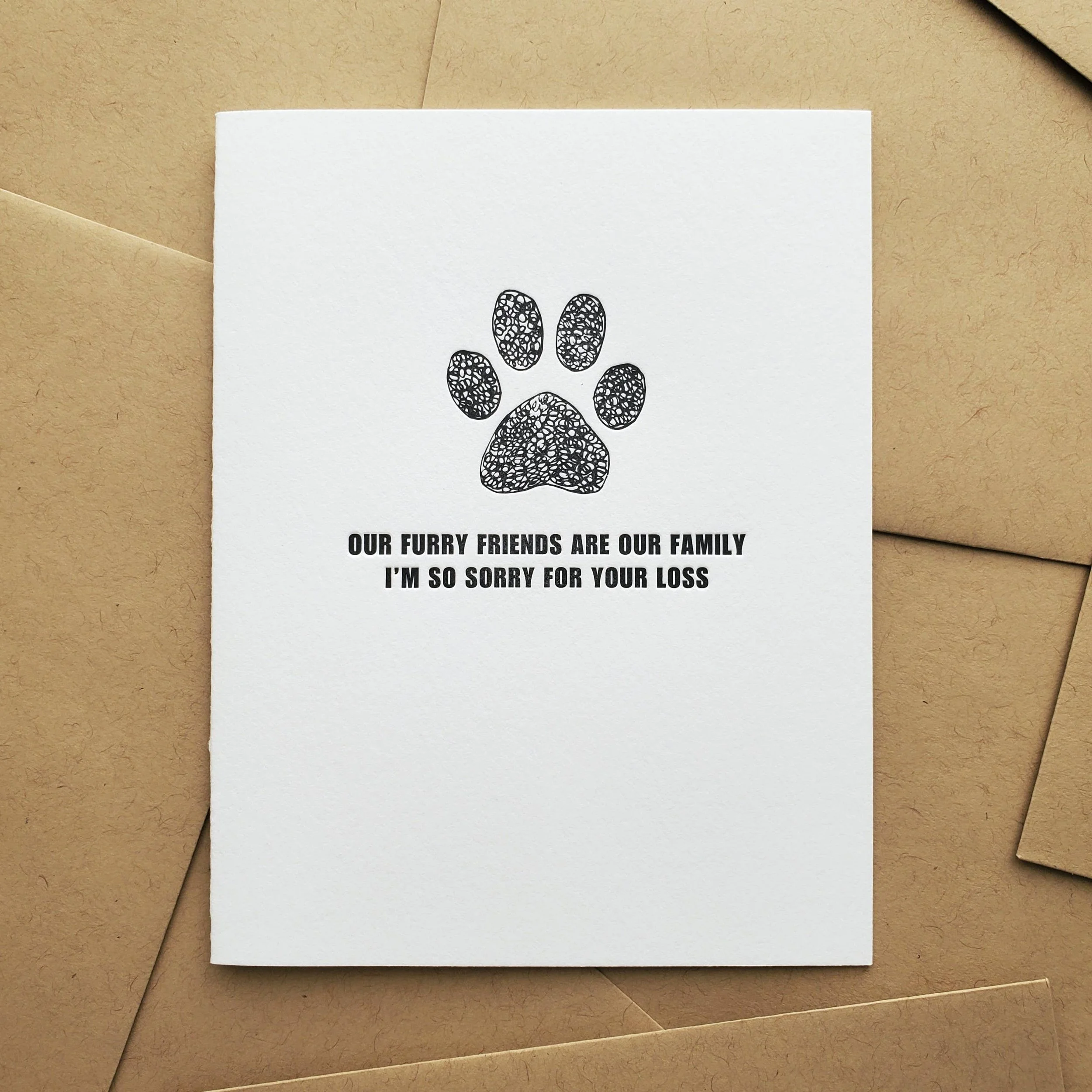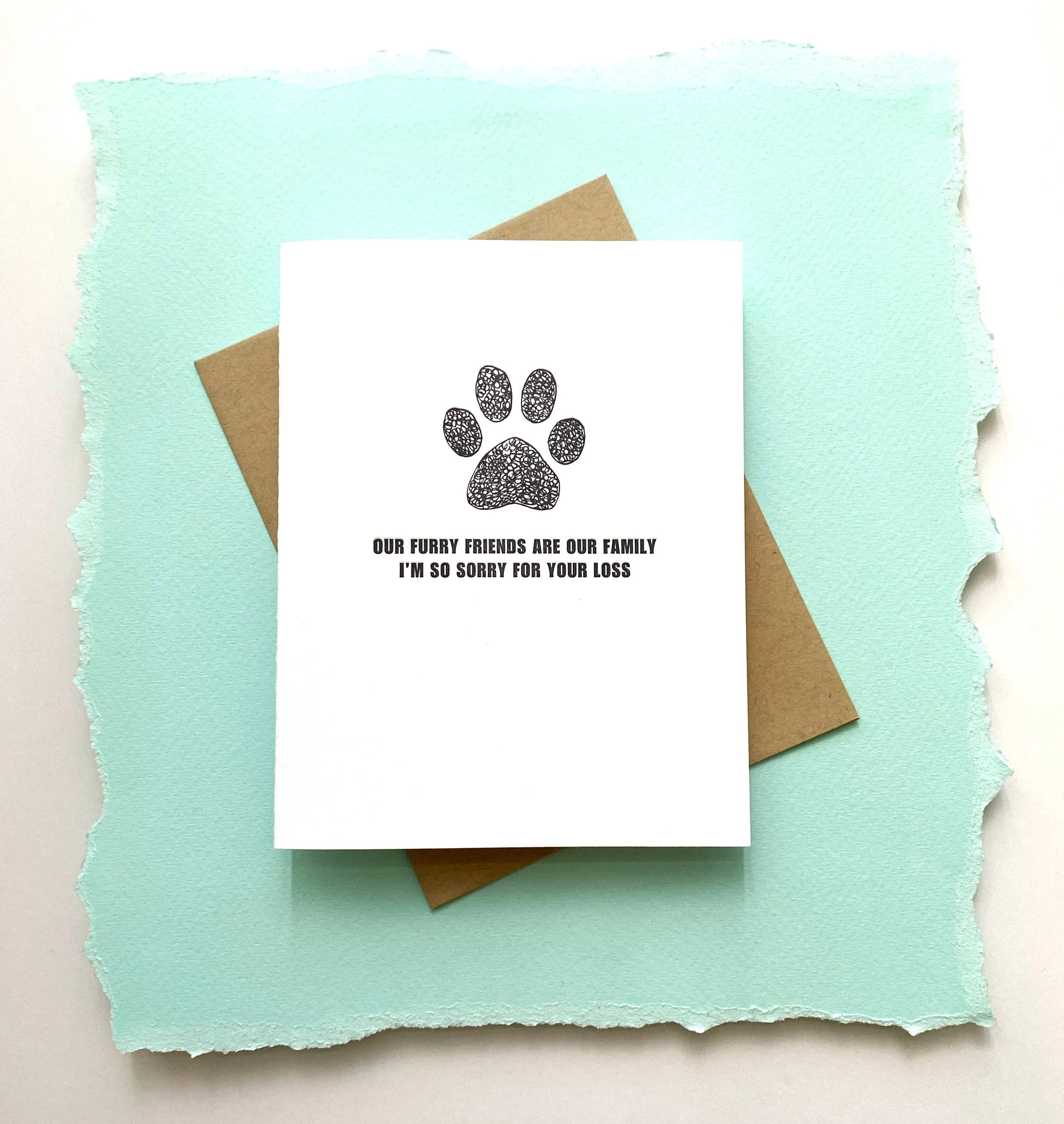 All Items › Pet Loss Image 1 of 3 Image 2 of 3 Image 3 of 3 Pet Loss $6.75 Limited Availability Our Furry Friends Are Our FamilyI'm So Sorry For Your LossLetterpressed on luxe cotton paper and paired with a recycled envelope.A2 size 4.25" x 5.5"blank insideLetterpressed by hand in our Long Beach, CA studiopet loss, pet bereavement, dog loss, cat loss Get notified by email when this product is in stock. Quantity: Add To Cart Added! Our Furry Friends Are Our FamilyI'm So Sorry For Your LossLetterpressed on luxe cotton paper and paired with a recycled envelope.A2 size 4.25" x 5.5"blank insideLetterpressed by hand in our Long Beach, CA studiopet loss, pet bereavement, dog loss, cat loss