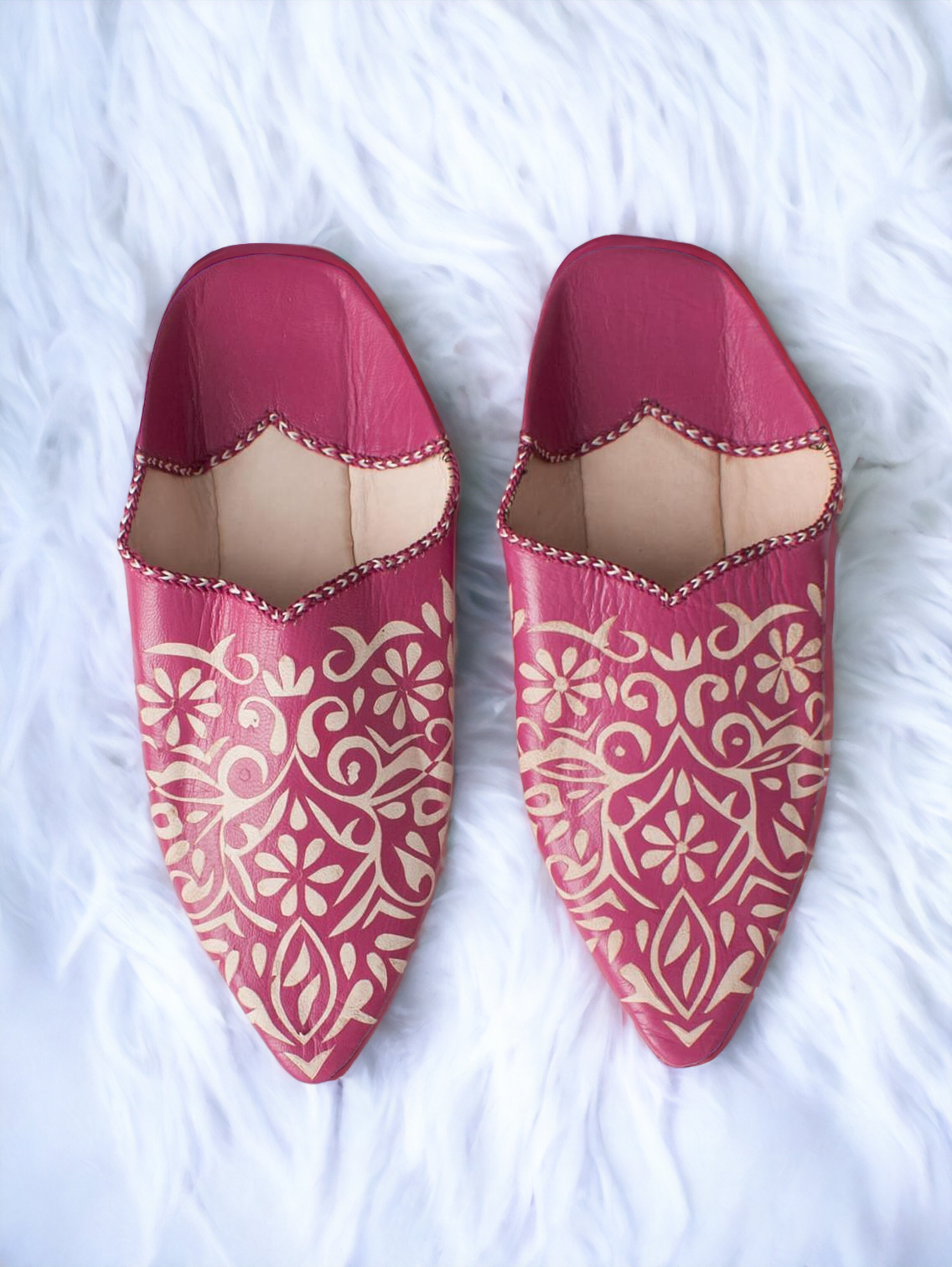 In Morocco slippers are called 'babouches', which are made of 100% moroccan leather at the bottom. We've used suede to give it that winter look. Moroccans love wearing their babouches everywhere in the house. These babouches are traditional in style and are more decorative.