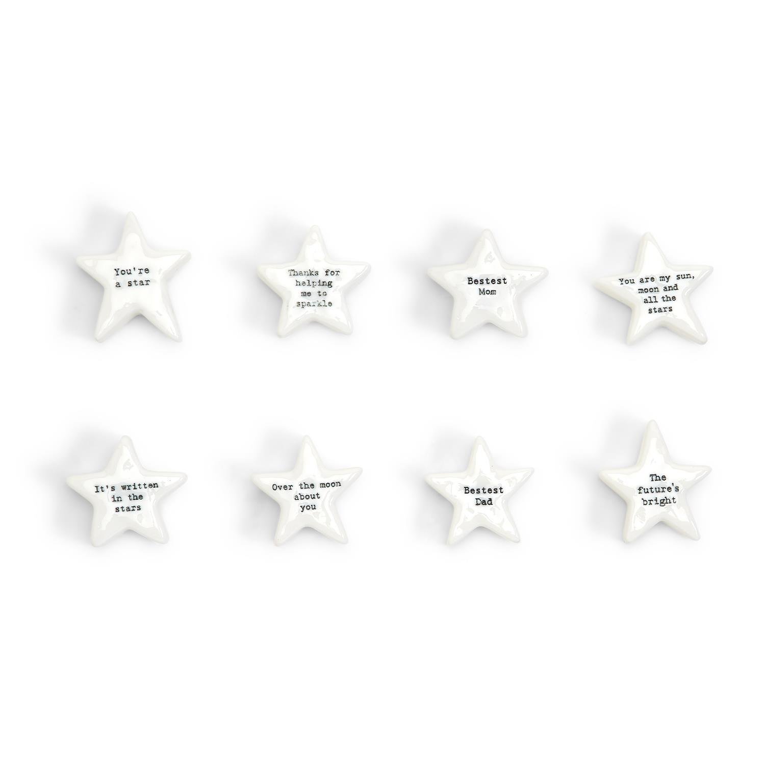 Everyone needs a few words or encouragement and reassurance sometimes. These miniature star pebbles are the best tokens of love to give to brighten up someone's day. Hand sculpted and carved porcelain Designed in the UK by East of India Includes 8 designs: my sun, moon & stars, you're a star, over the moon about you, it's written in the stars, futures bright, thanks for helping me sparkle, bestest dad, bestest mom Great way to say something with a small moment Dimensions: from 1 5/8" W x 5/8" D x 1 1/2" H to 1 5/8" W x 5/8" D x 2" H Weight: 2.25 lb