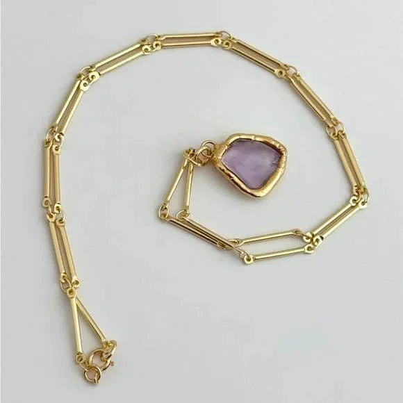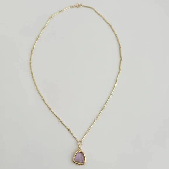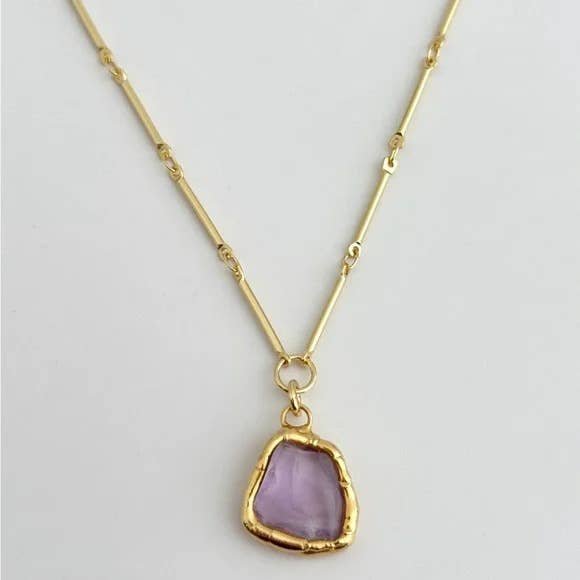 All Items › Purple Healing Necklace Image 1 of 5 Image 2 of 5 Image 3 of 5 Image 4 of 5 Image 5 of 5 Purple Healing Necklace $82.00 Limited Availability 18K Gold Filled Necklace featuring gold plated Amethyst pendentMeasures 18” longTramps+Thieves DesignMade in Los Angeles Get notified by email when this product is in stock. Add To Cart Added! 18K Gold Filled Necklace featuring gold plated Amethyst pendentMeasures 18” longTramps+Thieves DesignMade in Los Angeles