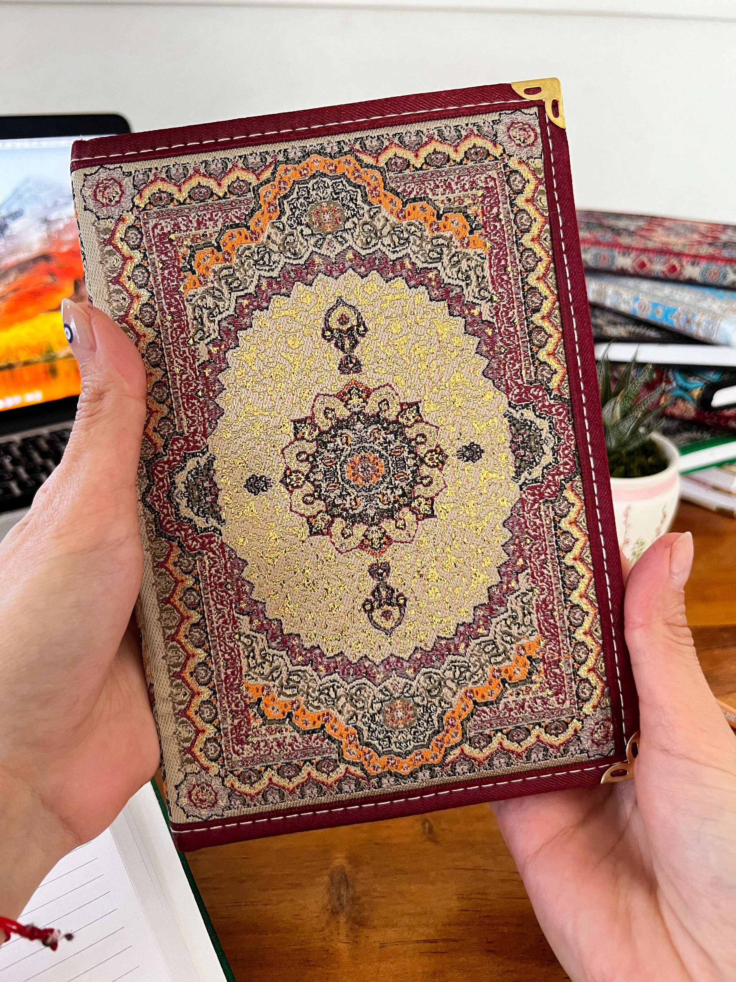 Our bohemian fabric notebooks are perfect for Diaries, Journals and a perfect companion for your work and meetings or school or even travels. Each boho notebook is filled with lined pages and has hardcover with Turkish carpet pattern designed brocade fabric on the top with a gold, glittery look and soft and luxurious touch.